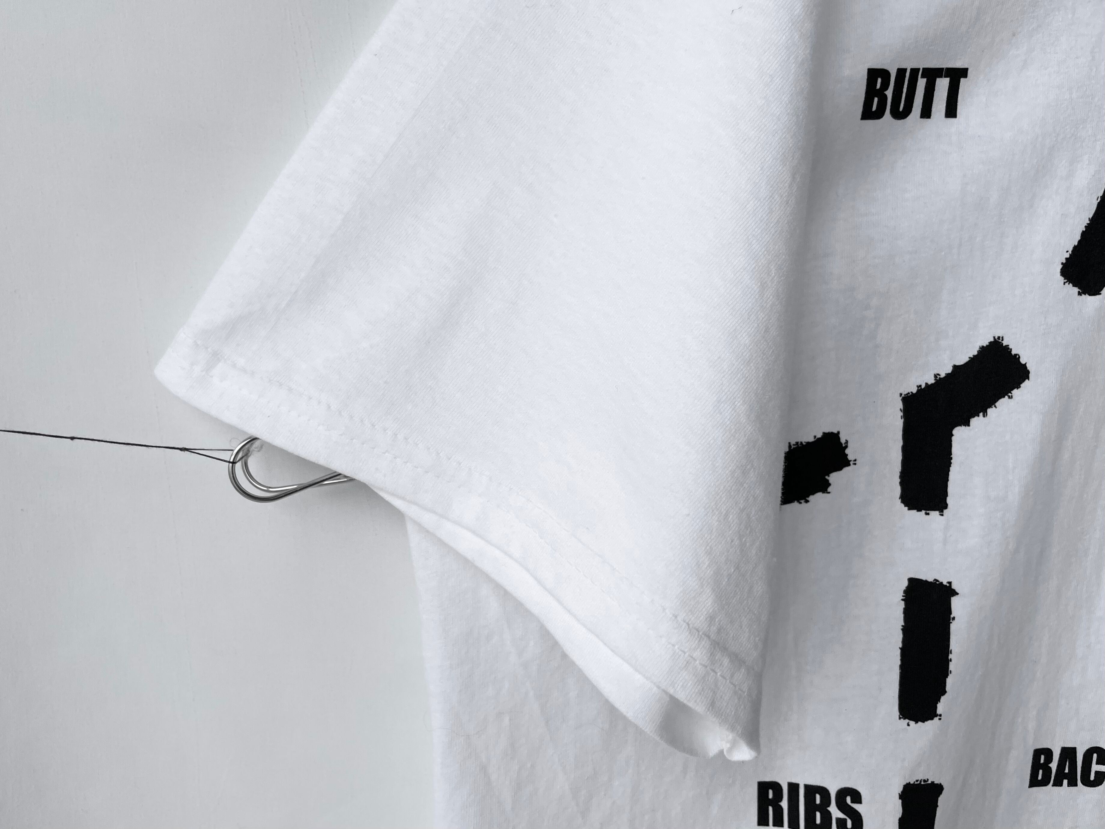 ボディが点線で分けられ、お肉の部位が一目で分かるユニークなプリントデザイン。