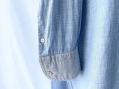 丸く縁取られたブザム/カフスは、白地に青/オレンジブラウンの糸が混じる非常に細かな織柄。