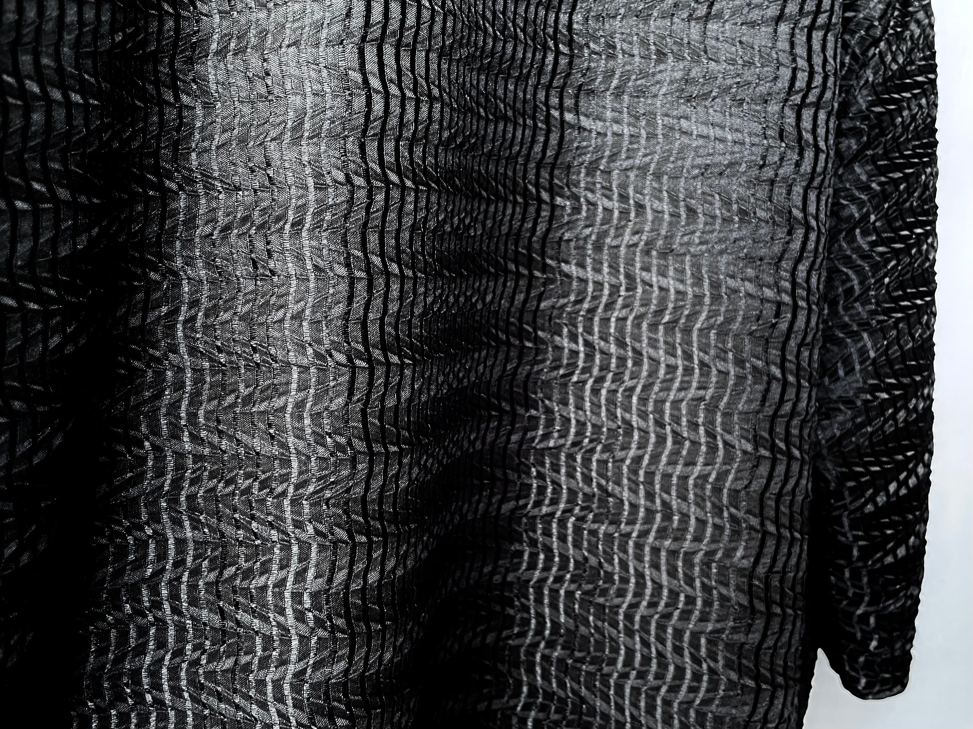 生地の揺れ/動きにより細かな反射光が見られる、艶のあるブラックカラー。