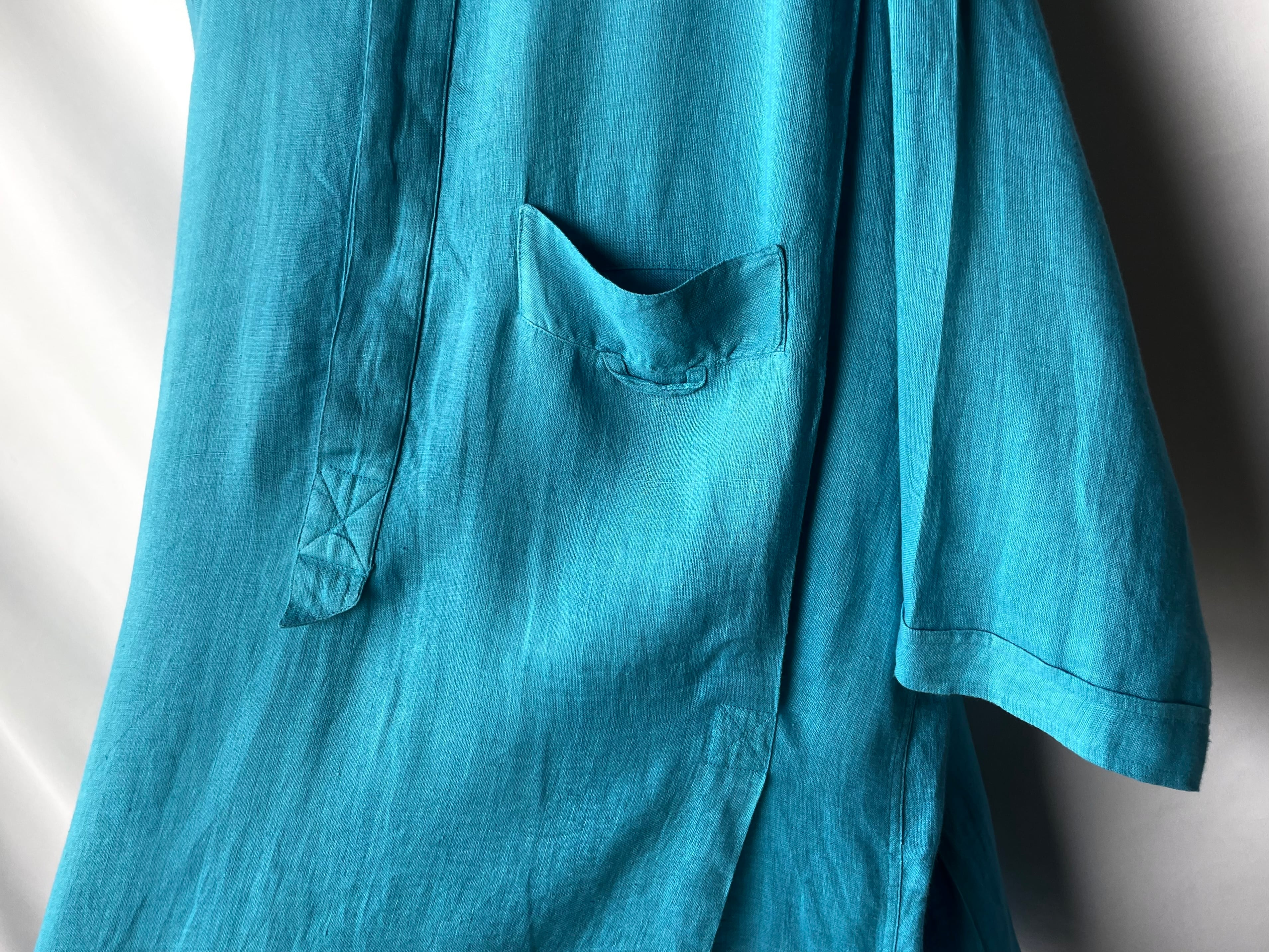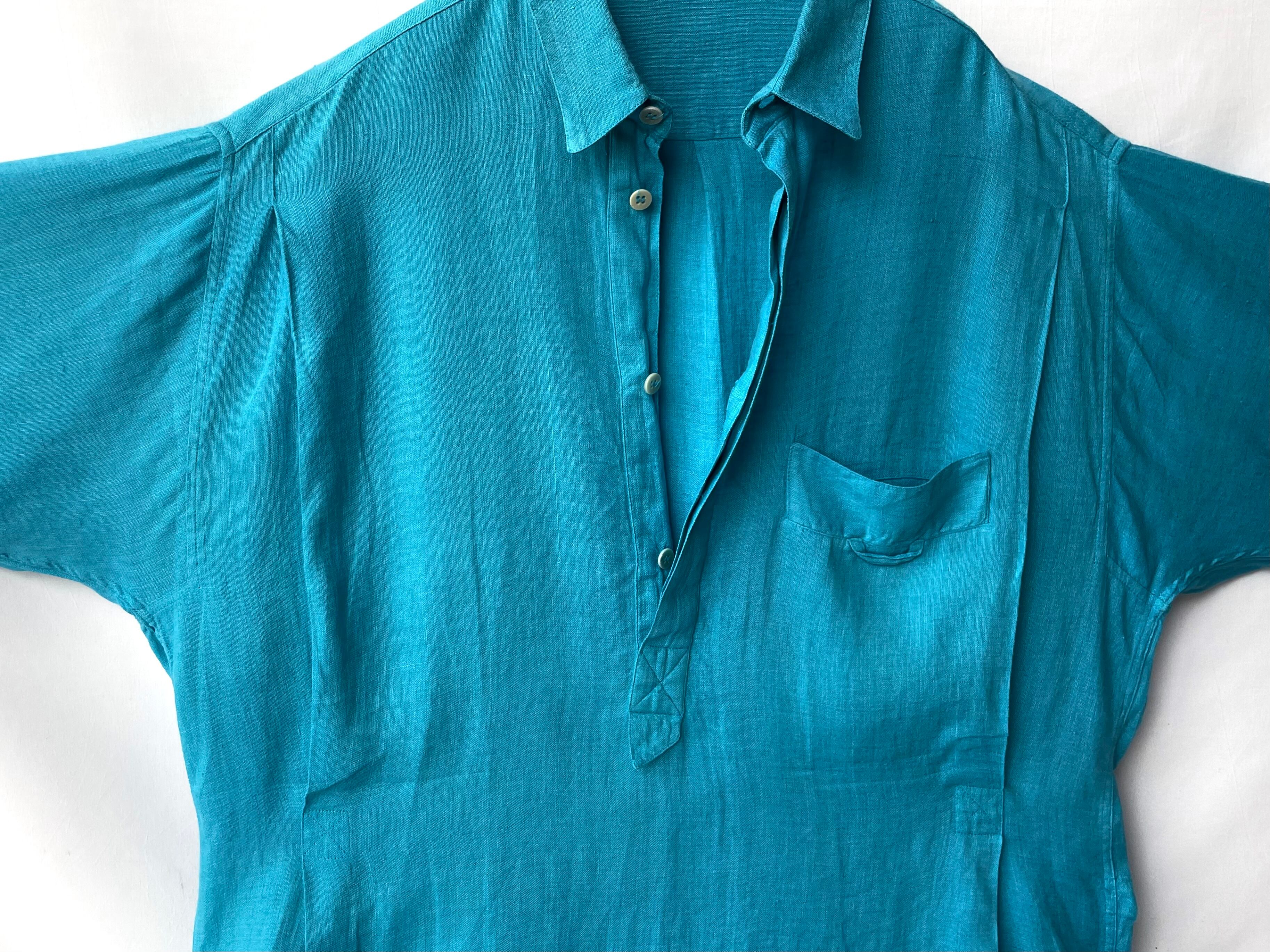 A relaxed silhouette with a deep pullover that goes halfway down the body and a small collar.