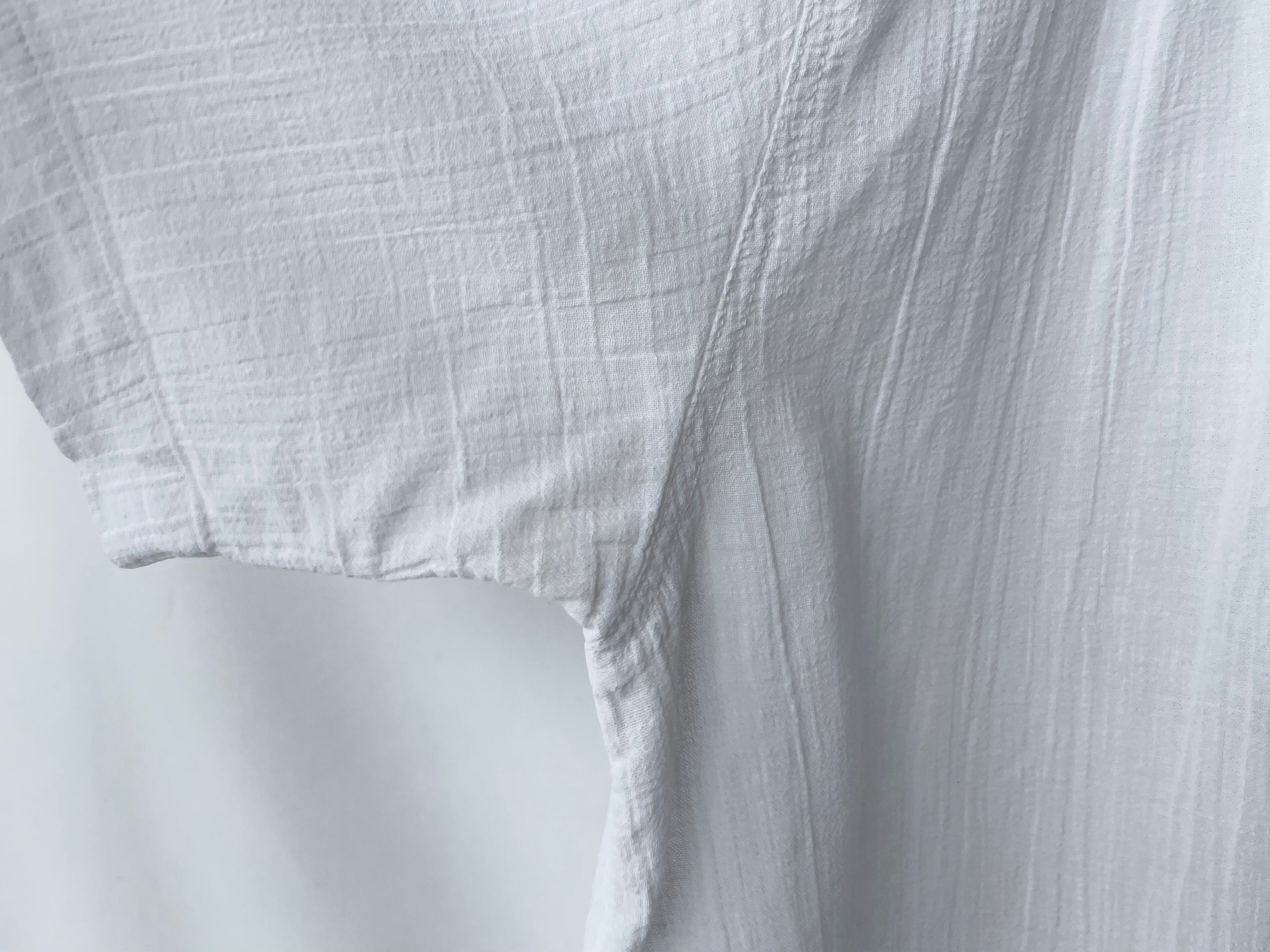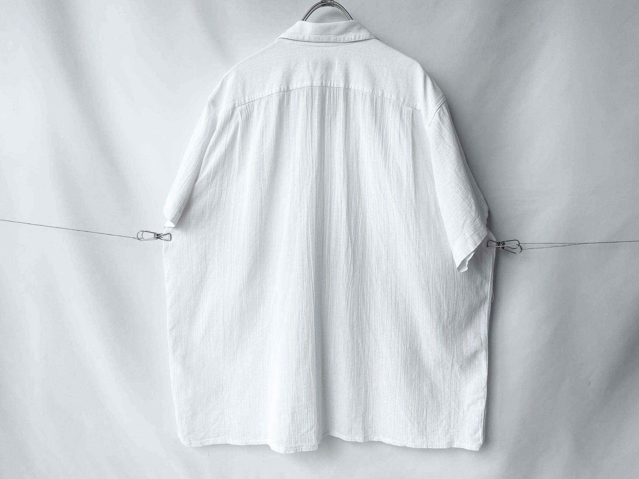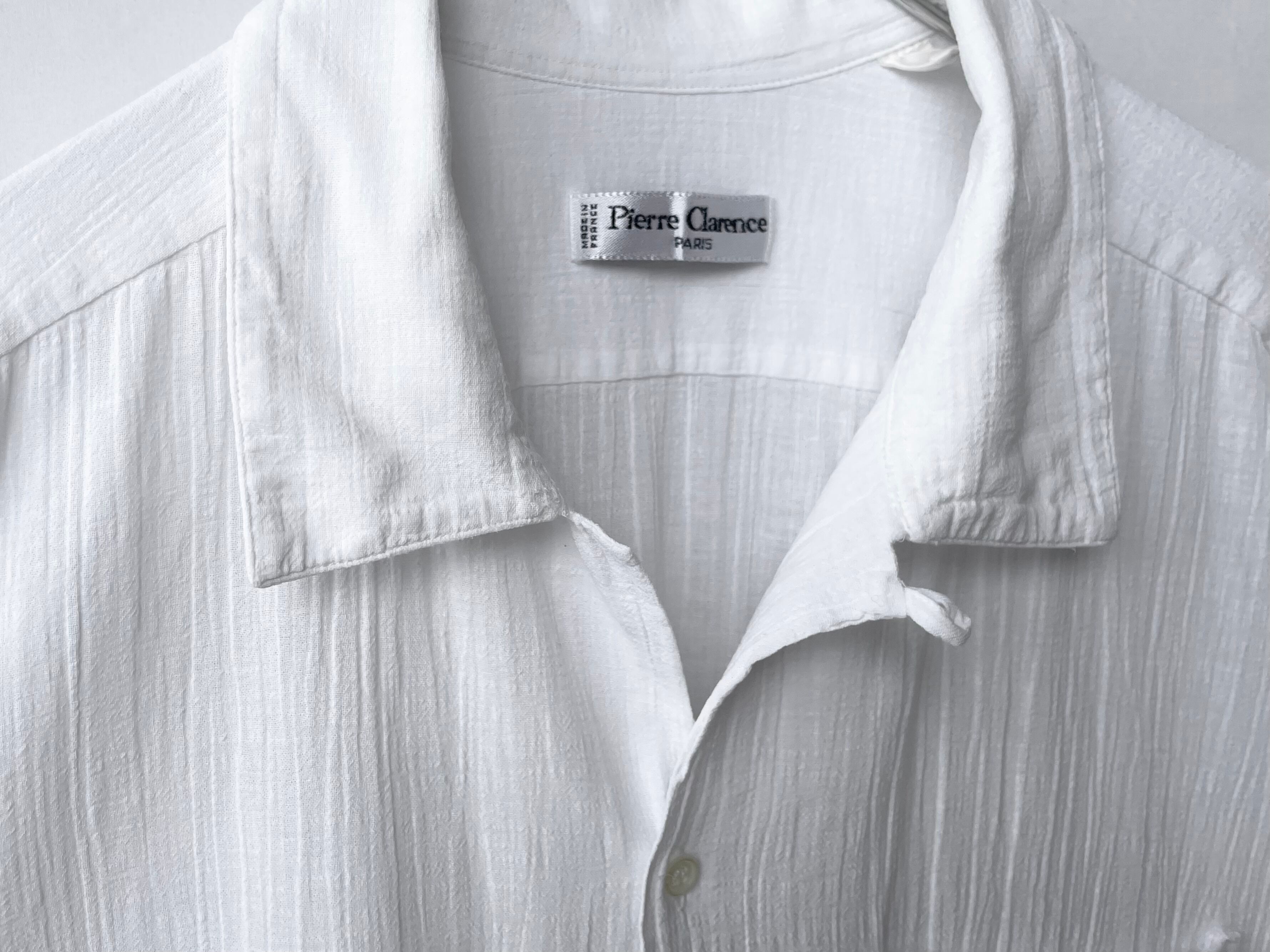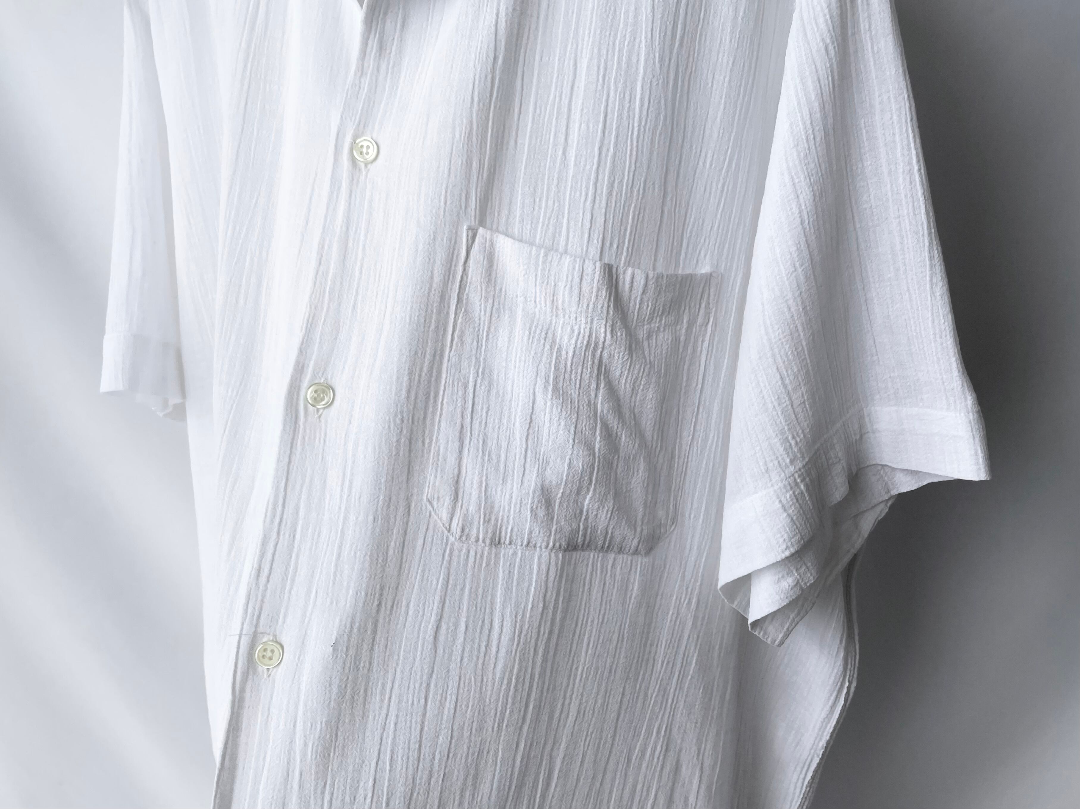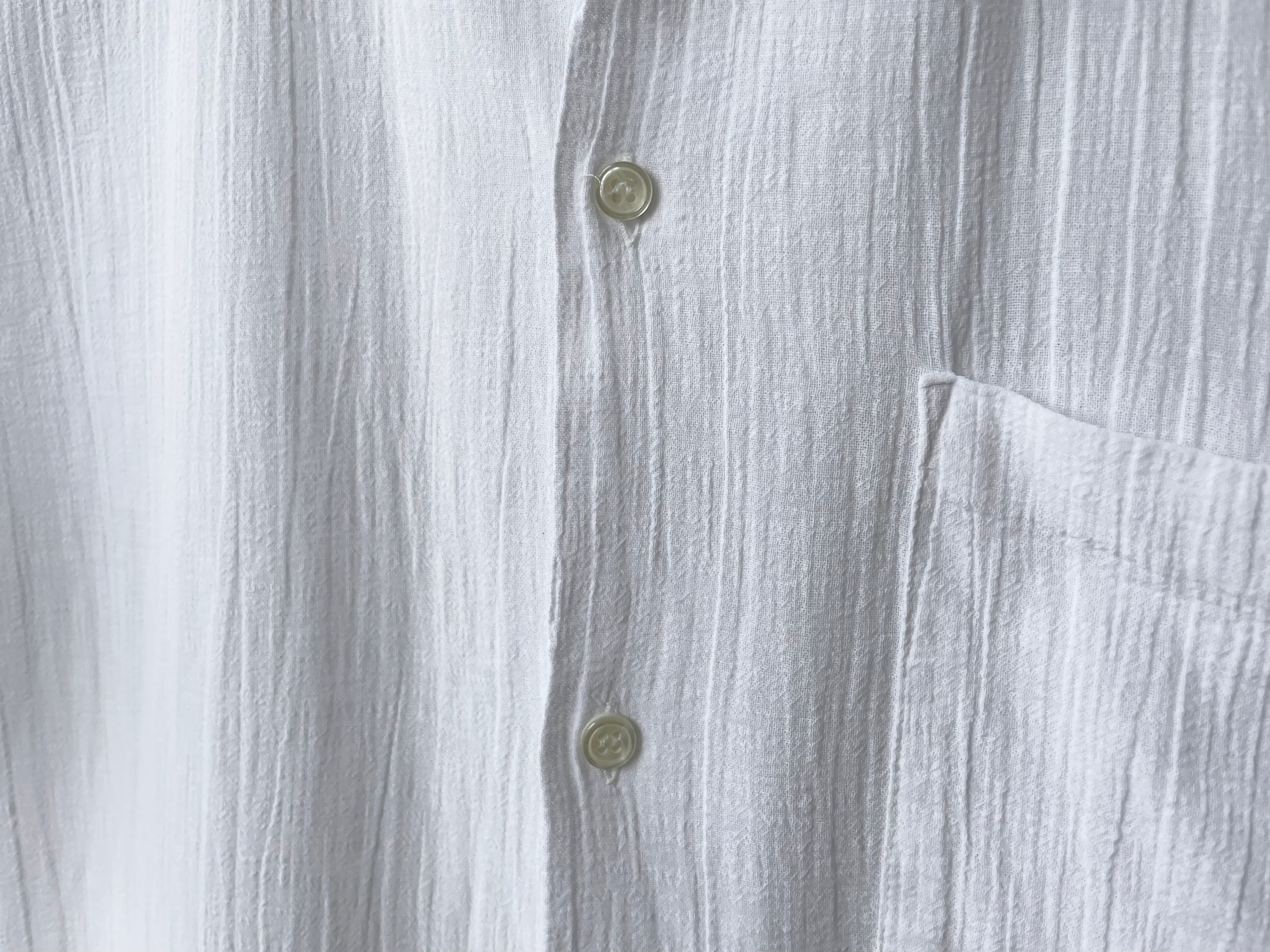 It's an old-fashioned shirt that is probably reminiscent of open-collared shirts from the 50s and 60s, but I think the slightly sheer white color and high-quality cotton body with a fine, moving woven pattern are hard to find in vintage clothing.