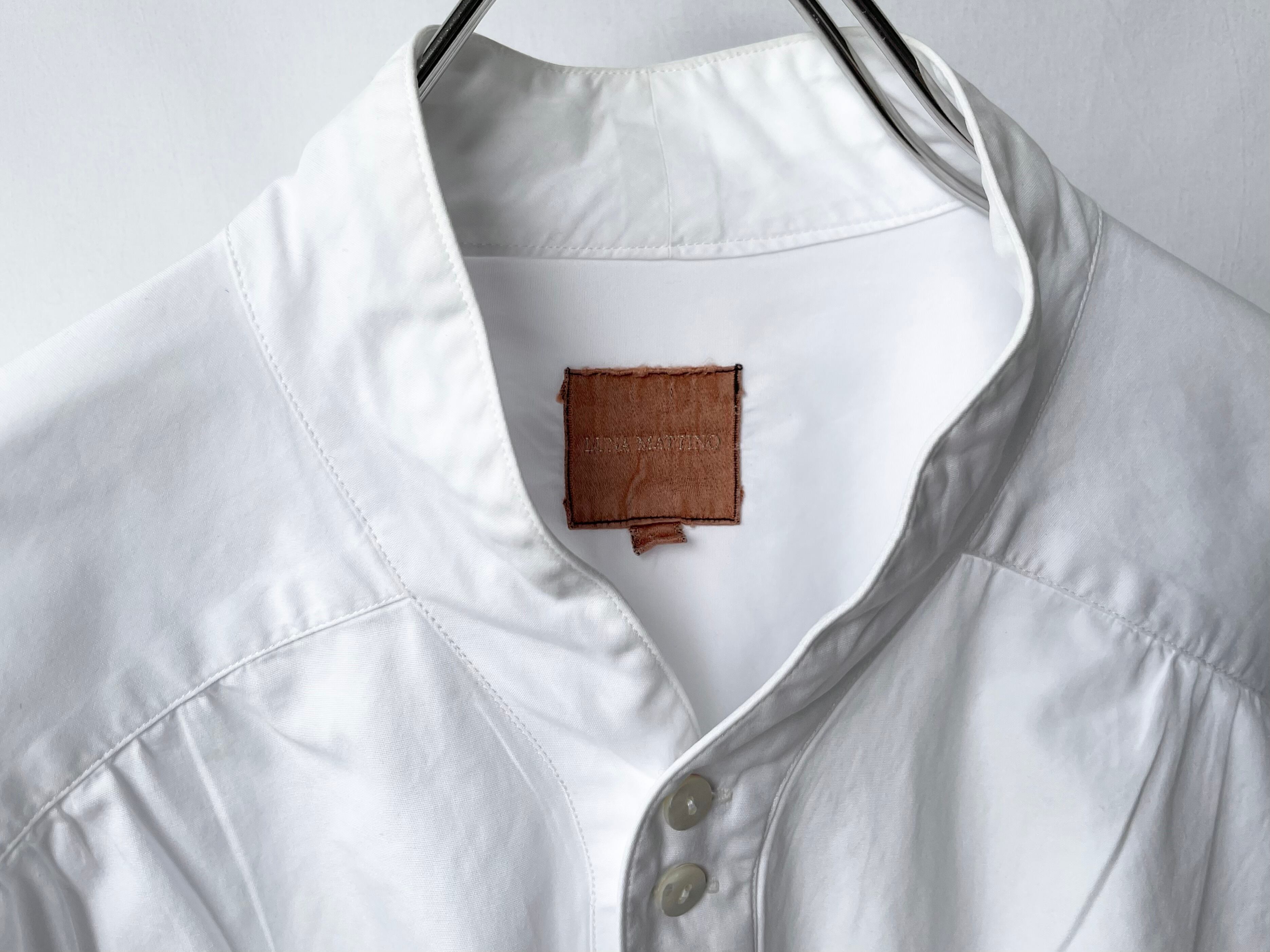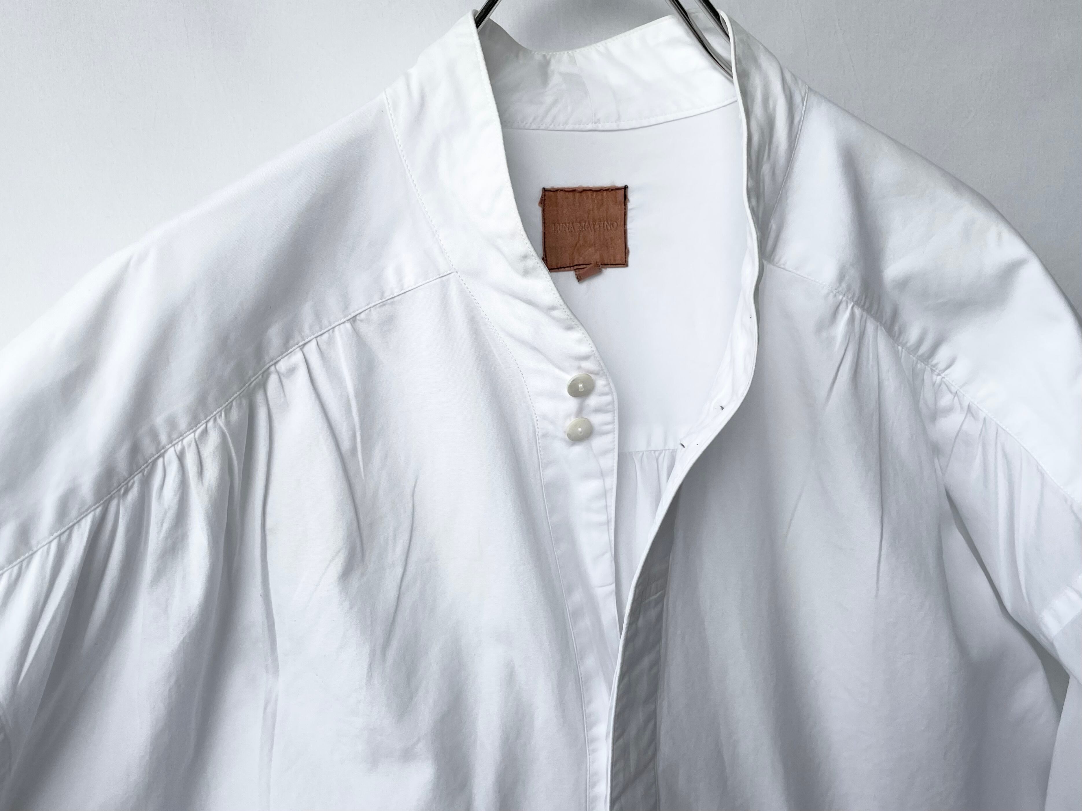 袖口3連のボタンデザイン、肩前/バックヨークの無数のギャザー。