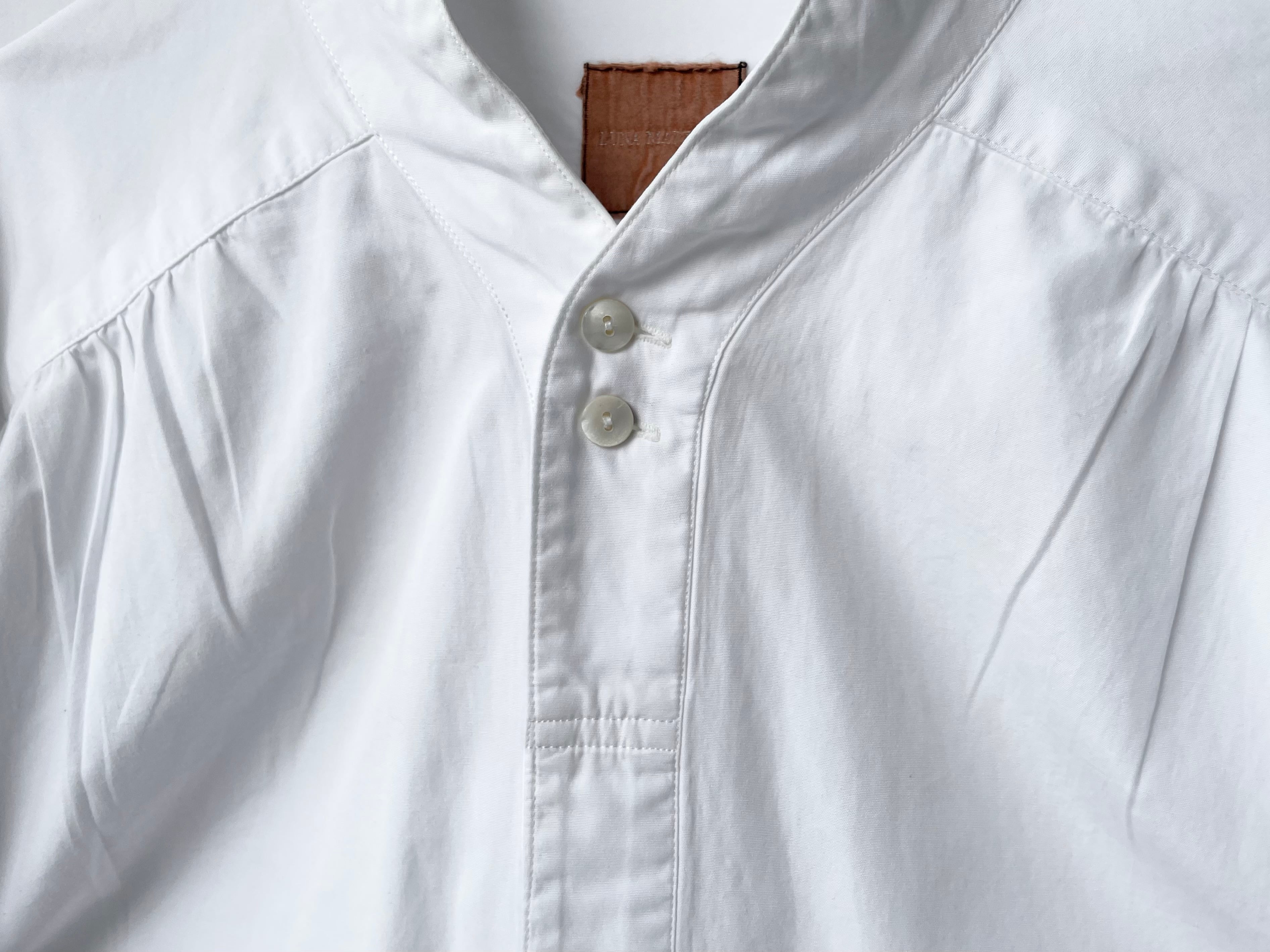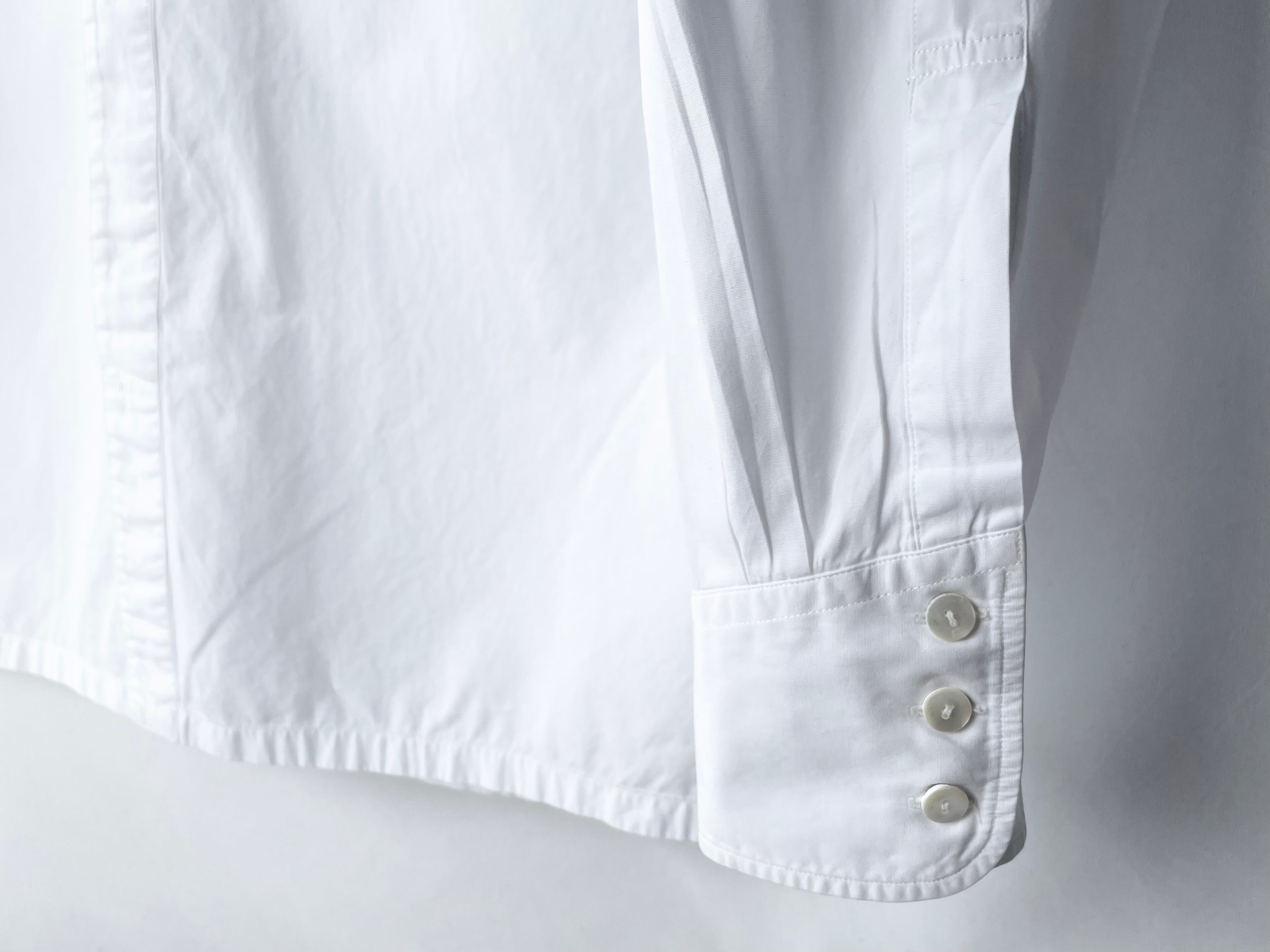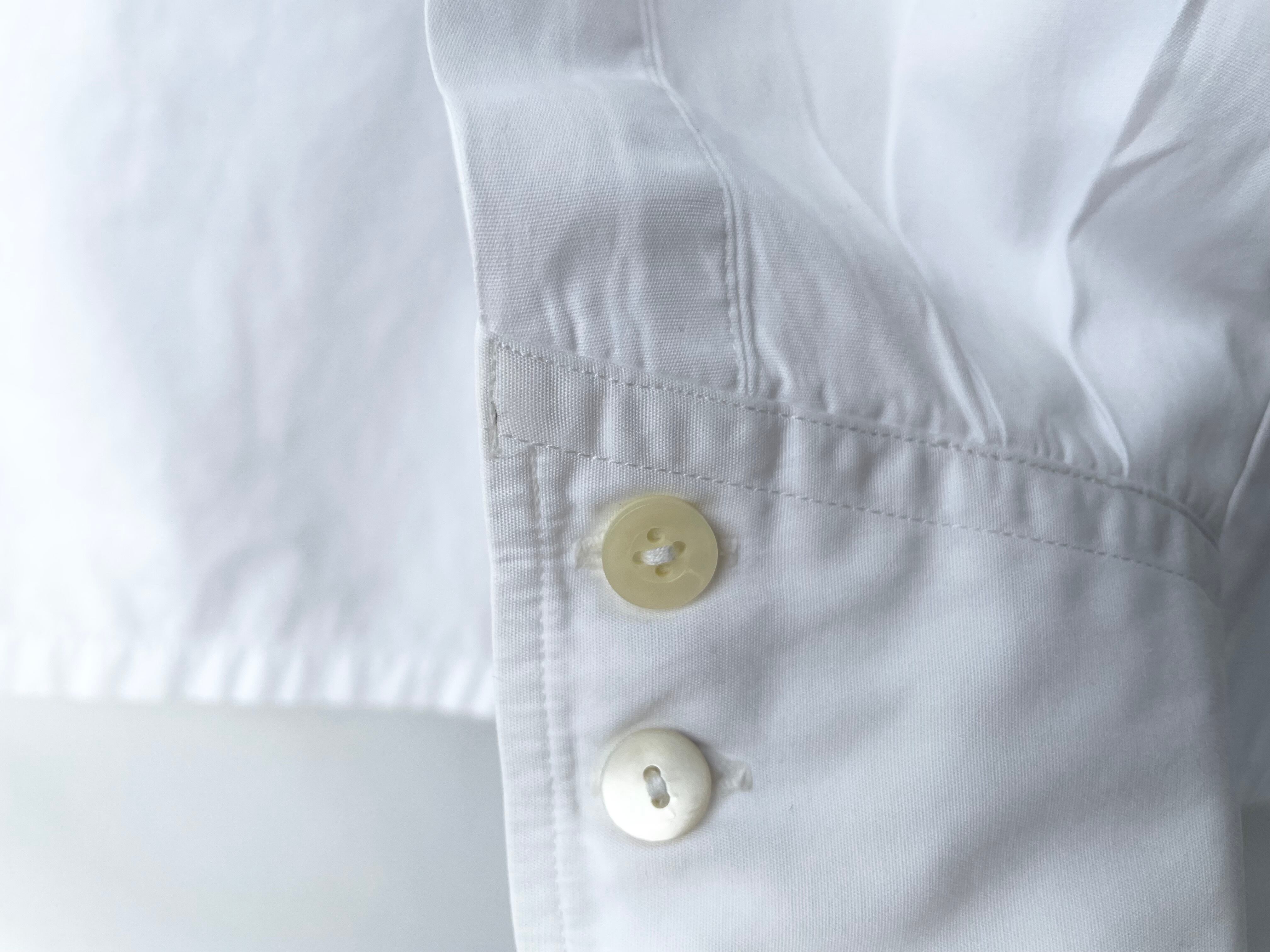 白単色の上質なコットンブロードに2つ穴のシェルボタン。