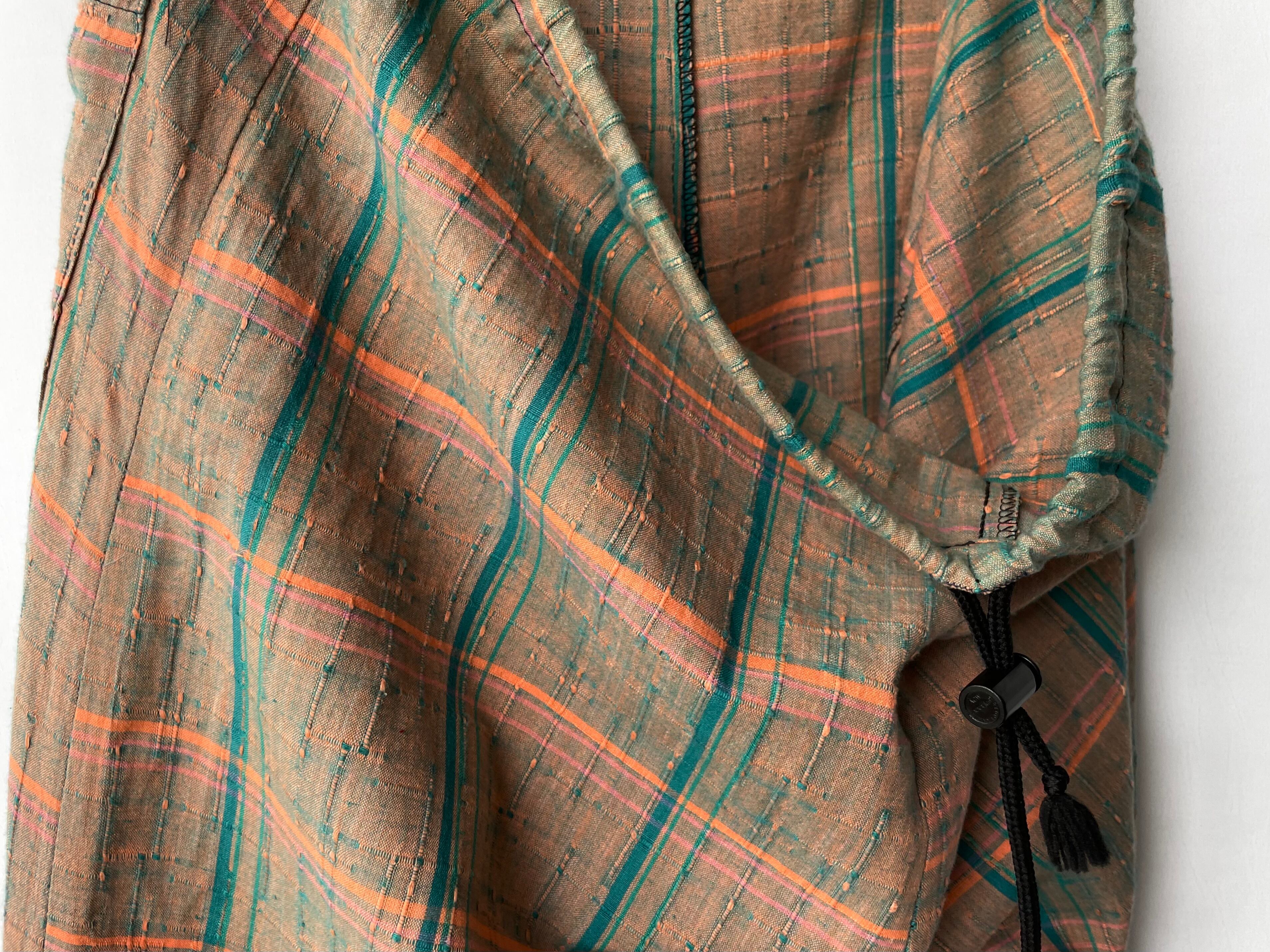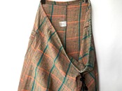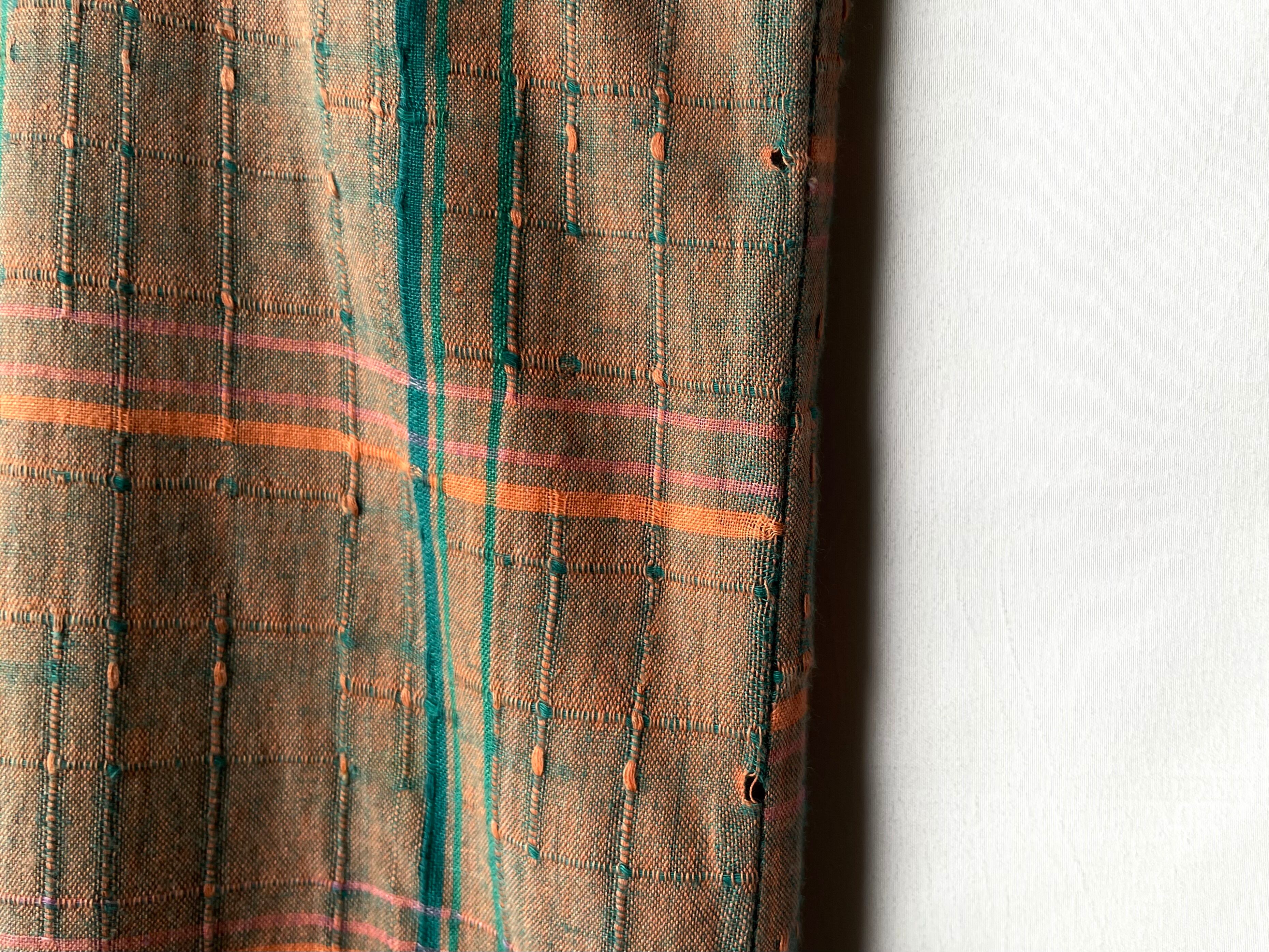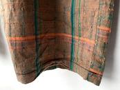 鮮やかなオレンジブラウンにブルーグリーン/ピンクの糸が混じる、奥行きのある織生地。