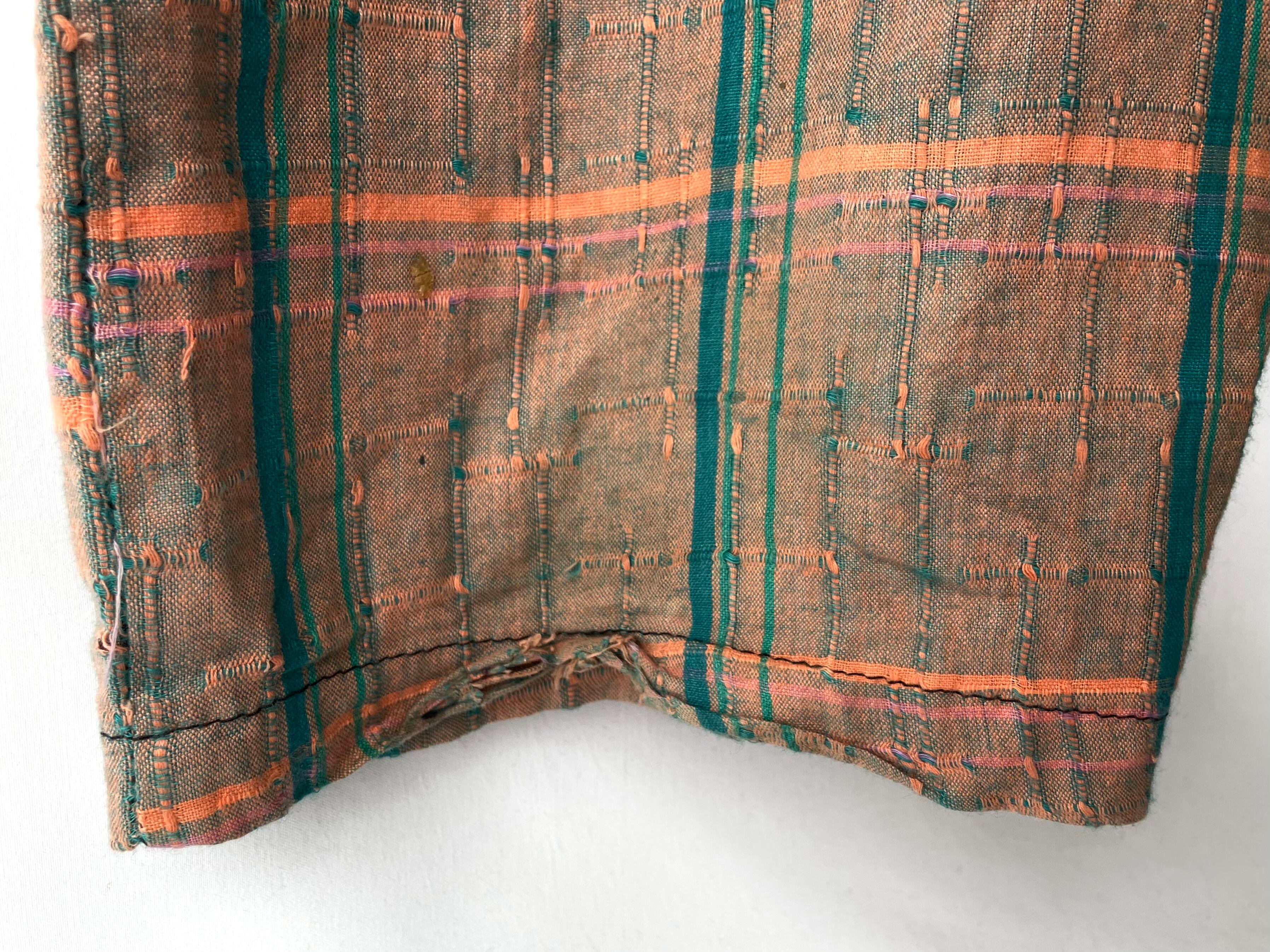 A deep woven fabric with vibrant orange-brown and blue-green/pink threads.