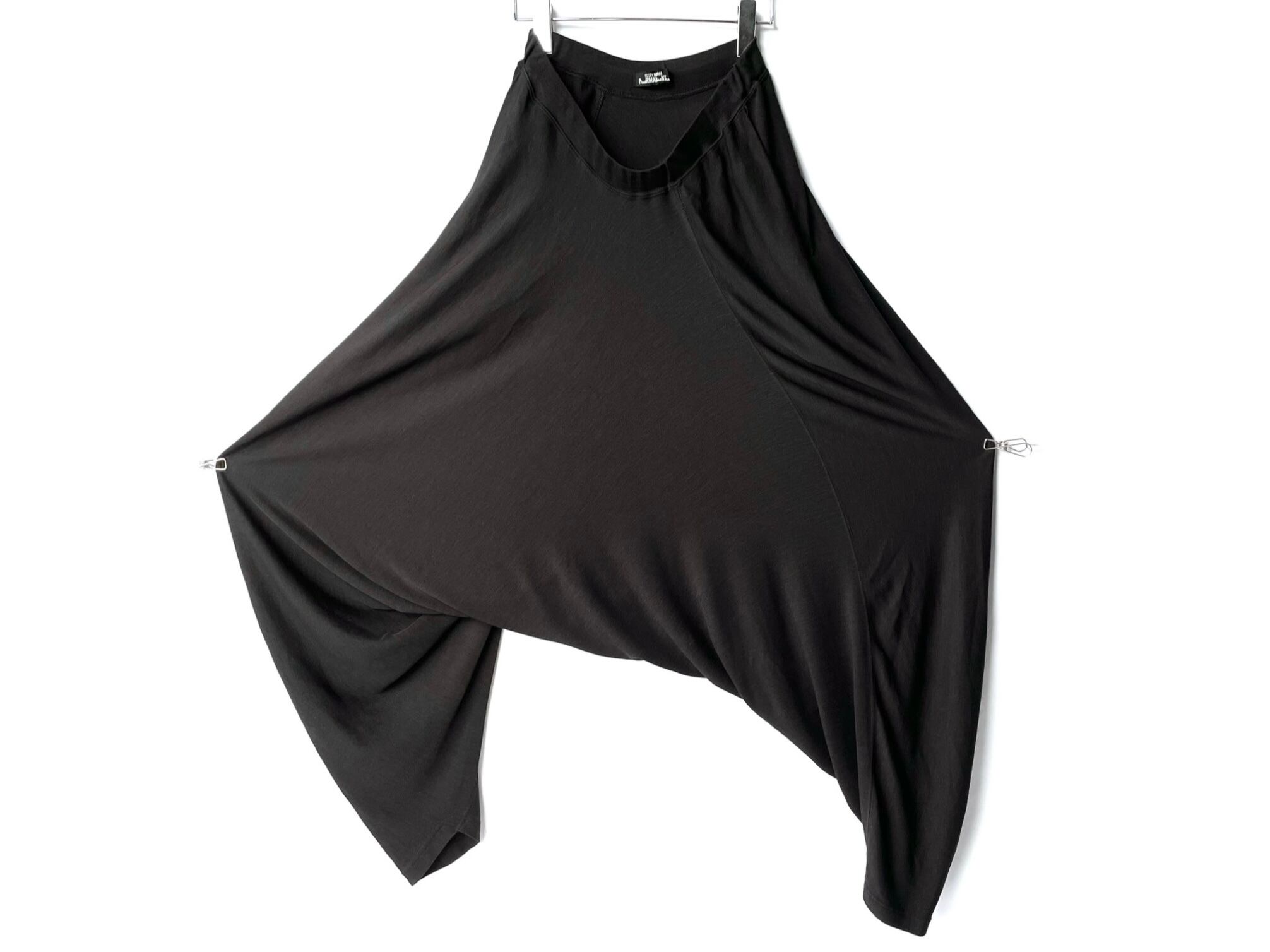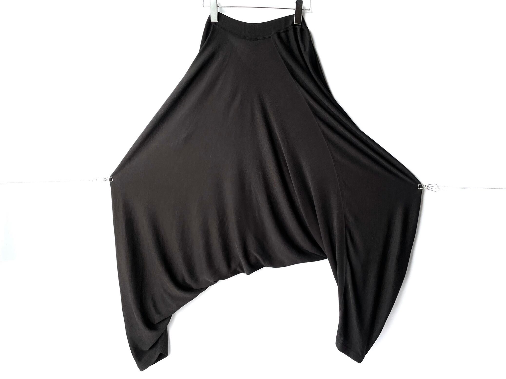 A distinctive wide silhouette with plenty of fabric gathering under the crotch.