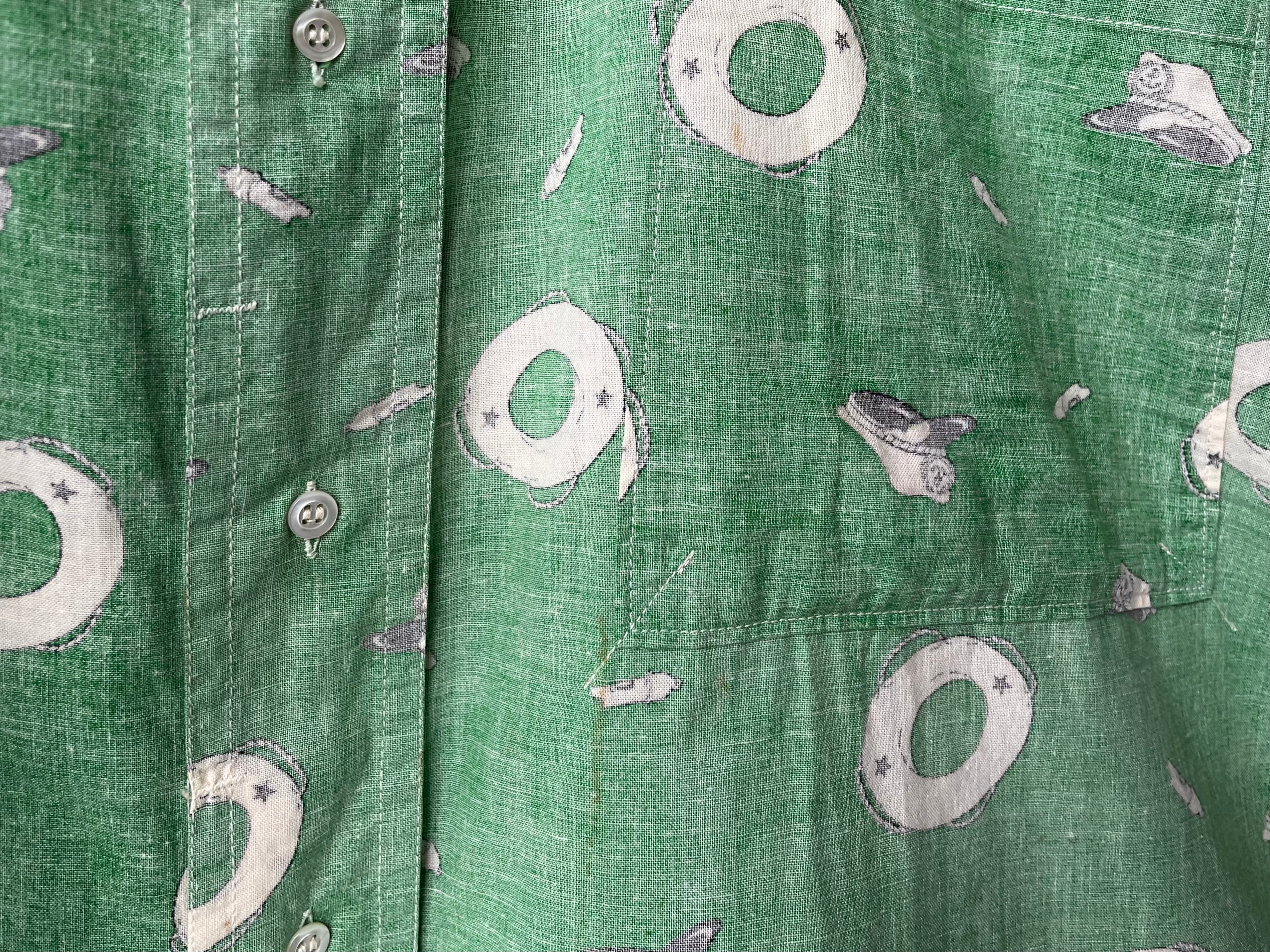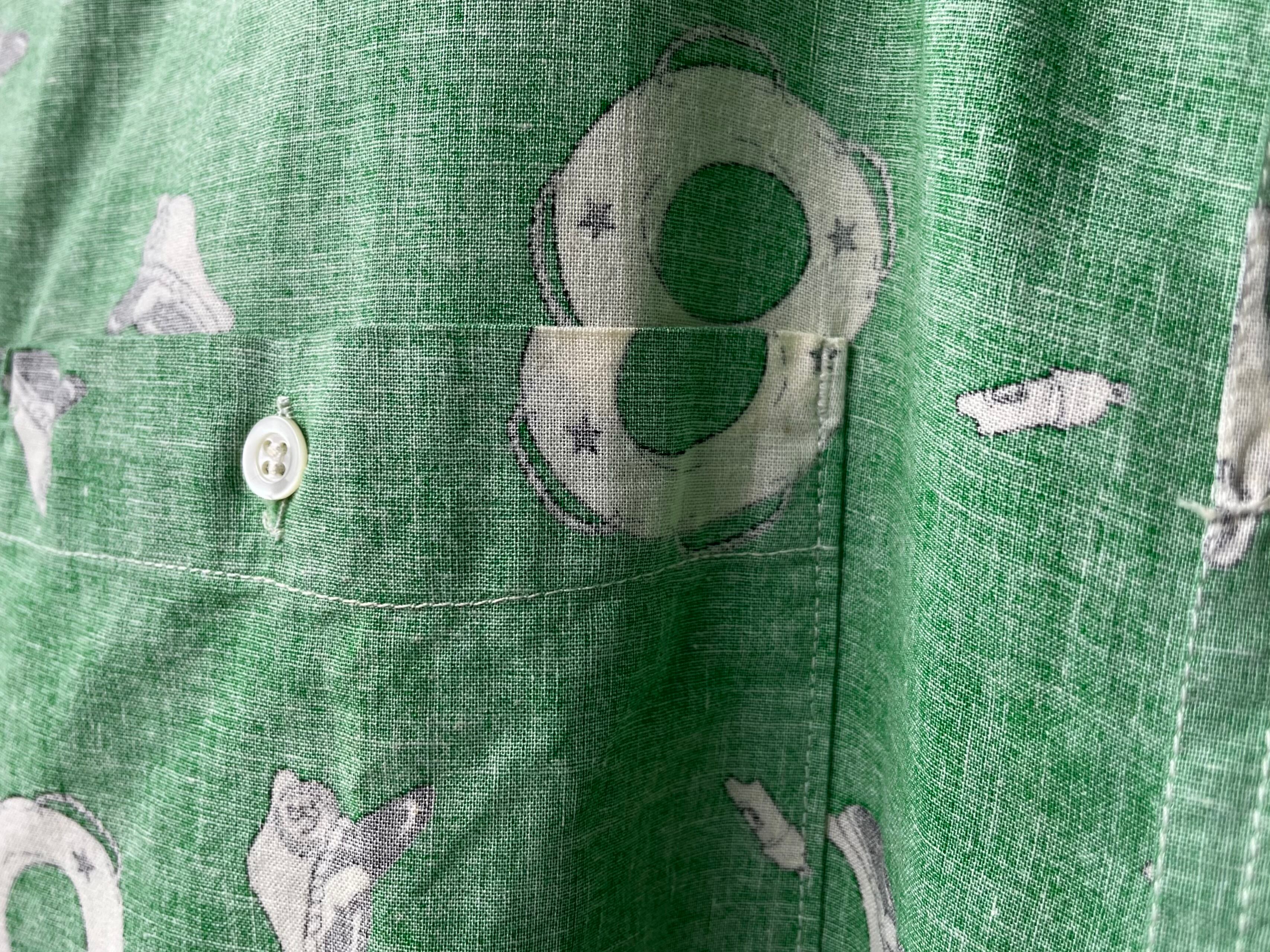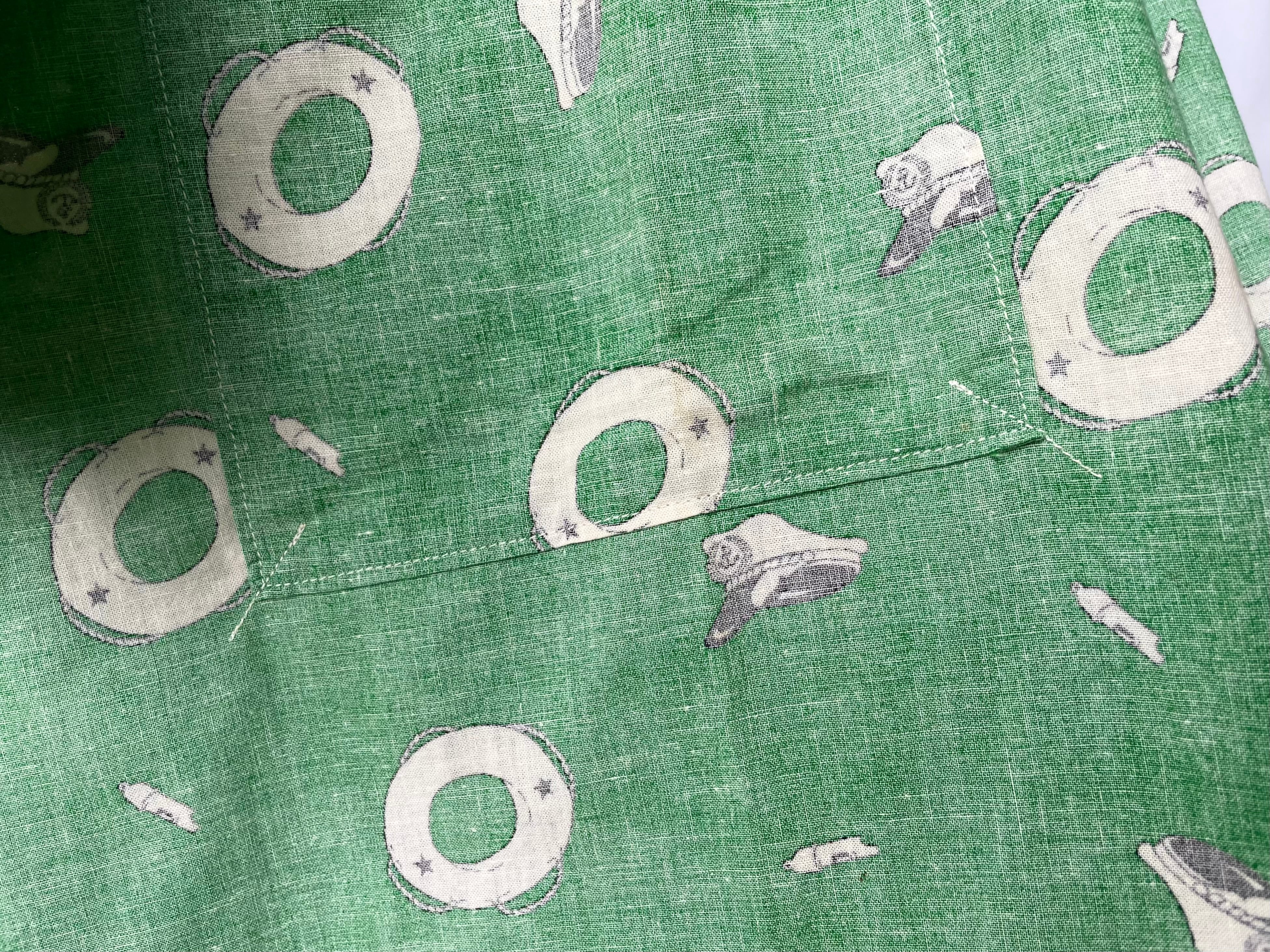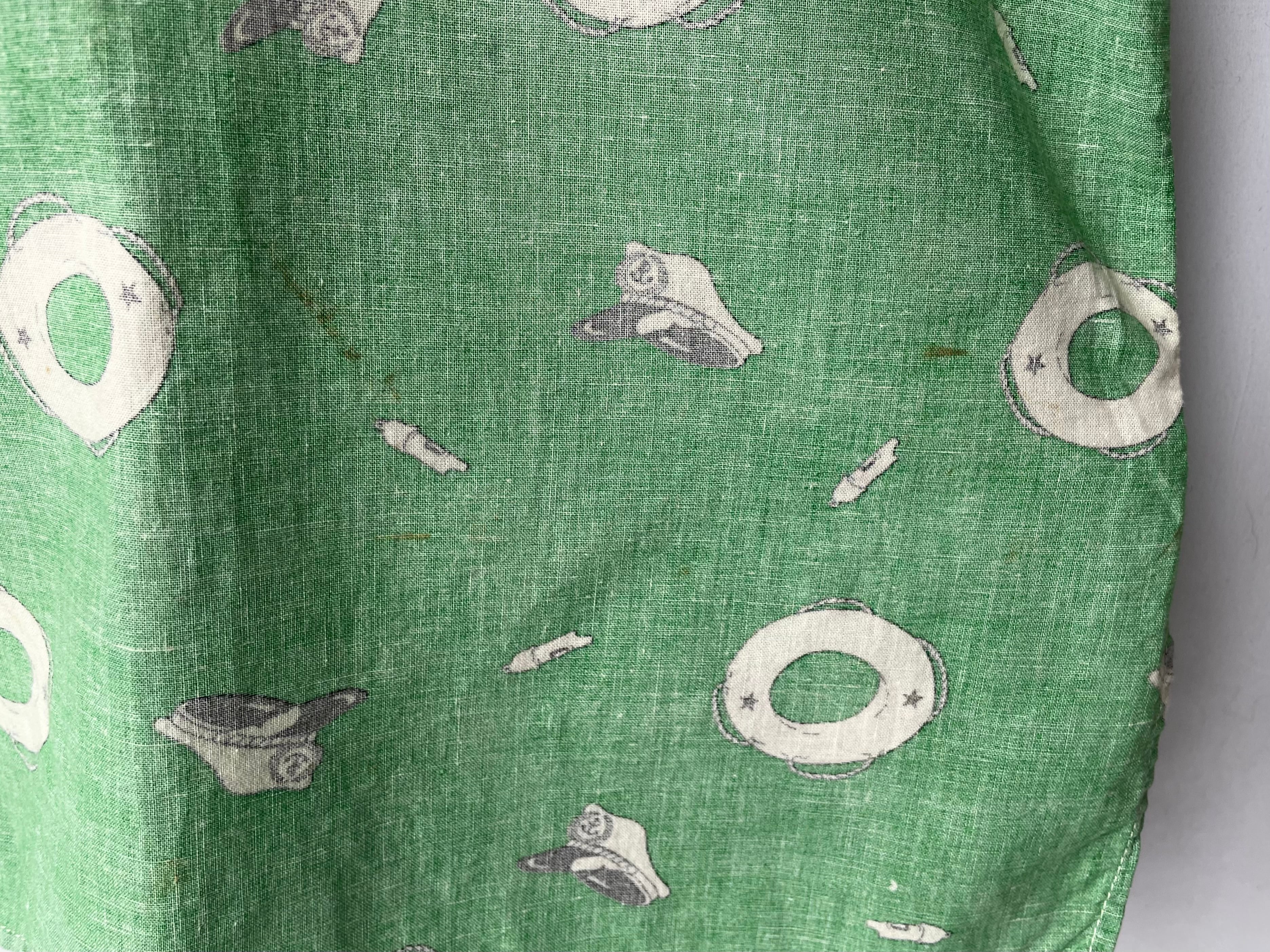 An all-over pattern reminiscent of the sea, with swim rings, hats, and whistles (?) scattered throughout.