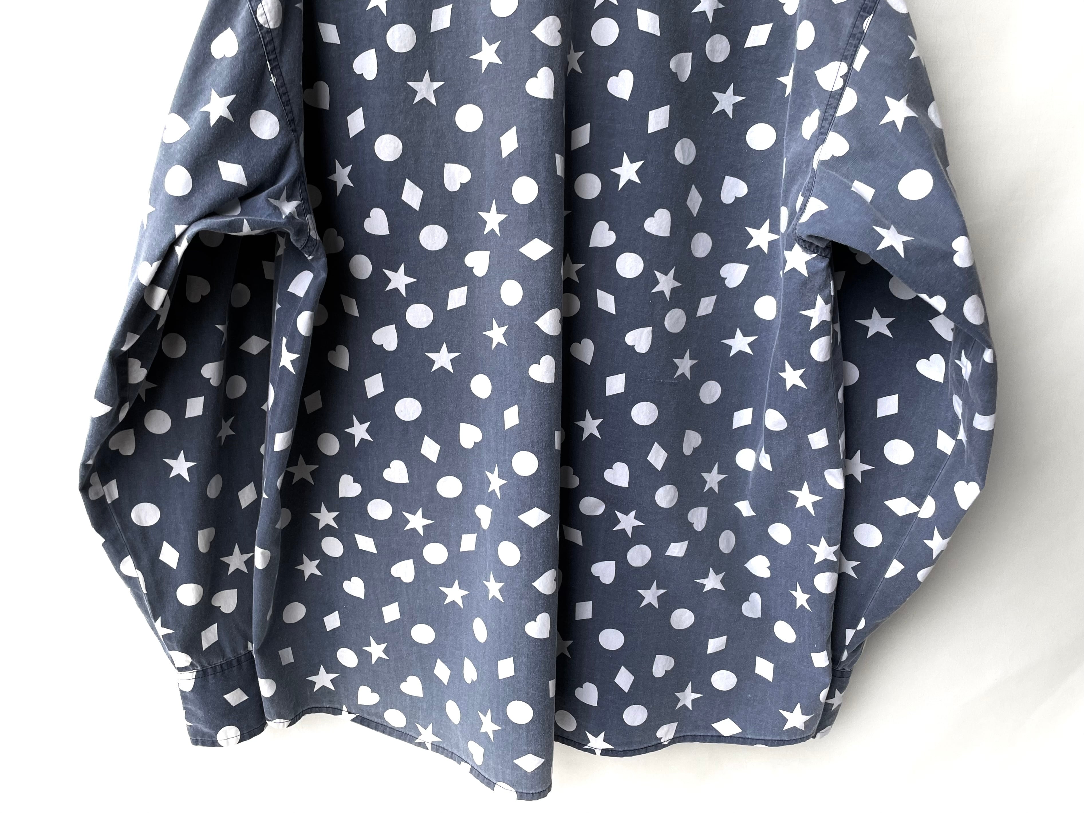 ぼやけたブルーグレーベースに白でくり抜かれた、星/ハート/丸/菱形の総柄モチーフ。