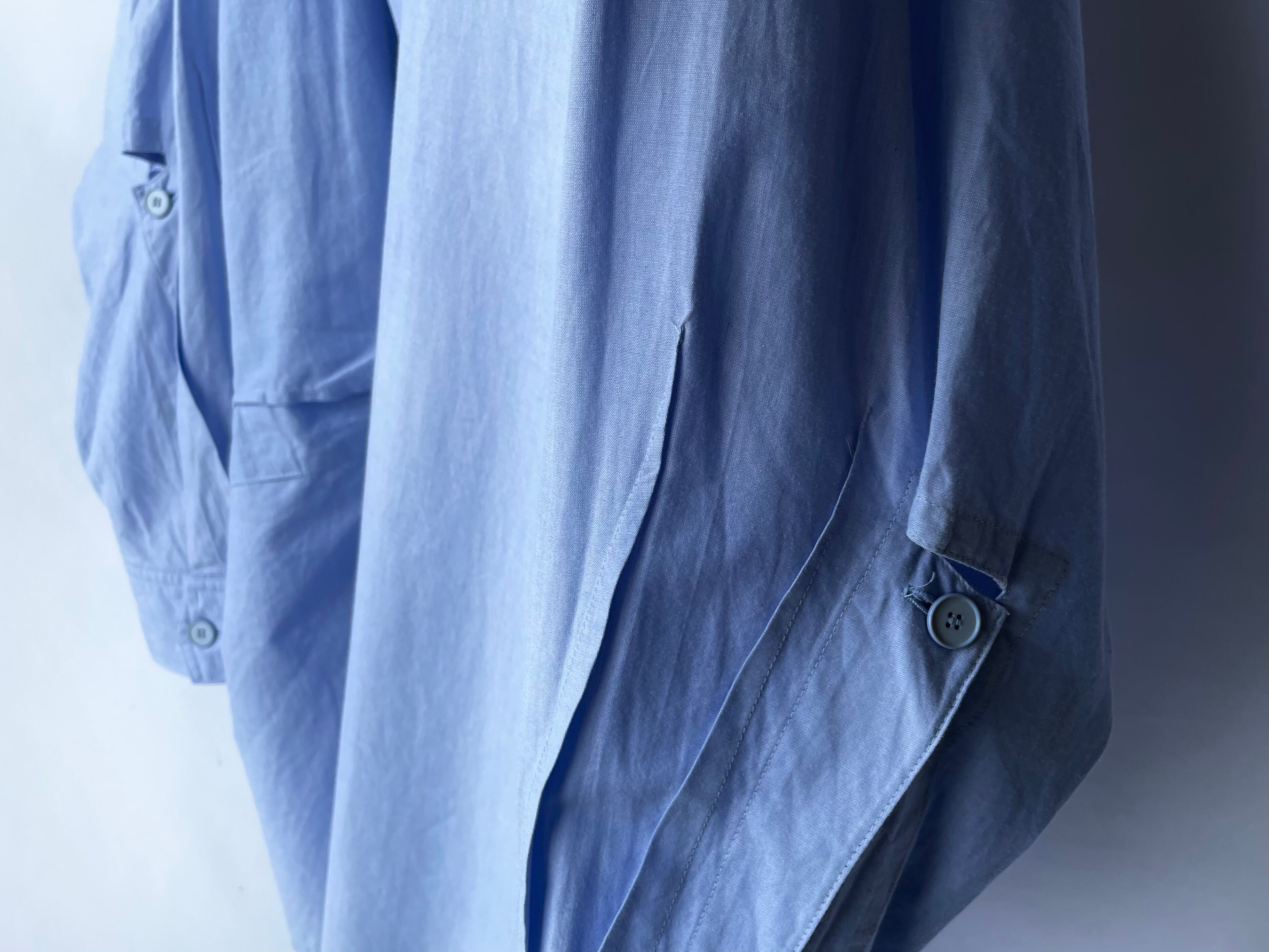 両袖先に向けて2箇所生地が摘まれ、肘下までがばっくりと割れる2点ボタン留めのカフスデザイン。