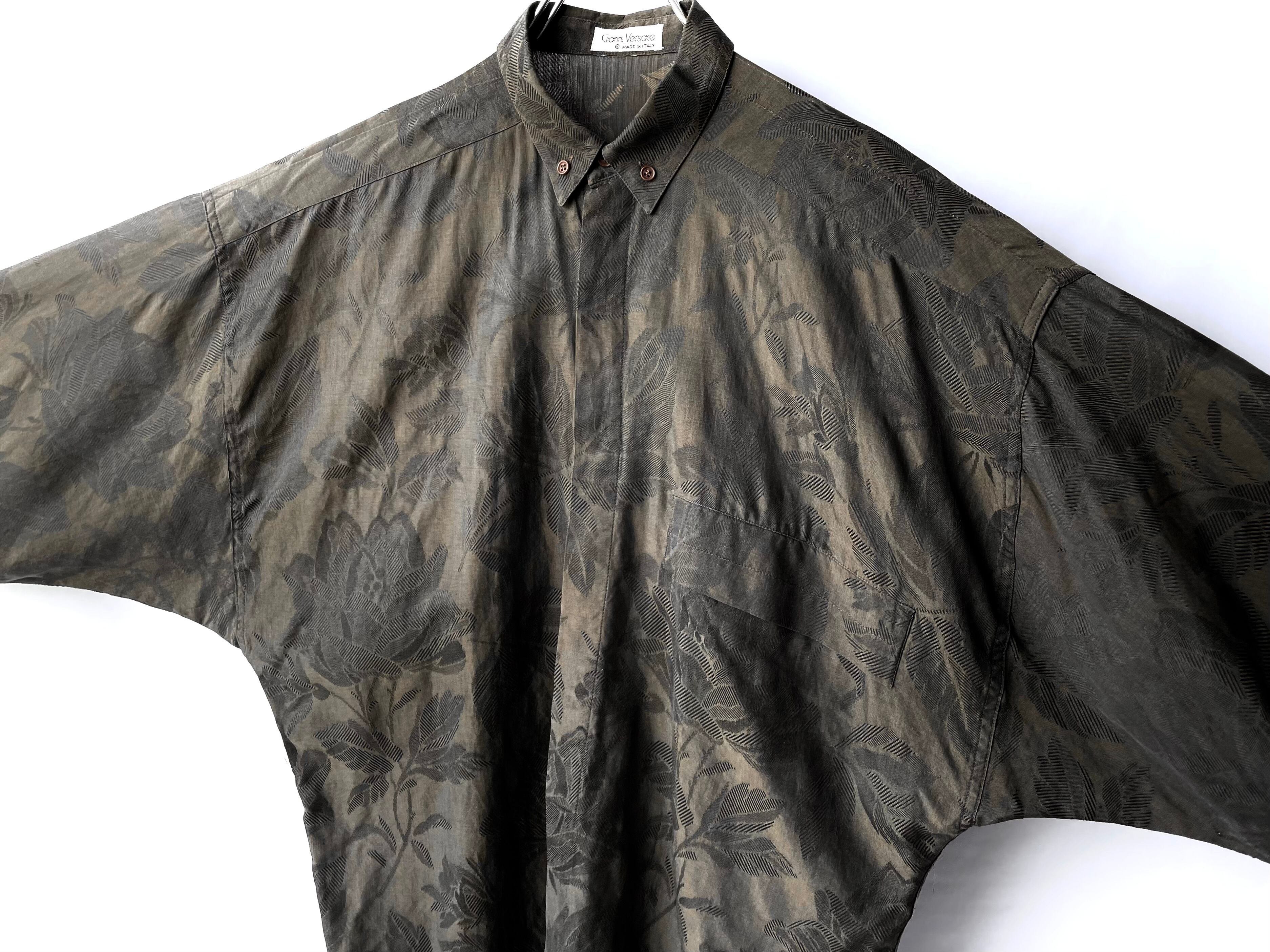 彩度を抑えたカーキオリーブカラーの落ち着きのある草花模様。