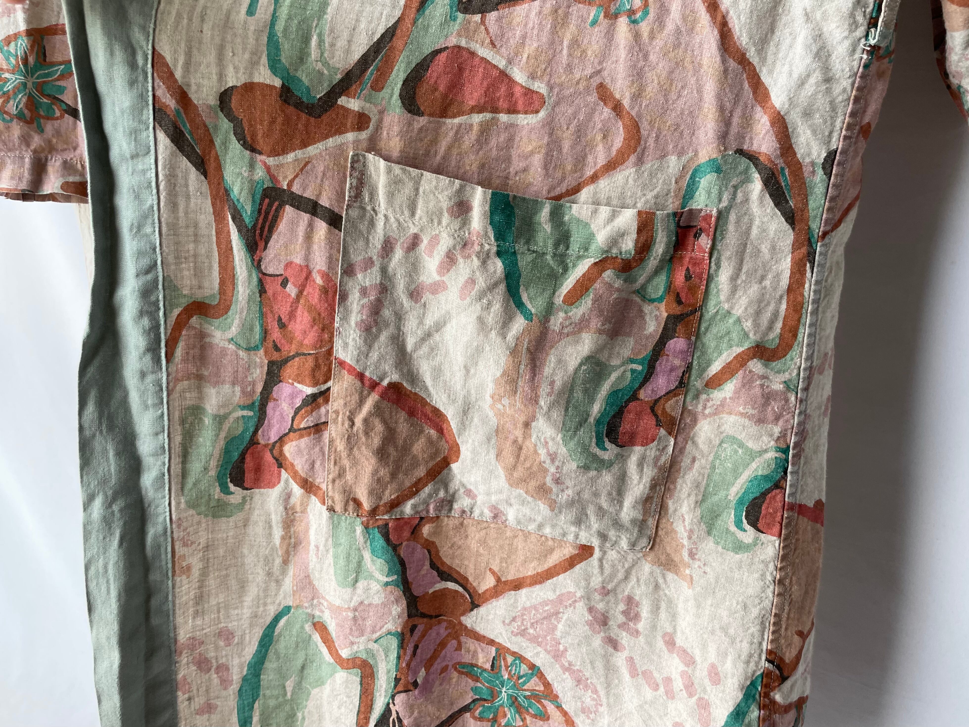 淡色のブルーグリーンやピンクオレンジが流動的に混じる、アーティスティックなオールパターン。