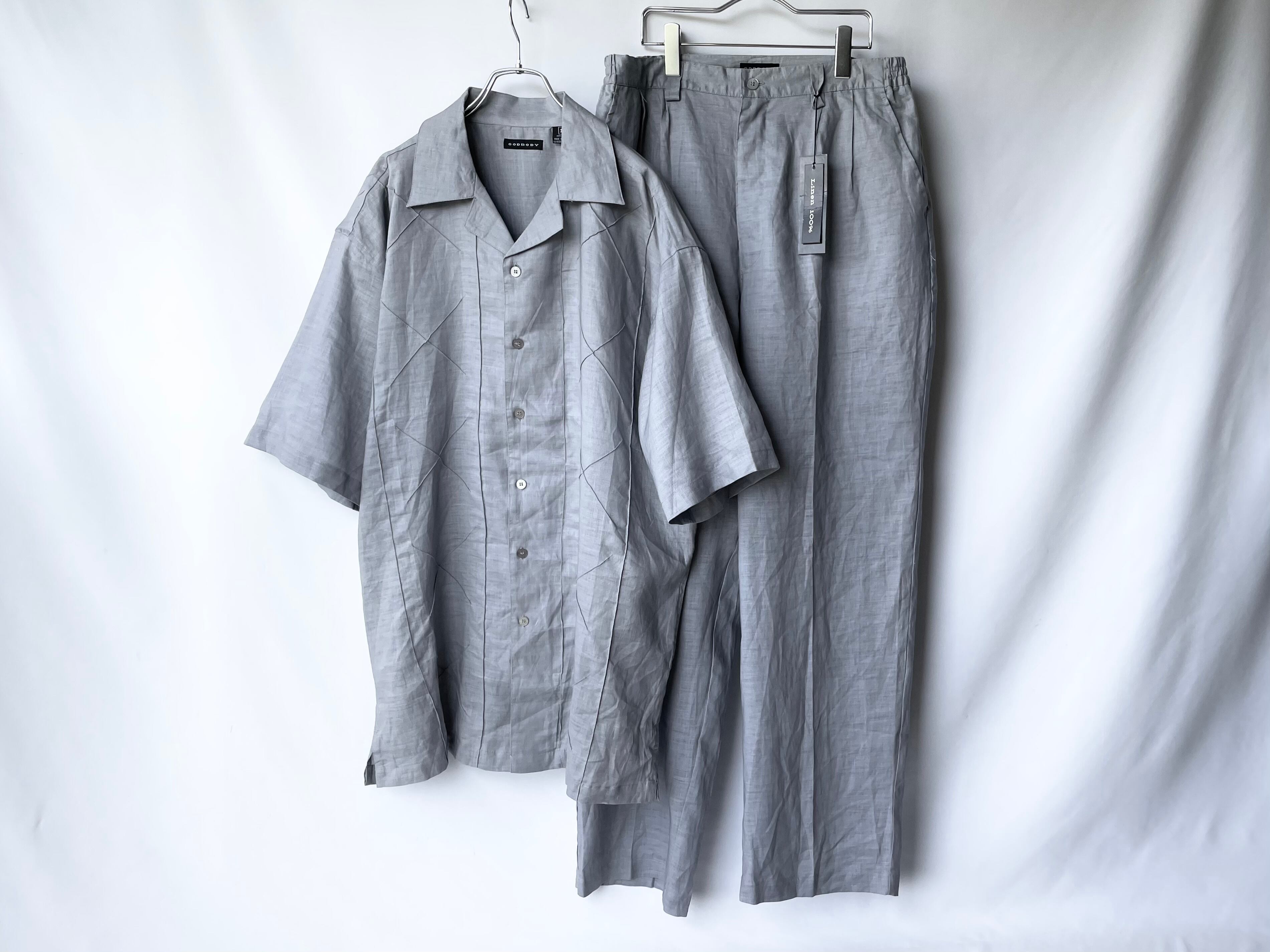A two-piece set with a big silhouette that exceeds actual size XL, consisting of an open-collar shirt with an attractive, quiet design and wide slacks made of the same fabric.