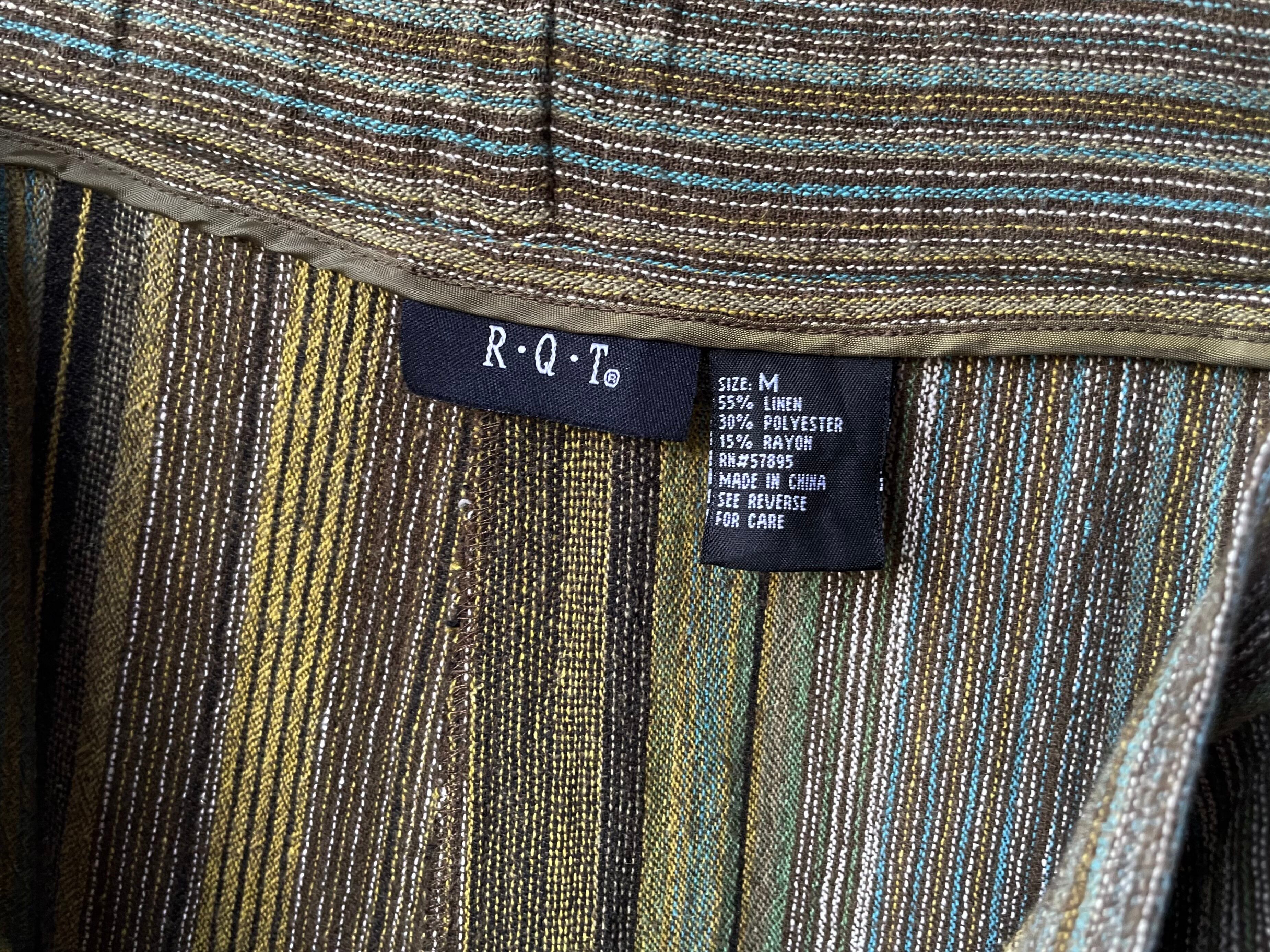 A finely woven fabric with a brown base and blue/green/white/yellow threads.