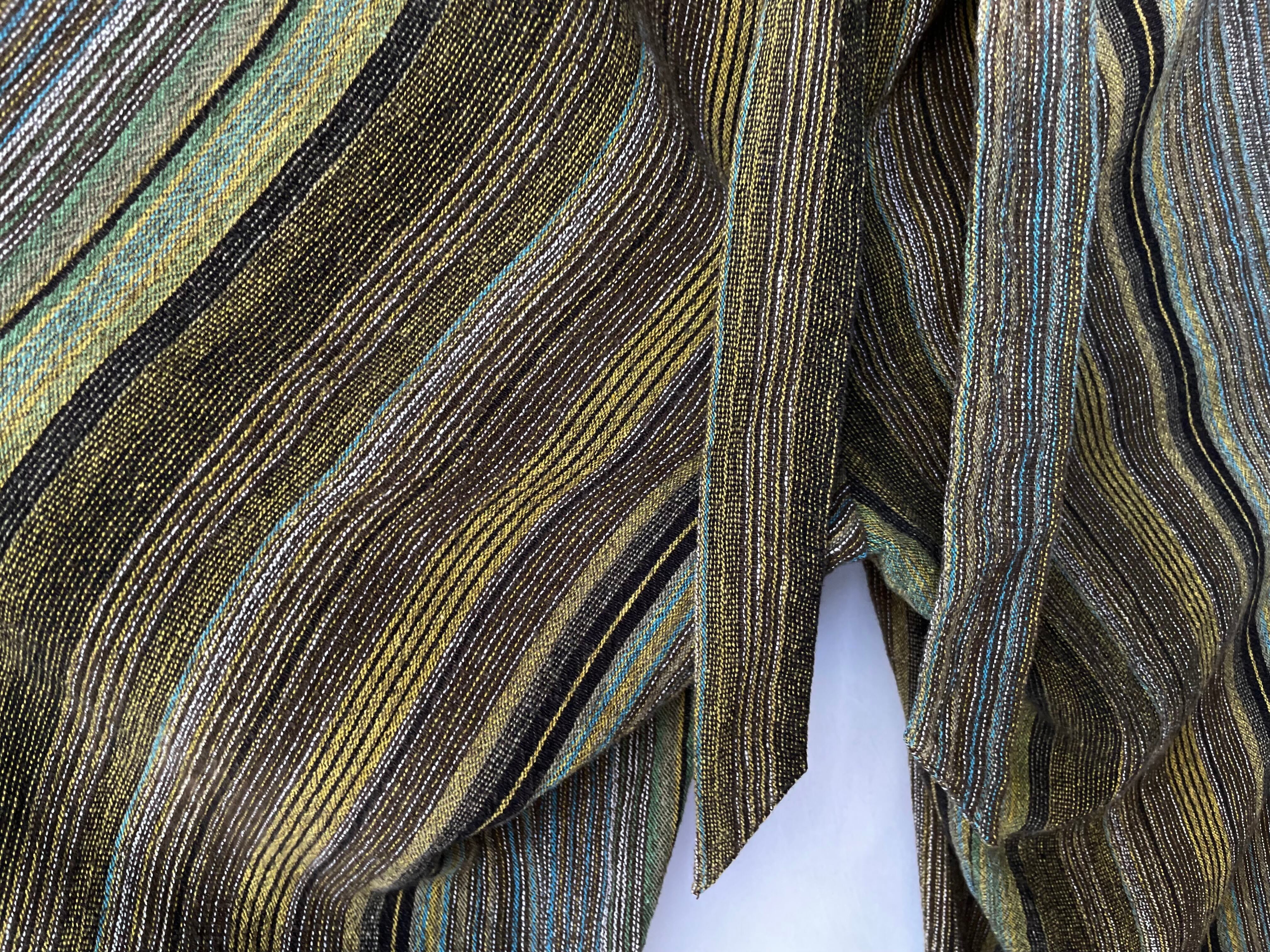 ブラウンベースに青/緑/白/黄の糸が混じる目の細かな編み地。