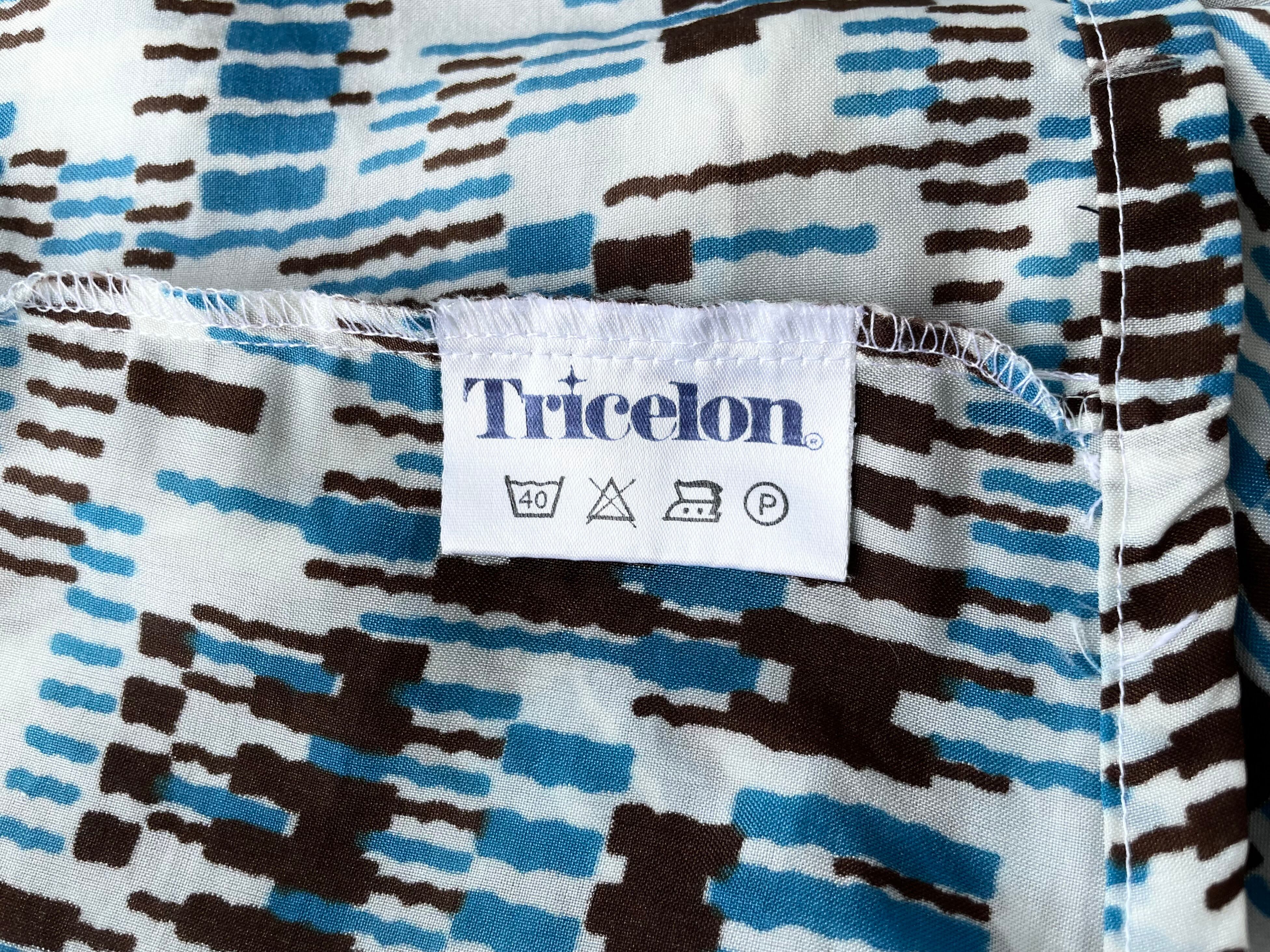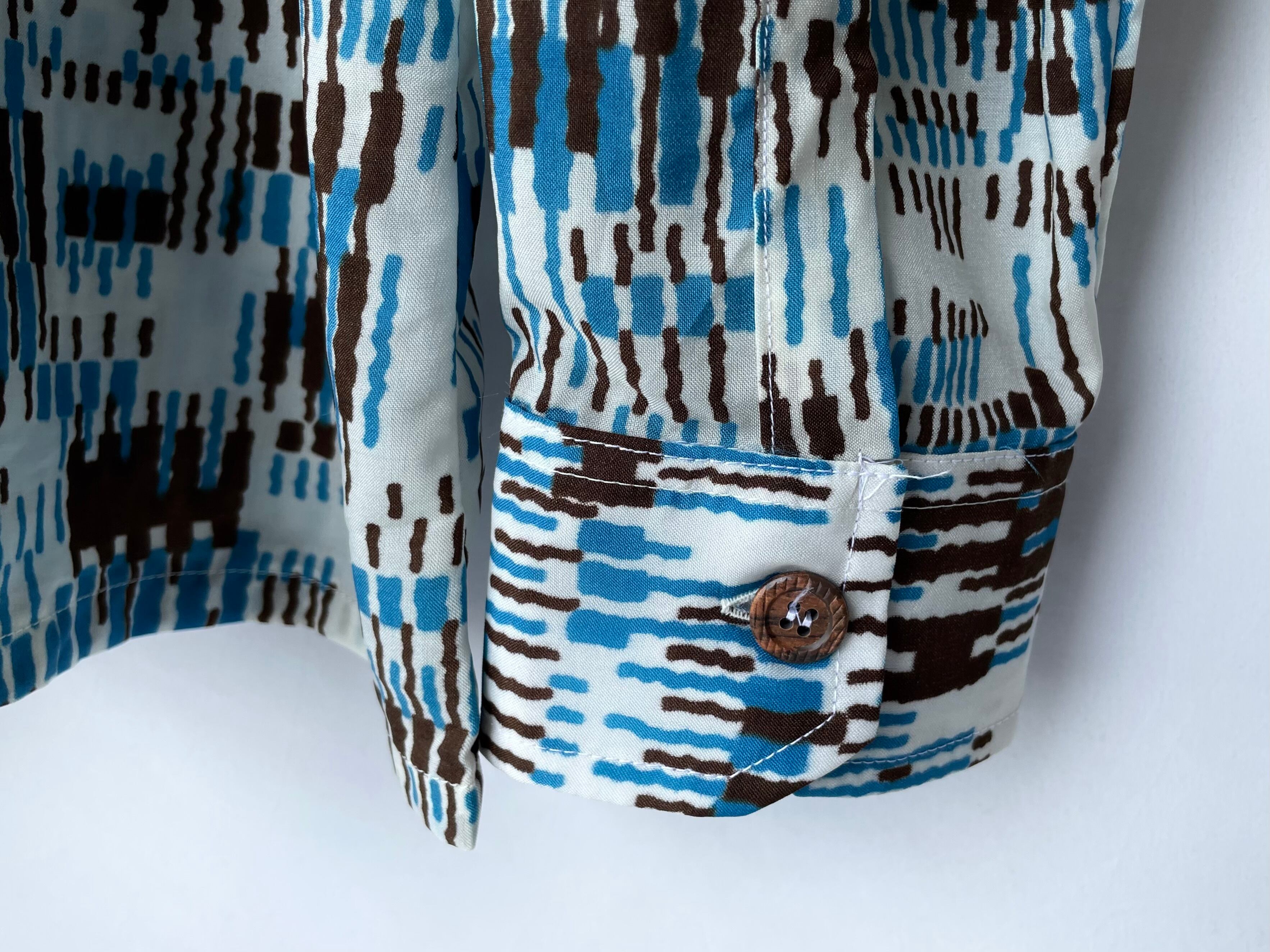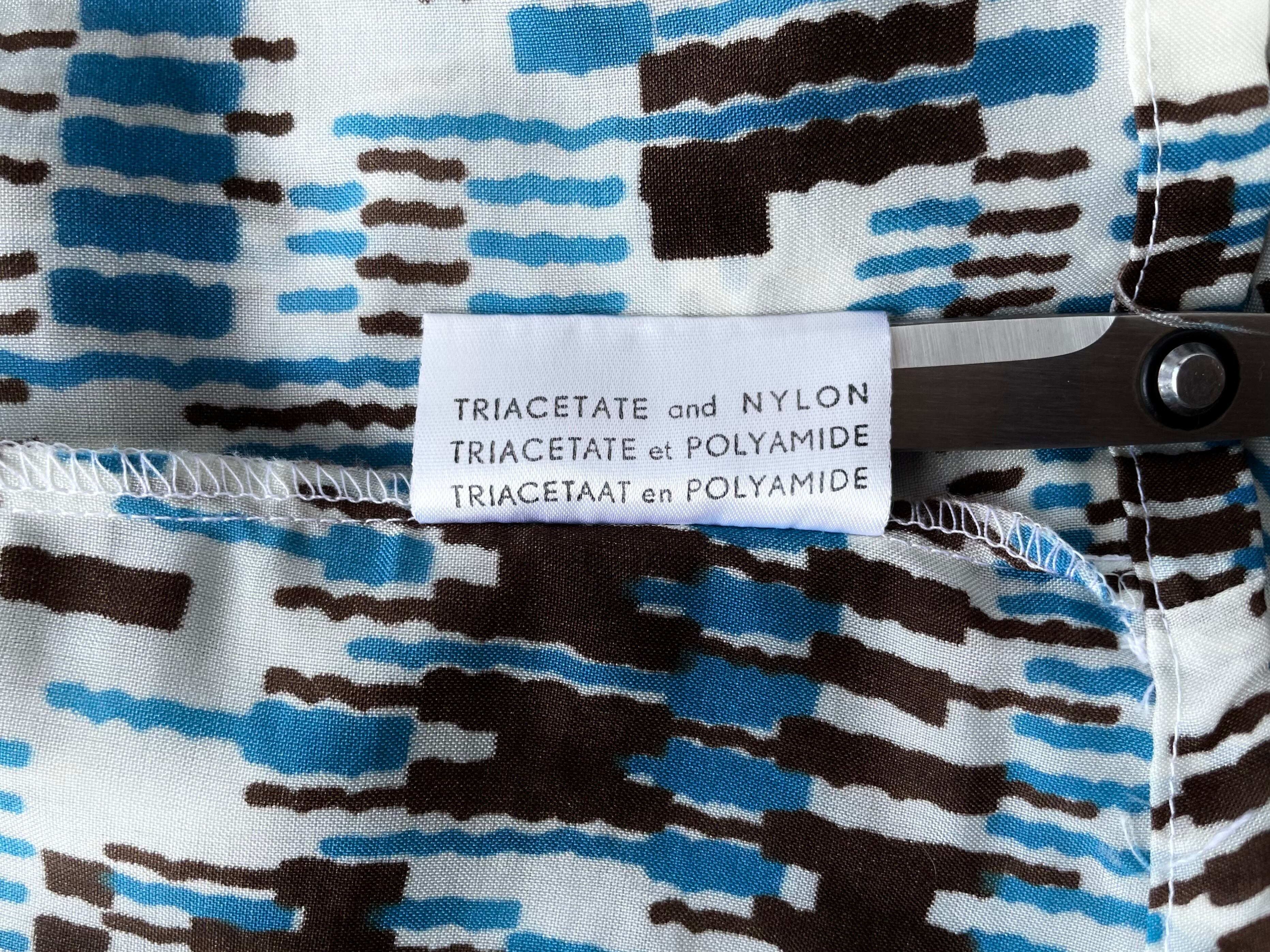 A white/brown/light blue all-over pattern fabric made of high-density triacetate/nylon.