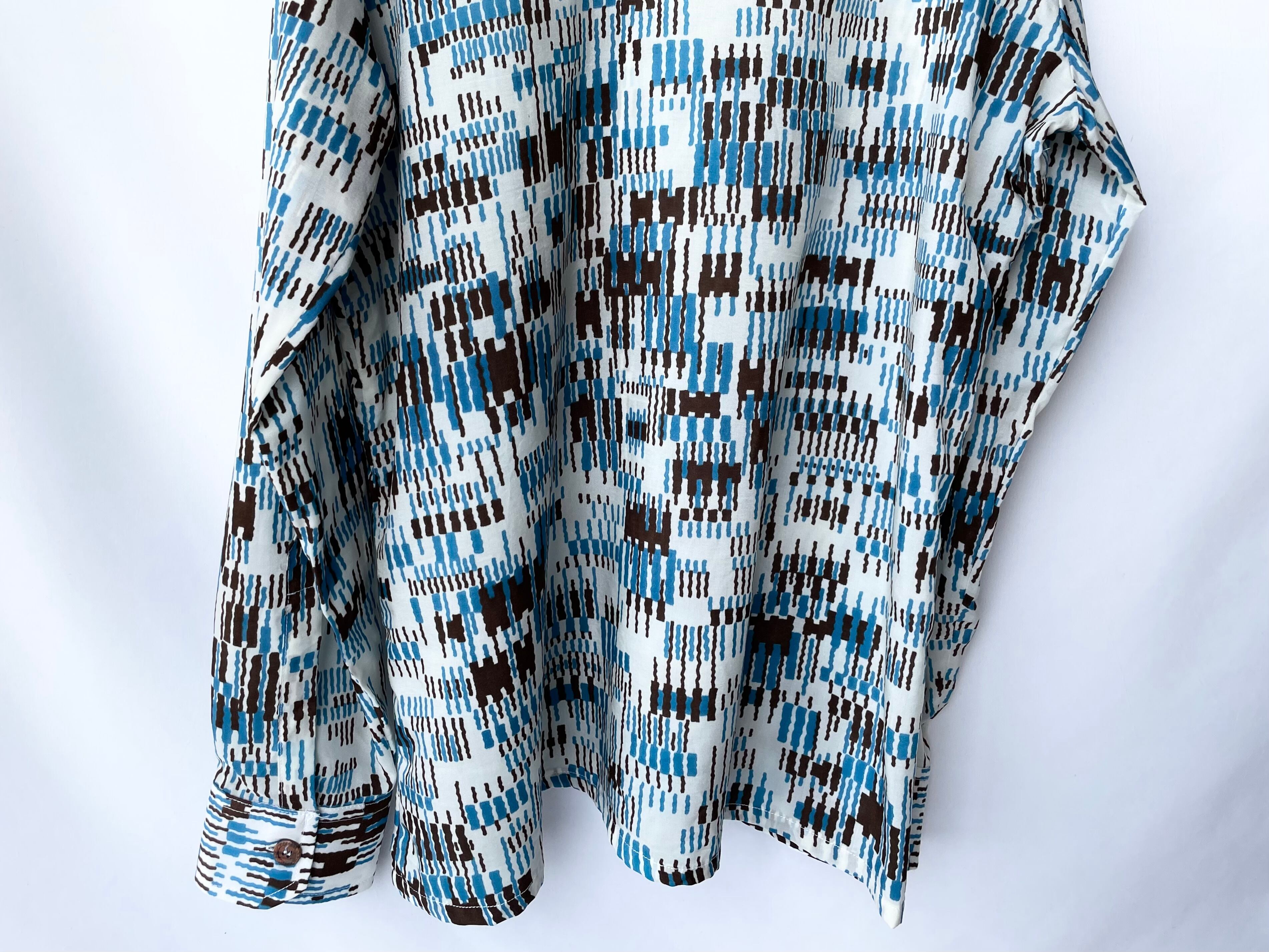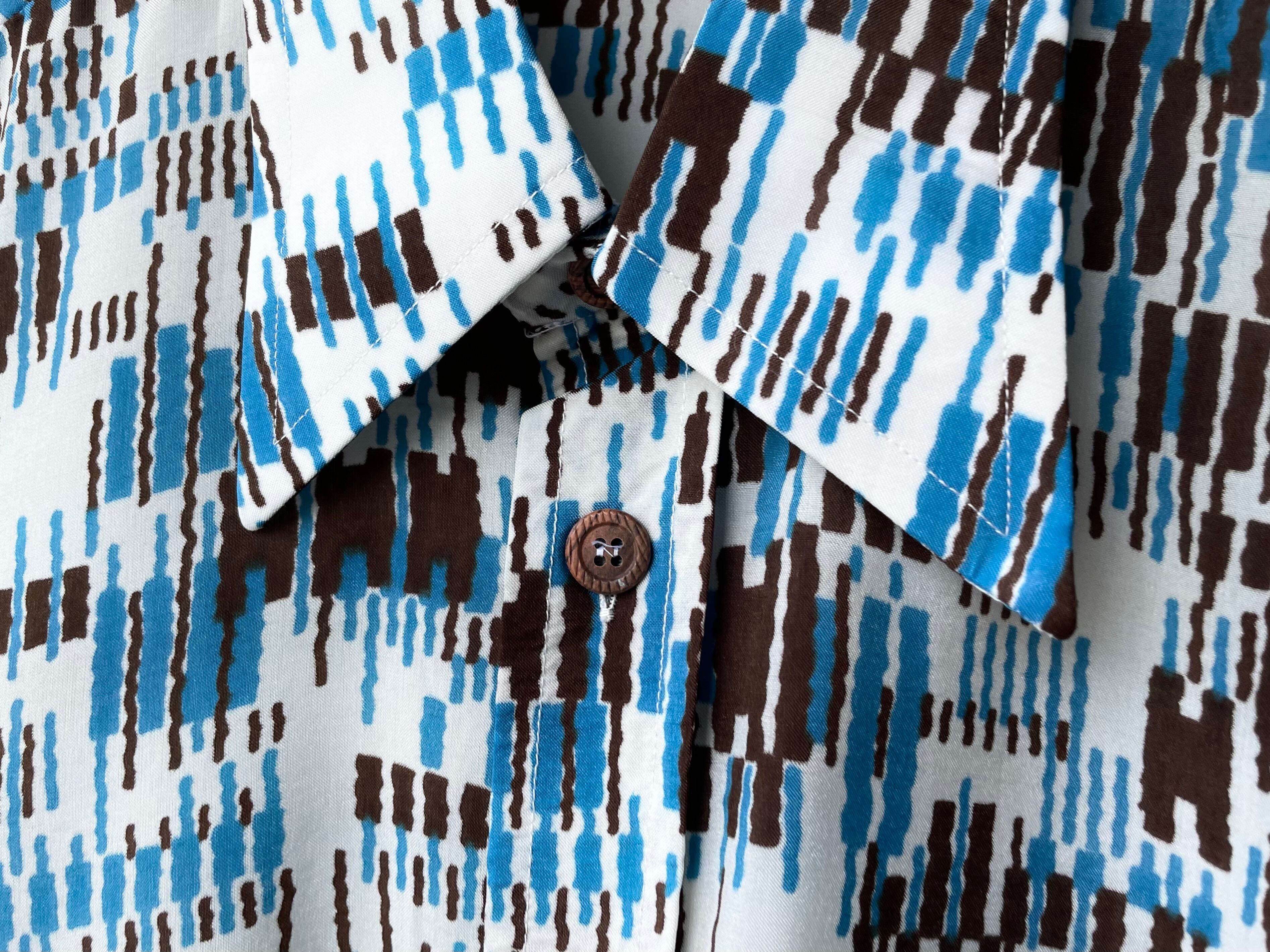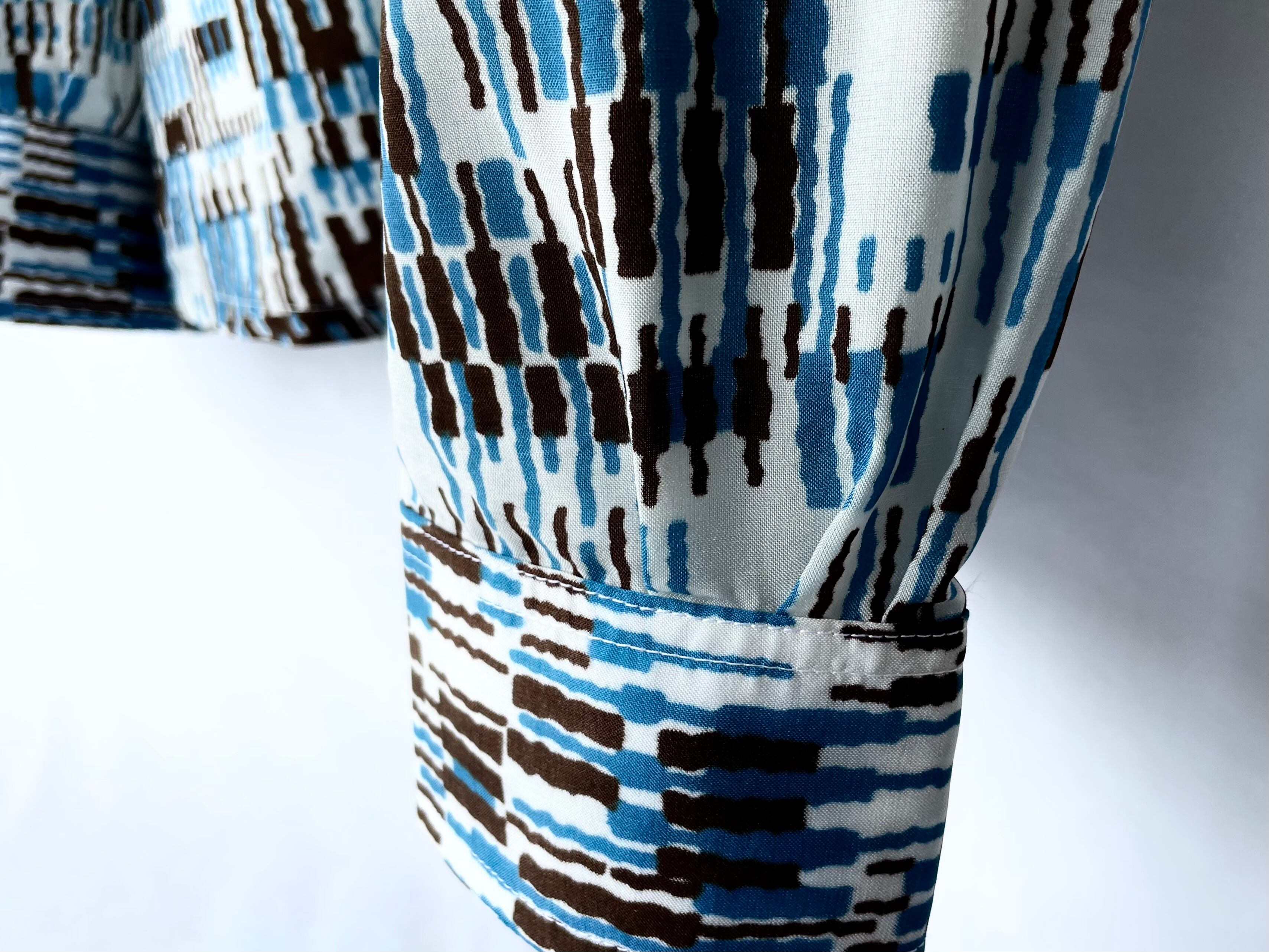 A white/brown/light blue all-over pattern fabric made of high-density triacetate/nylon.