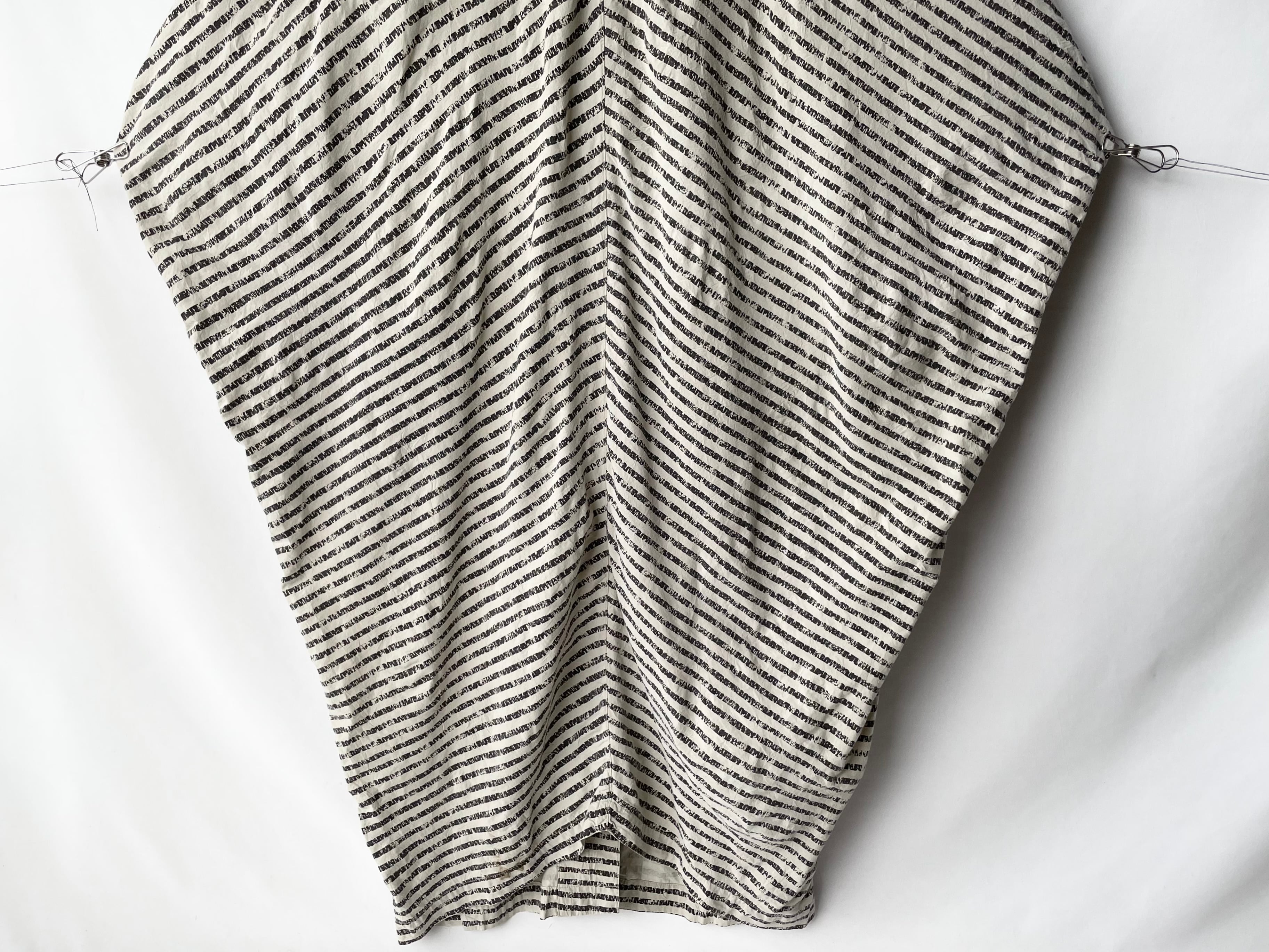 The armholes are formed by opening the shoulder line wide, creating a unique design that causes the fabric under the armpits to loosen unnaturally.