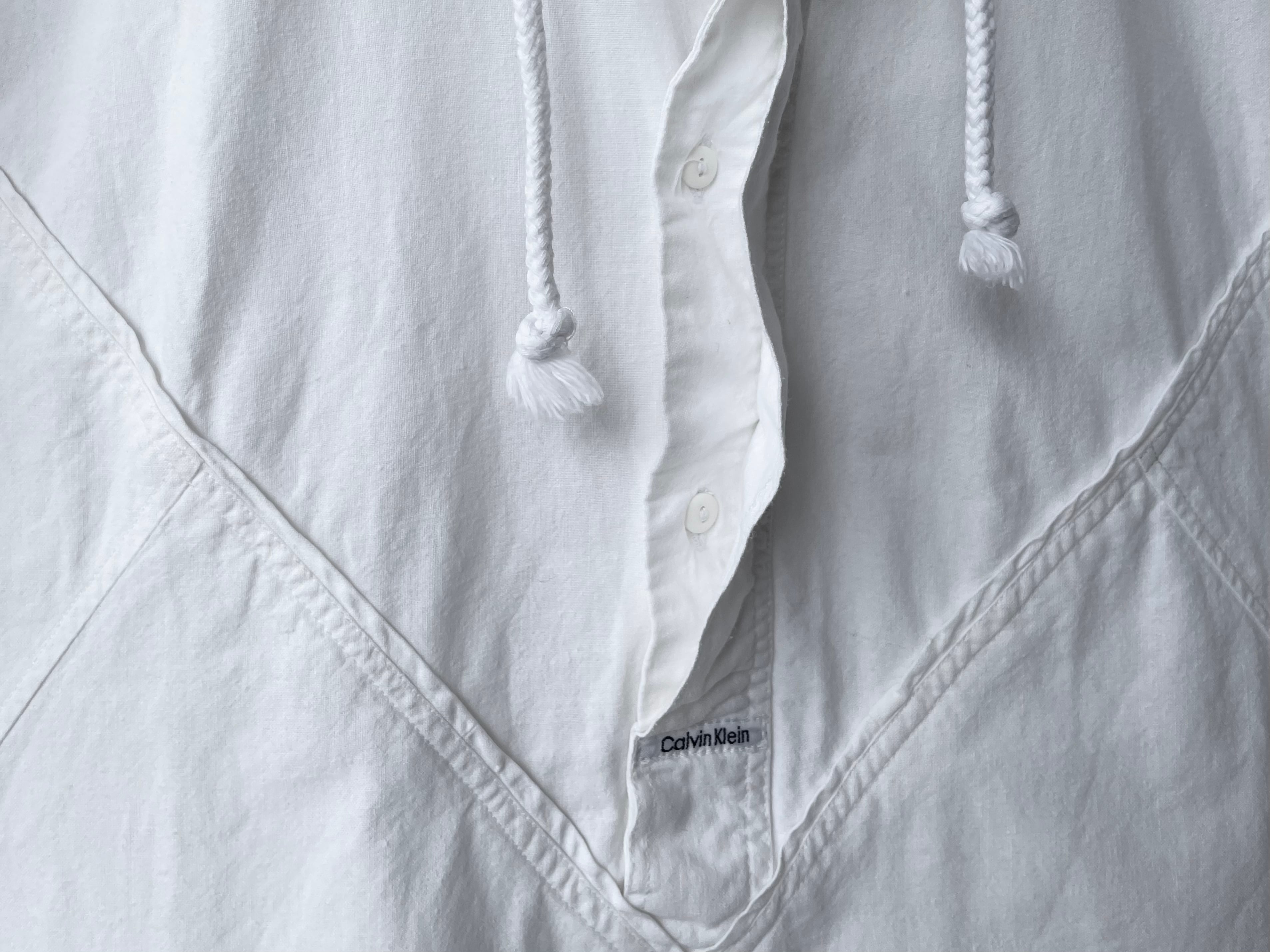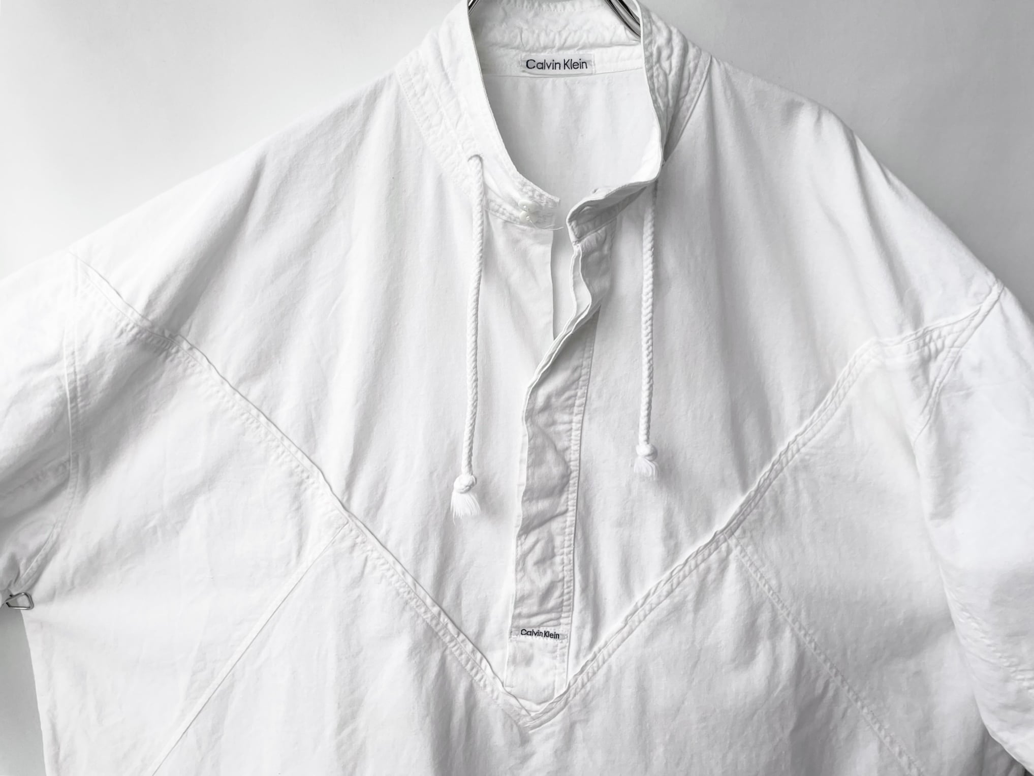 首周りにドローコードが通る、首元2連ボタンのスタンドカラー。