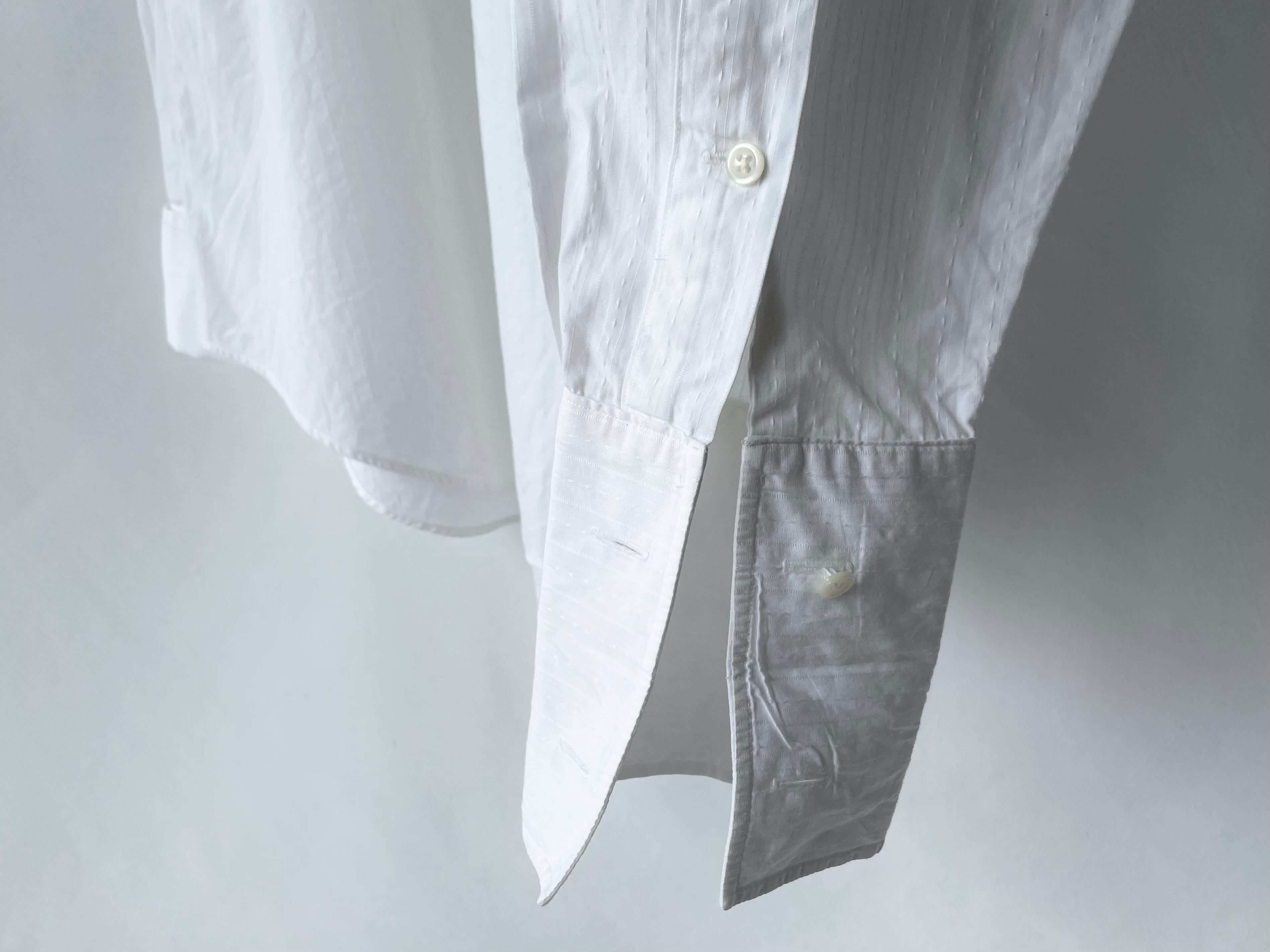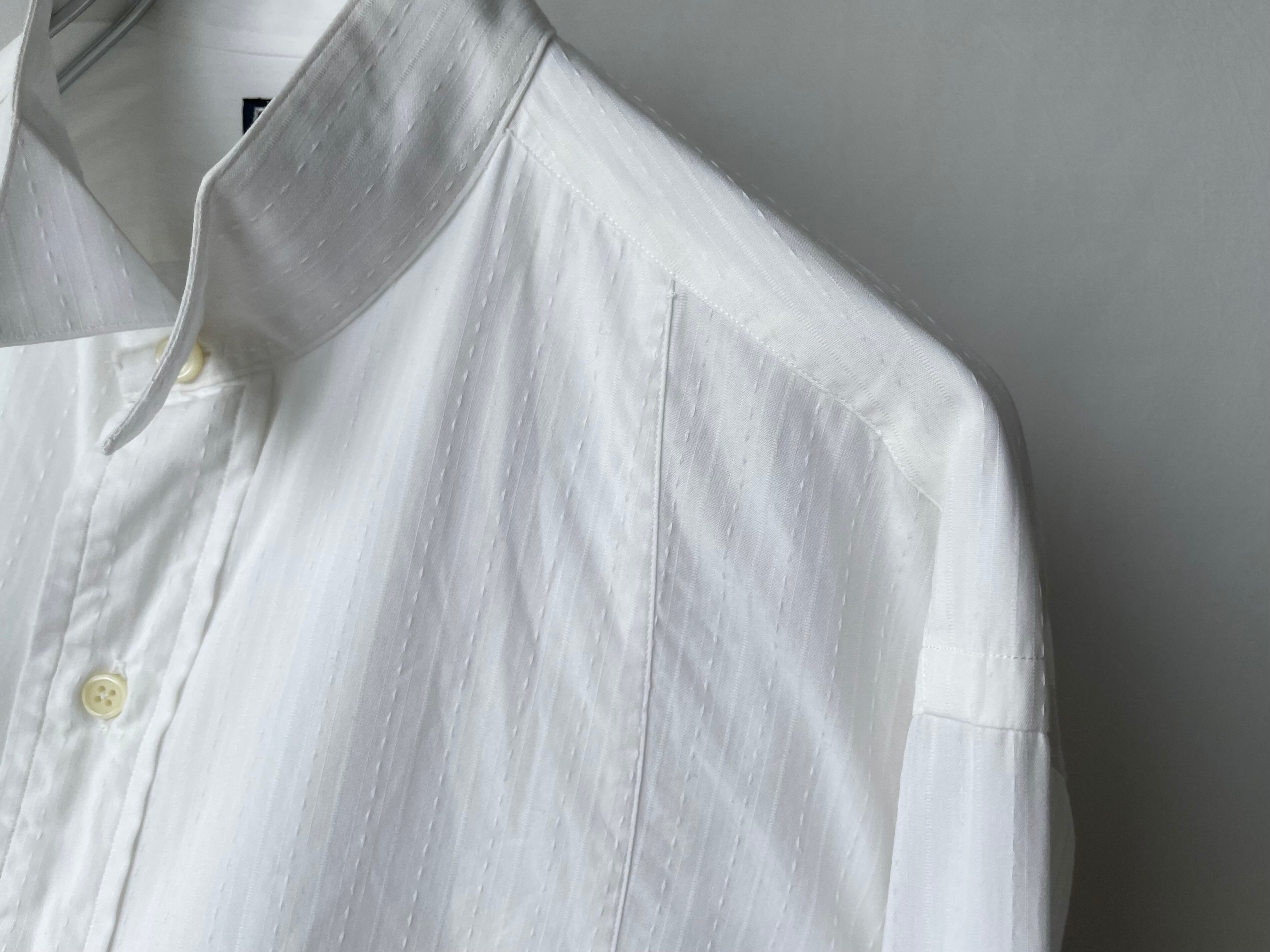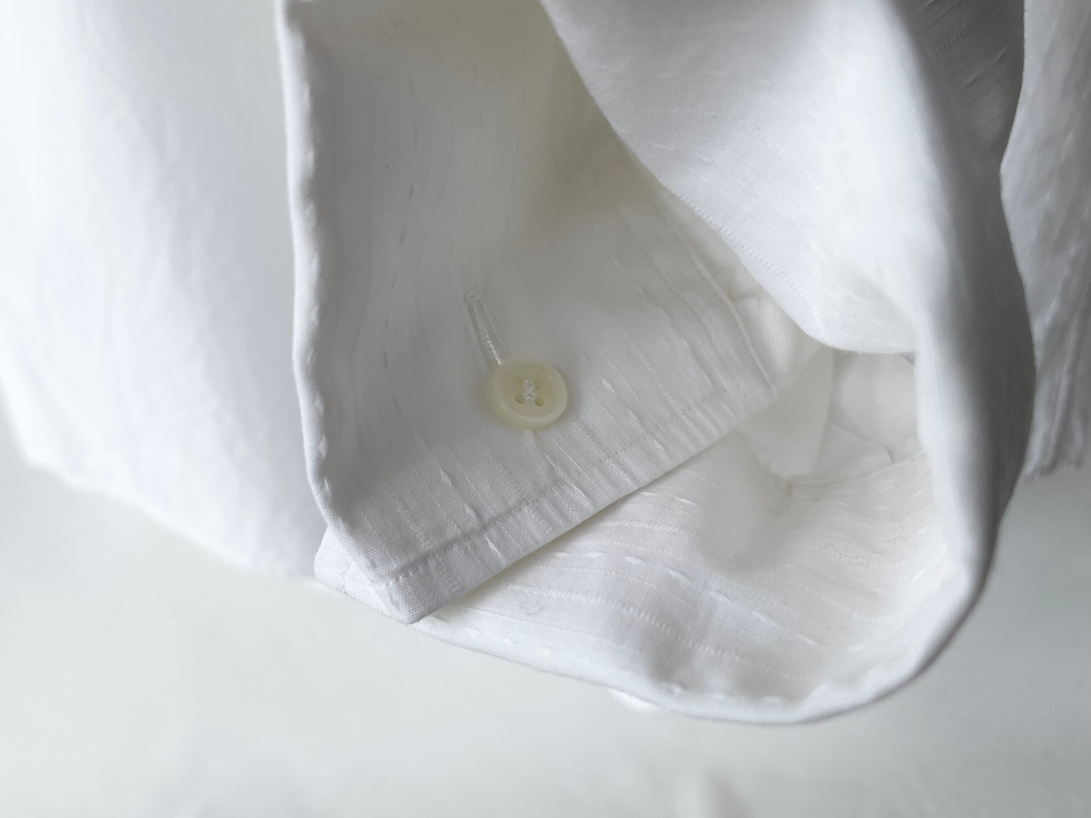 襟高のあるウイングカラーに袖先はダブルカフス。
