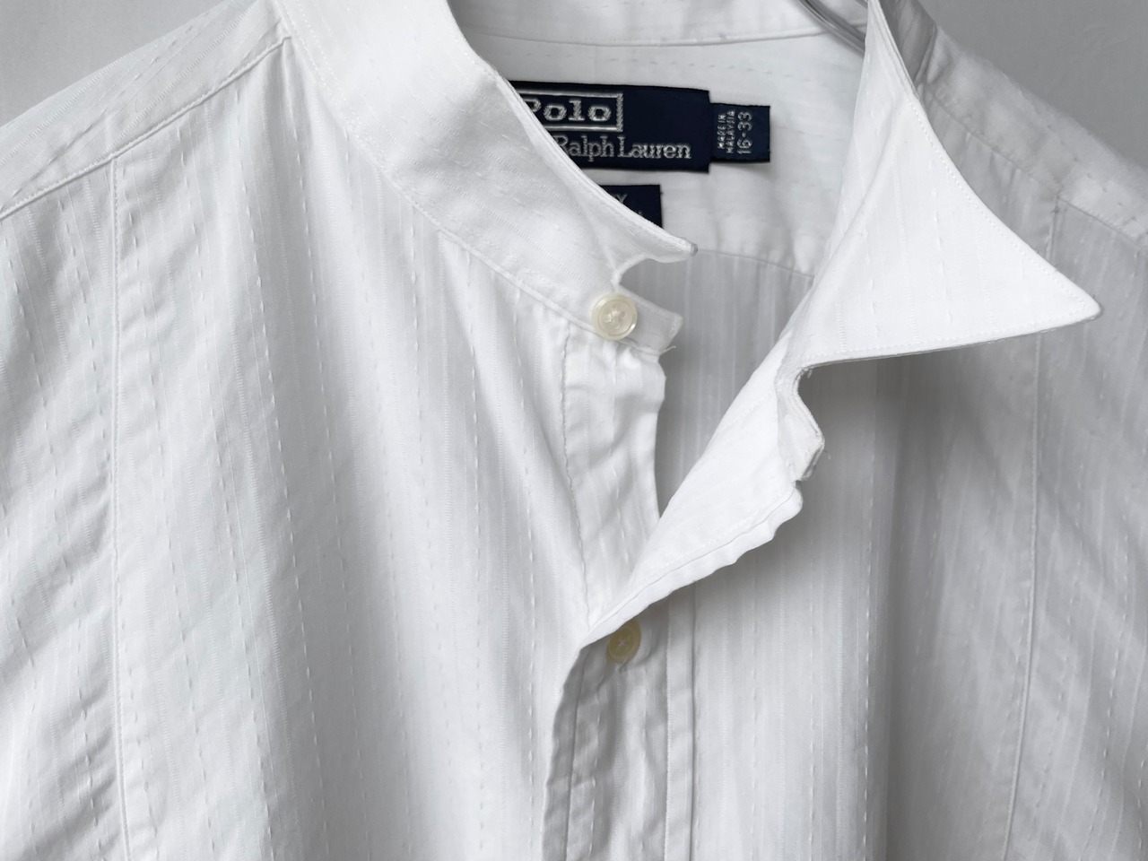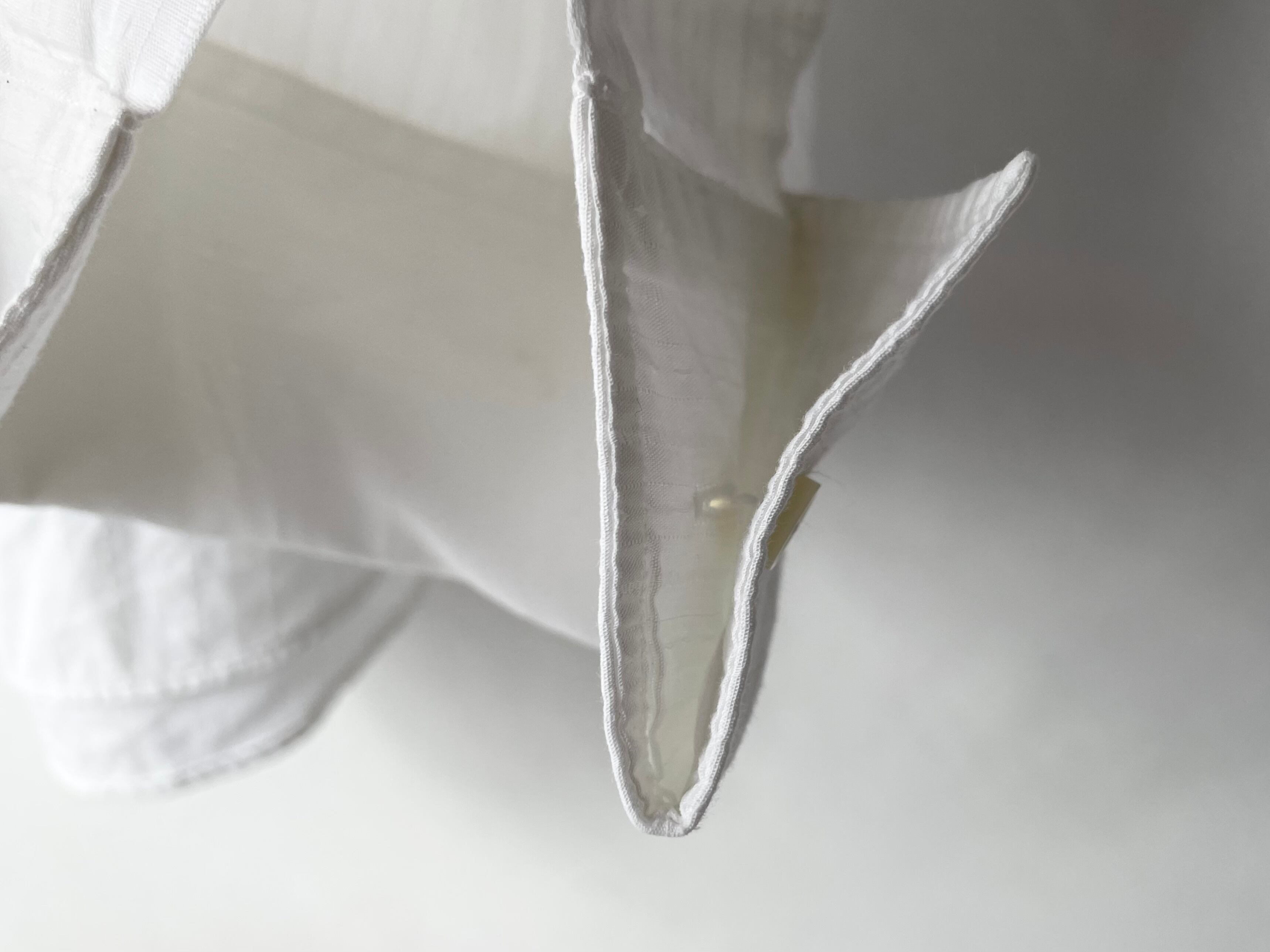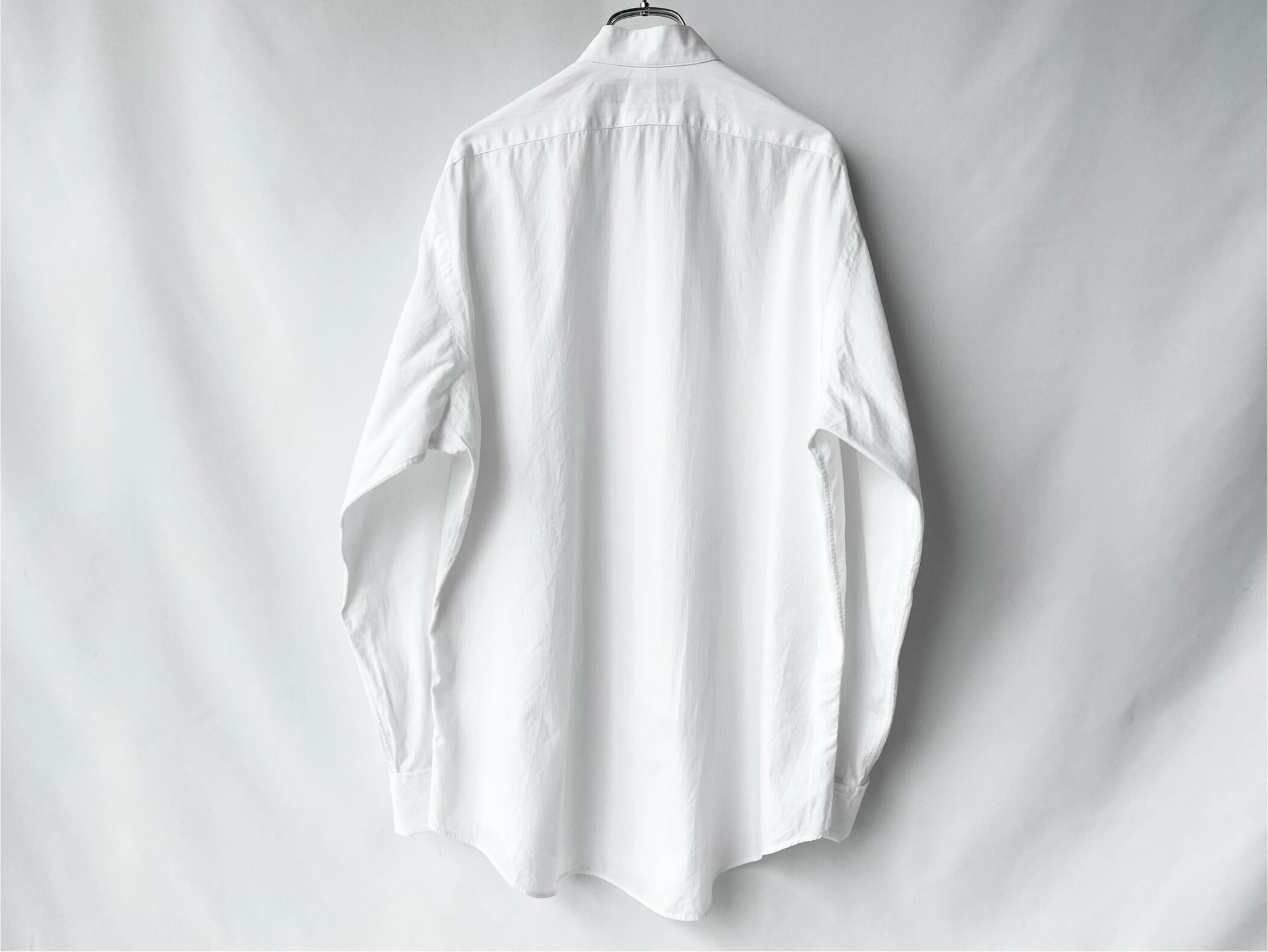 襟高のあるウイングカラーに袖先はダブルカフス。