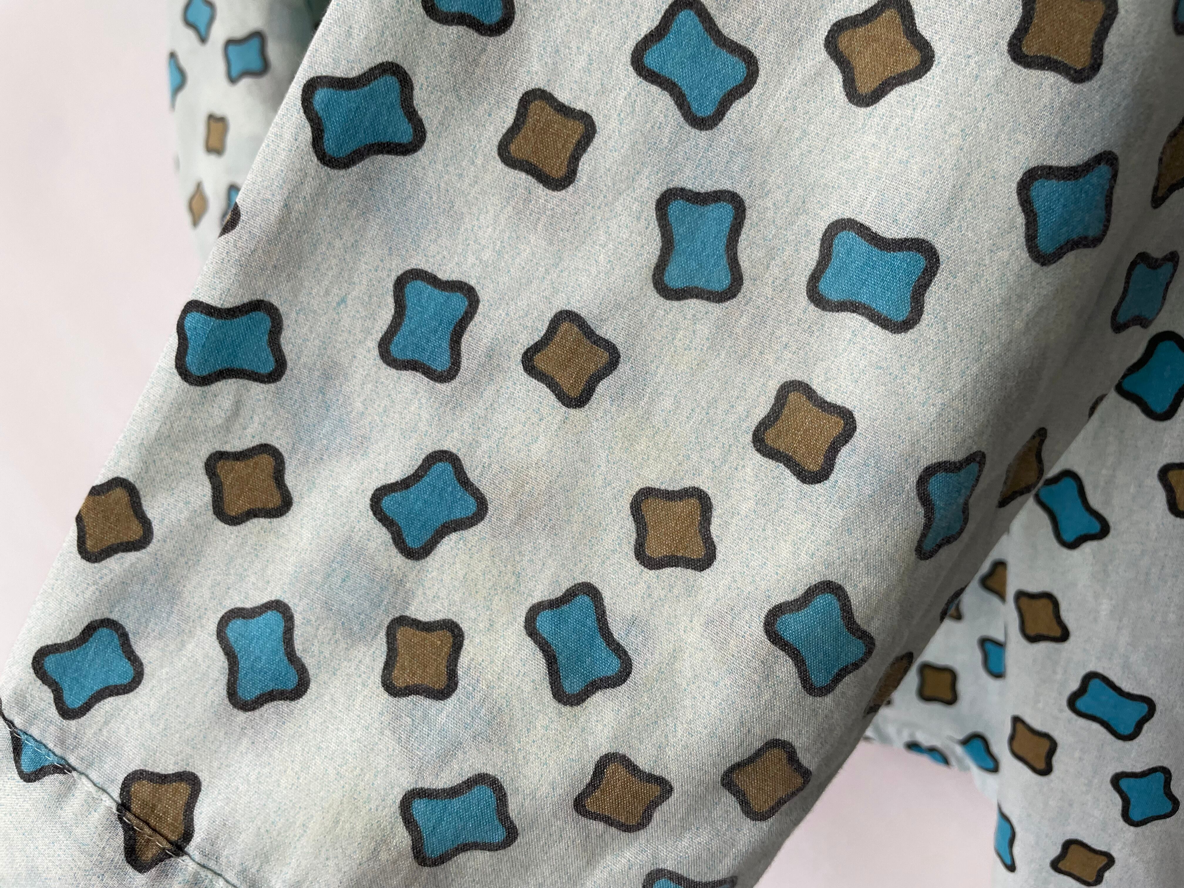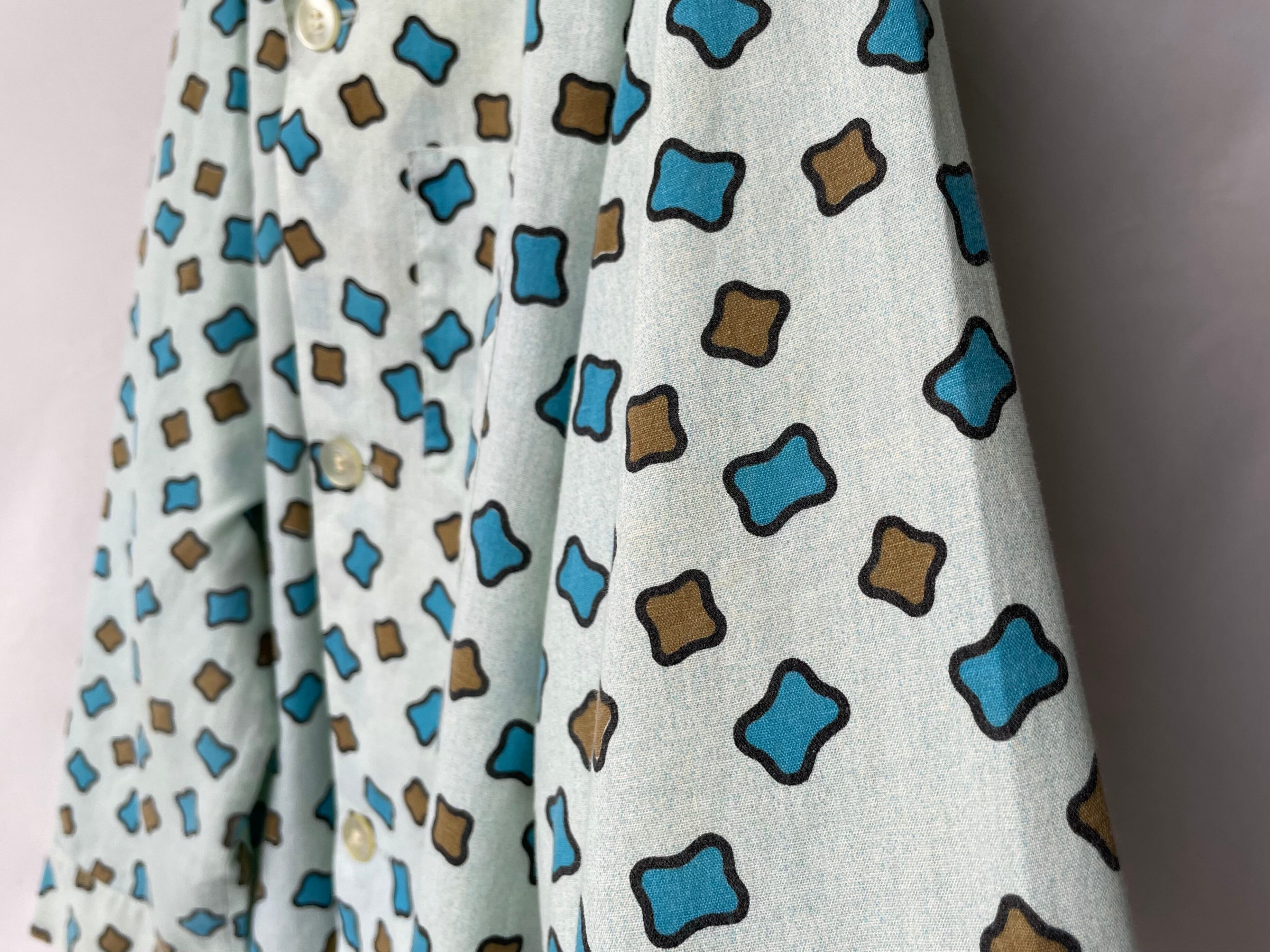 ほんのりと色付いた淡いブルーグリーンをベースに、濃い色の茶×ブルーの歪んだ斑点が乗った好配色の総柄。