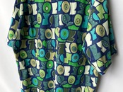 A deep navy blue base with a geometric pattern in muted blue, green, and natural tones.