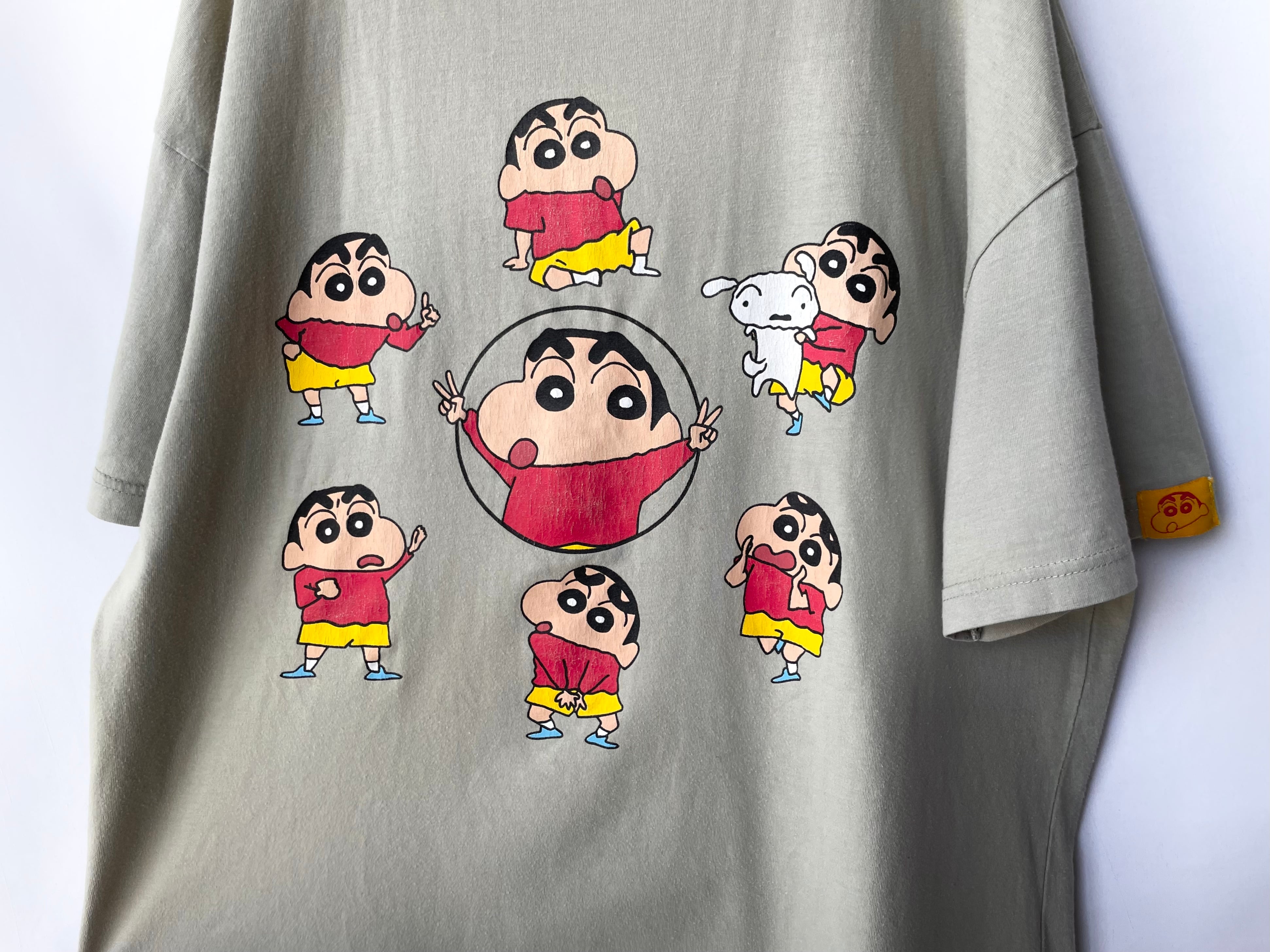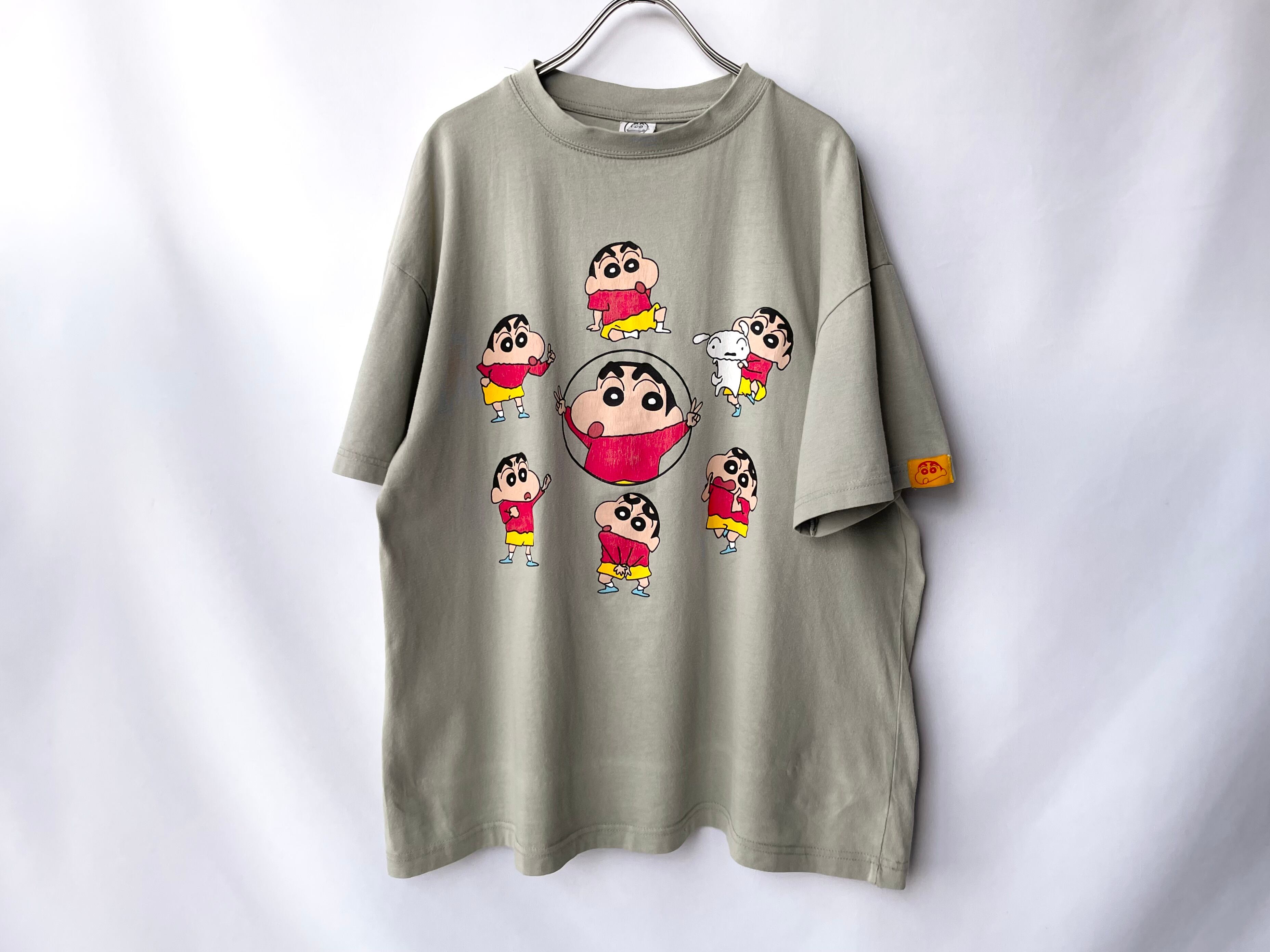 淡いカーキベージュボディに、7ポーズのしんちゃんプリント。