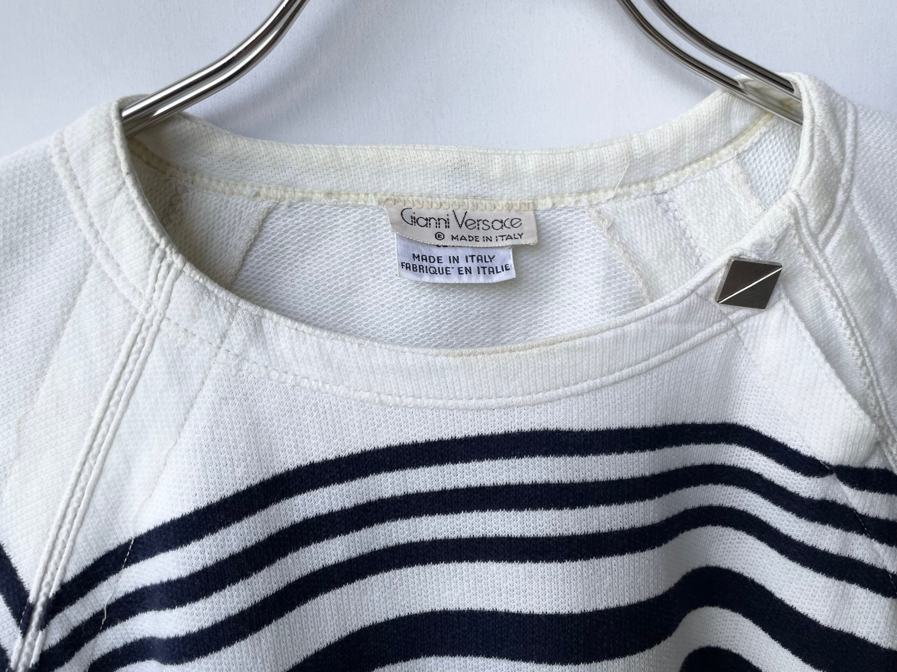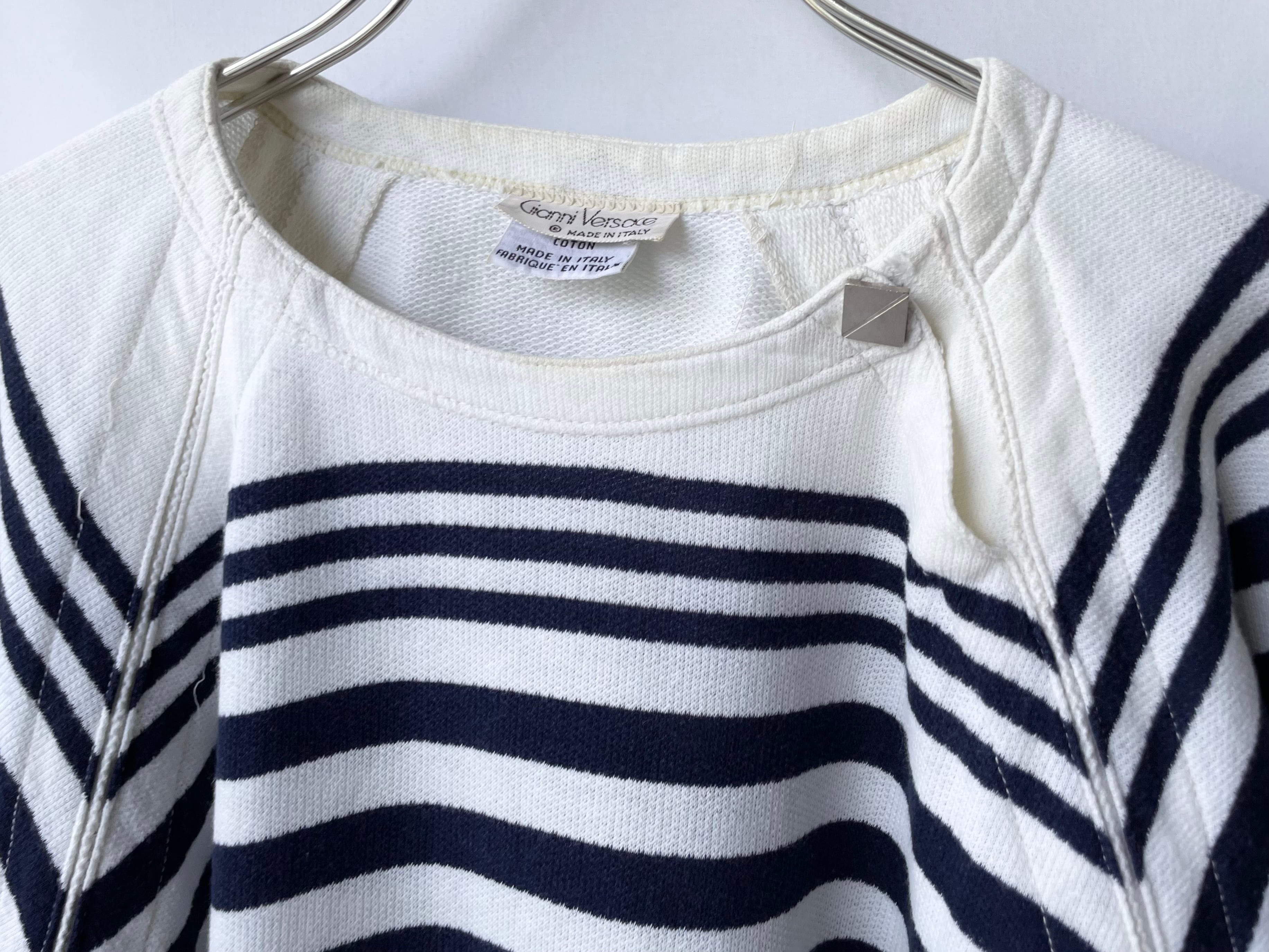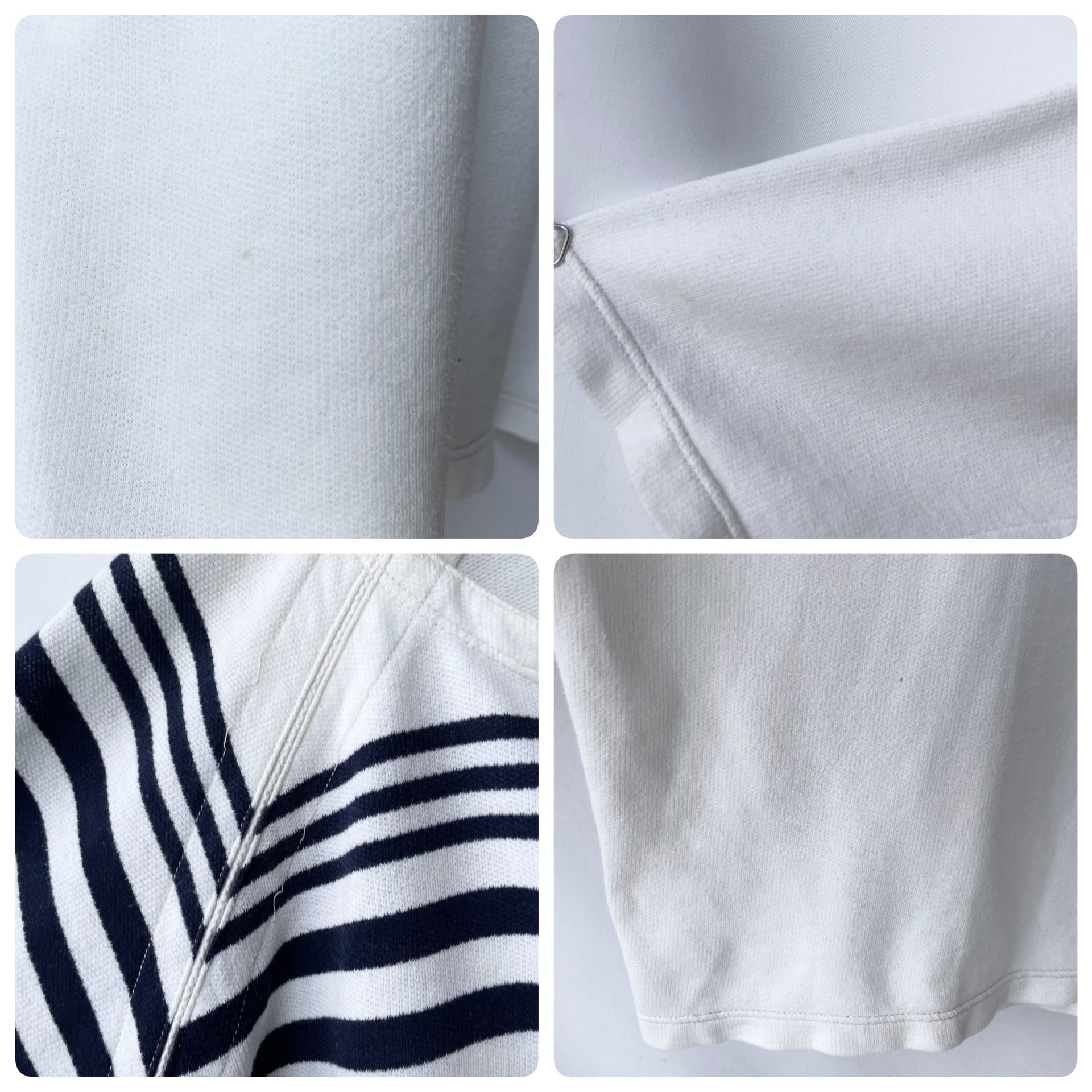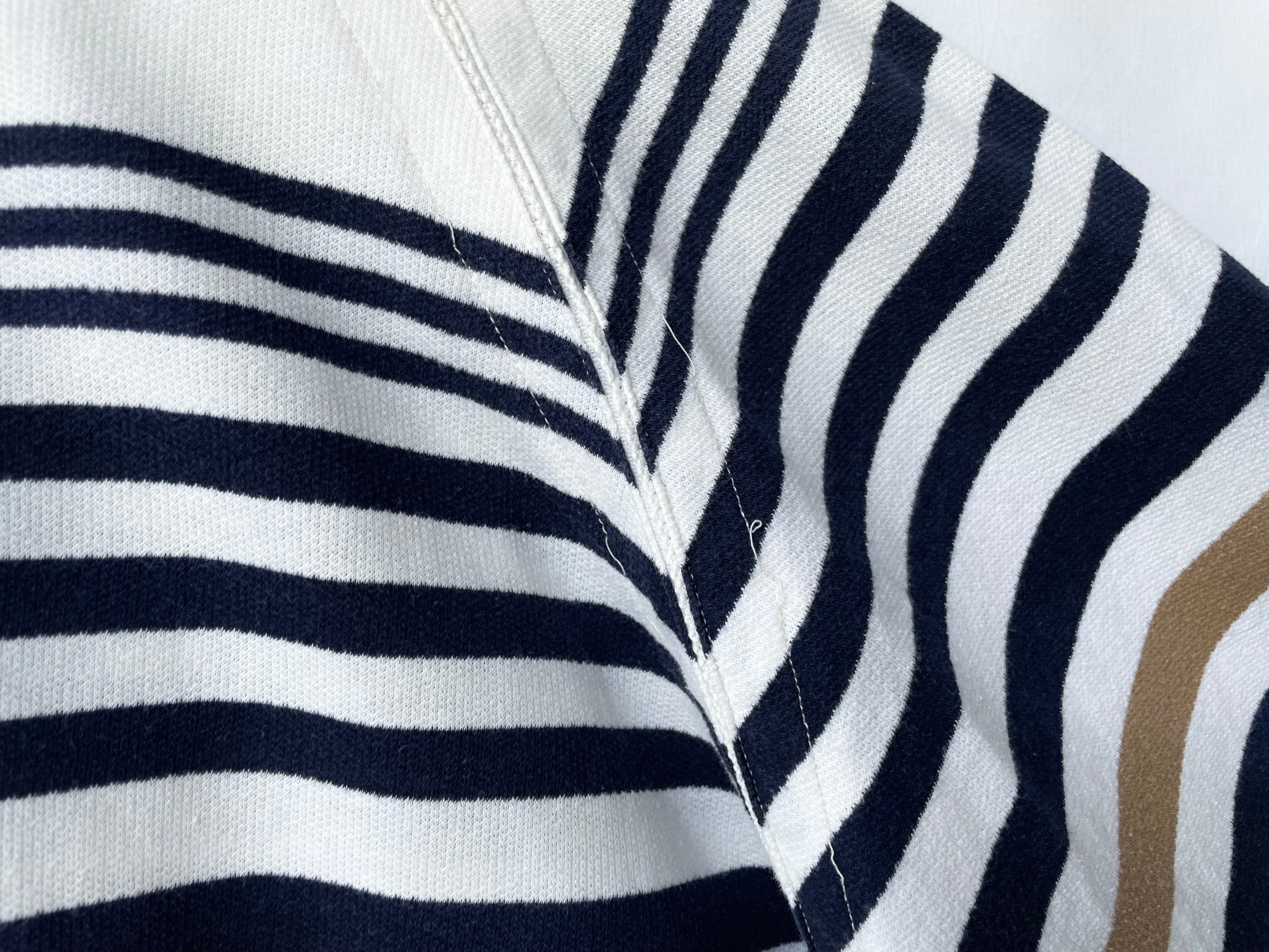ナチュラルホワイトベースに濃紺/イエローブラウンの変則ボーダー。