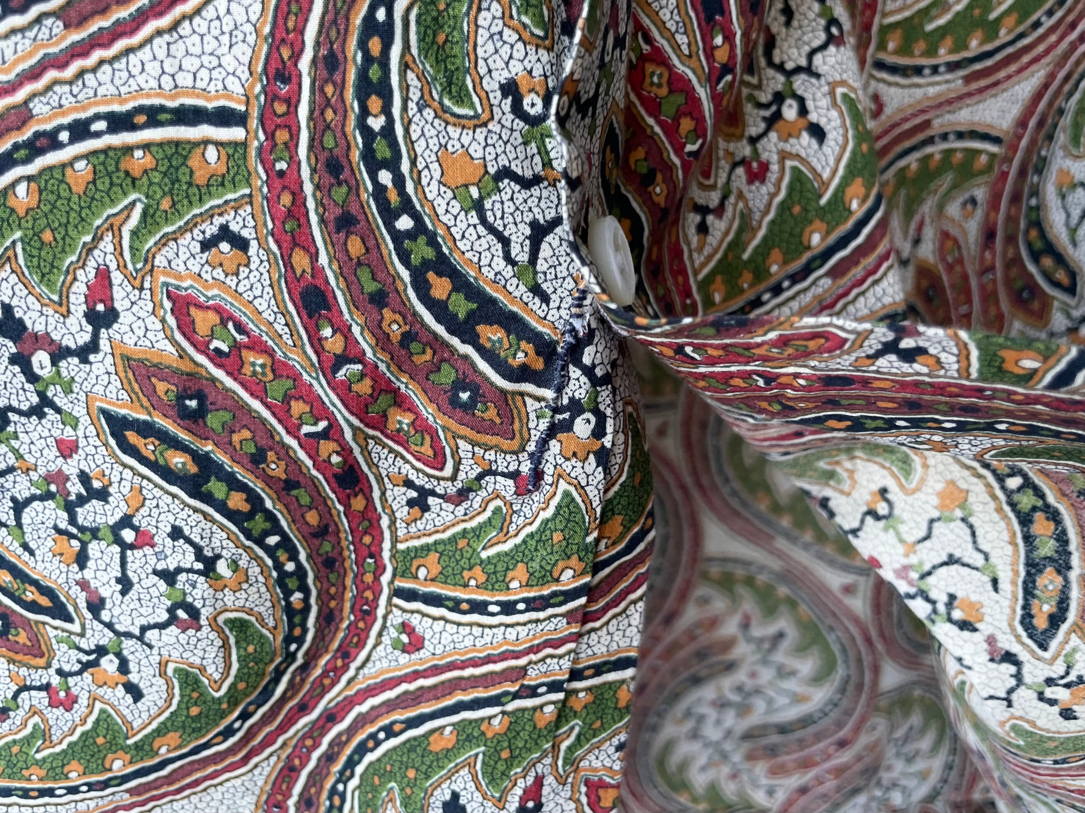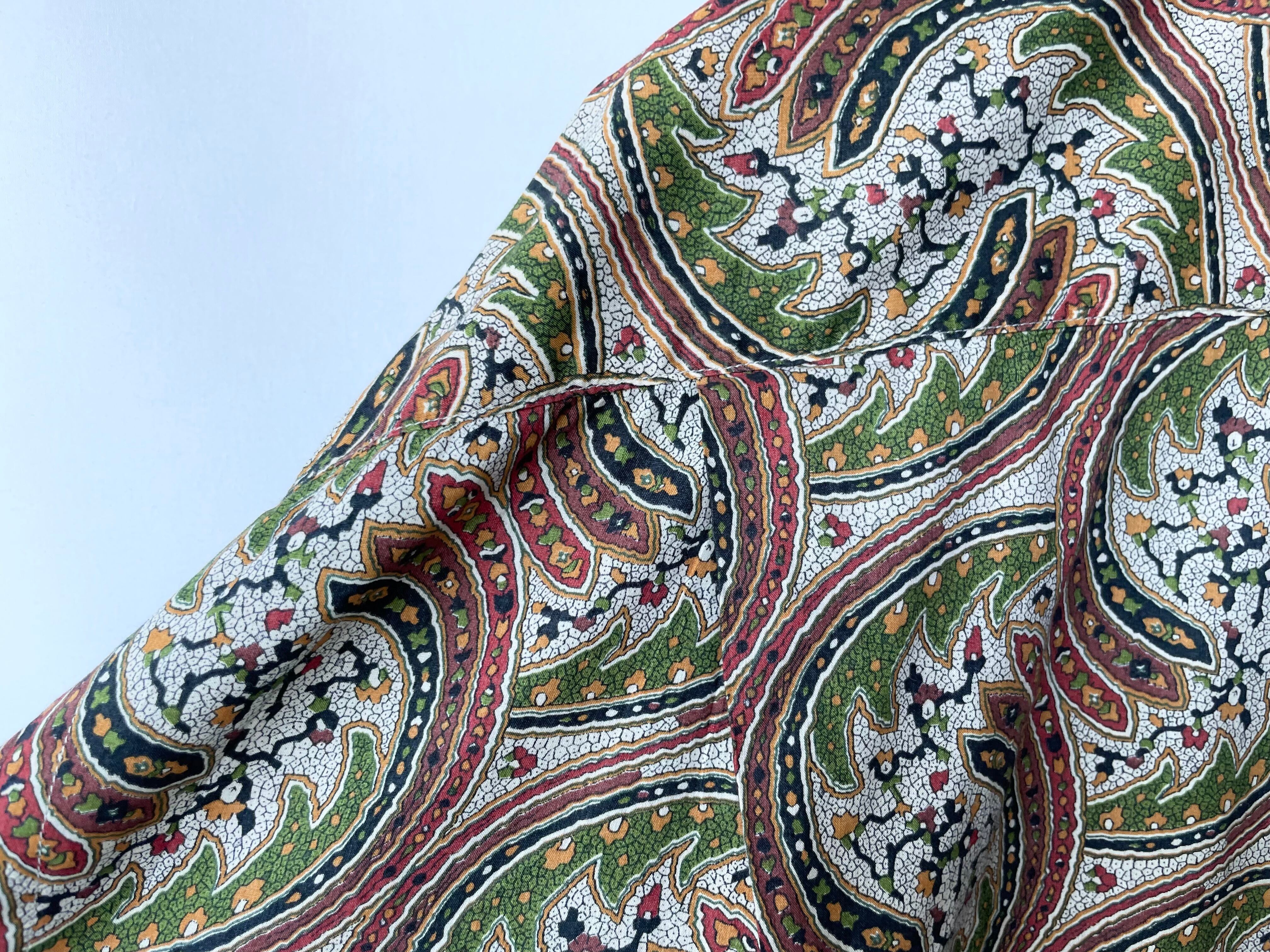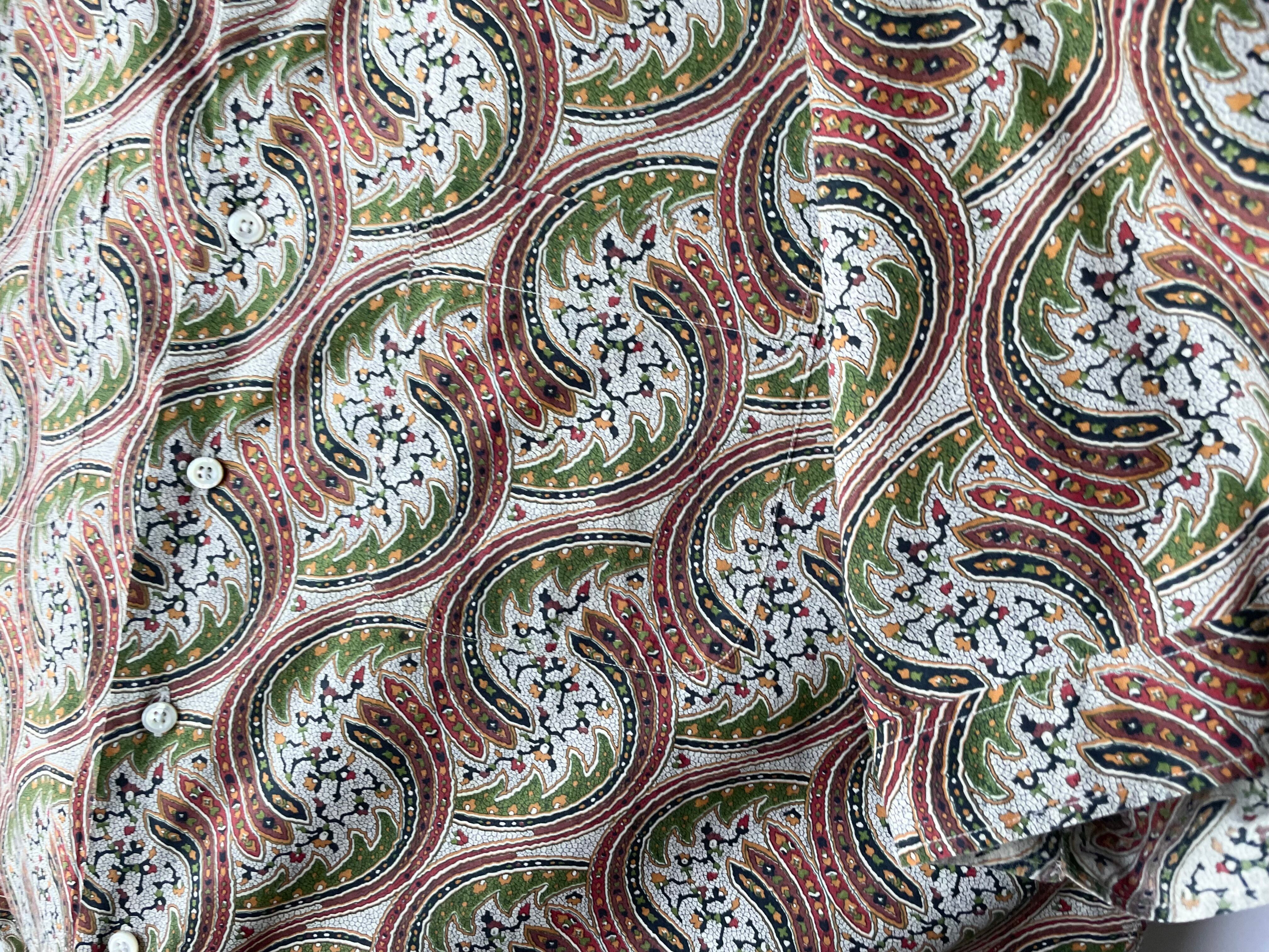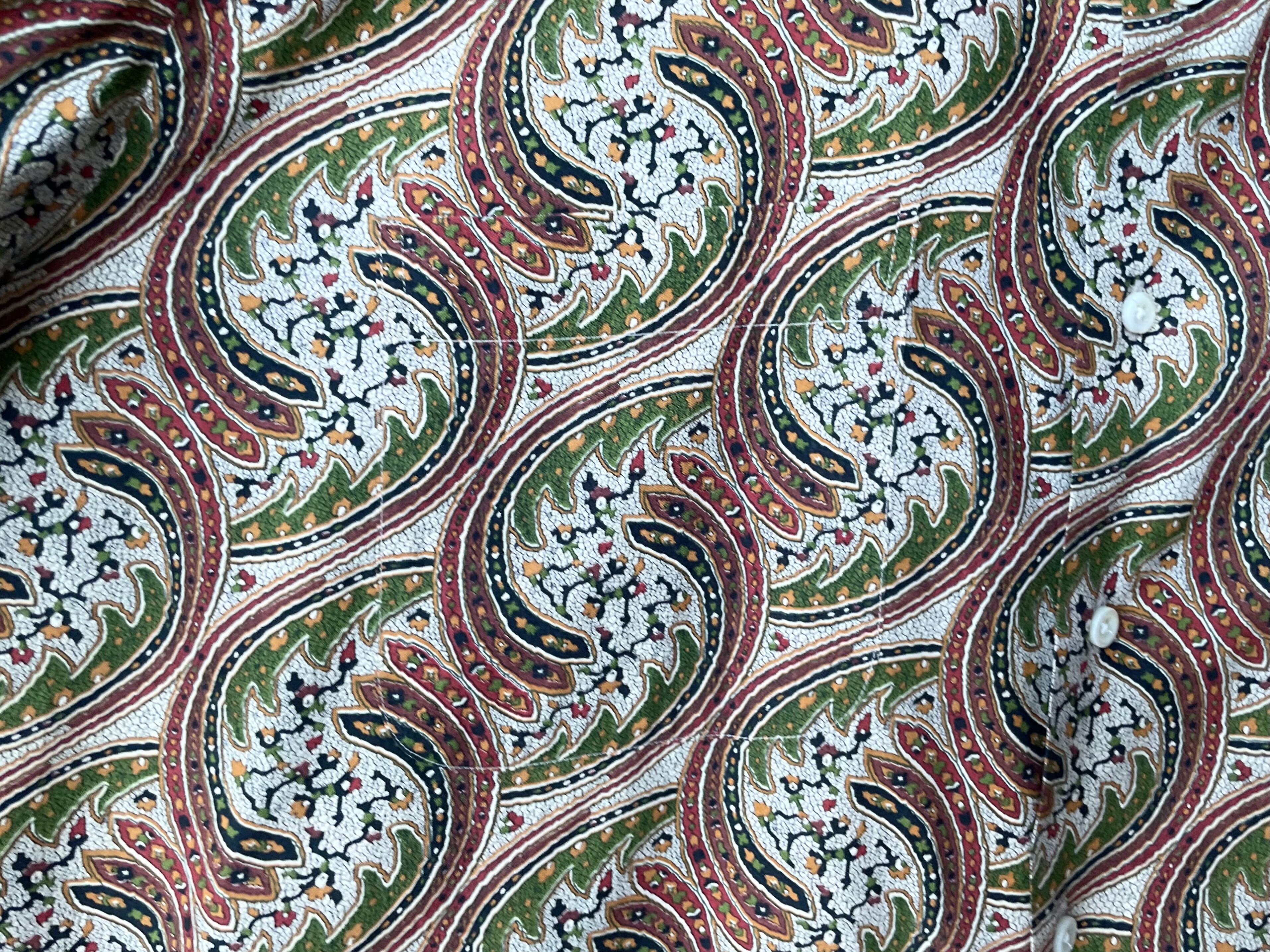 こちらは細かなペイズリーの様な、緑/朱ベースの華やかな生地。