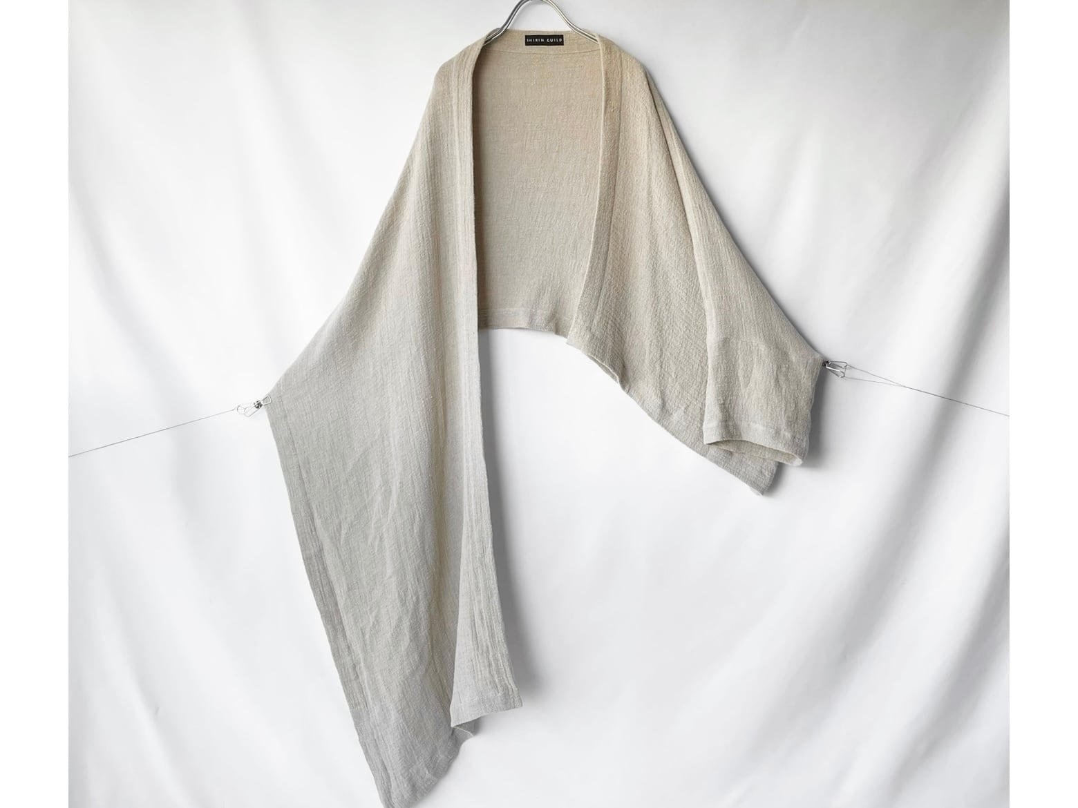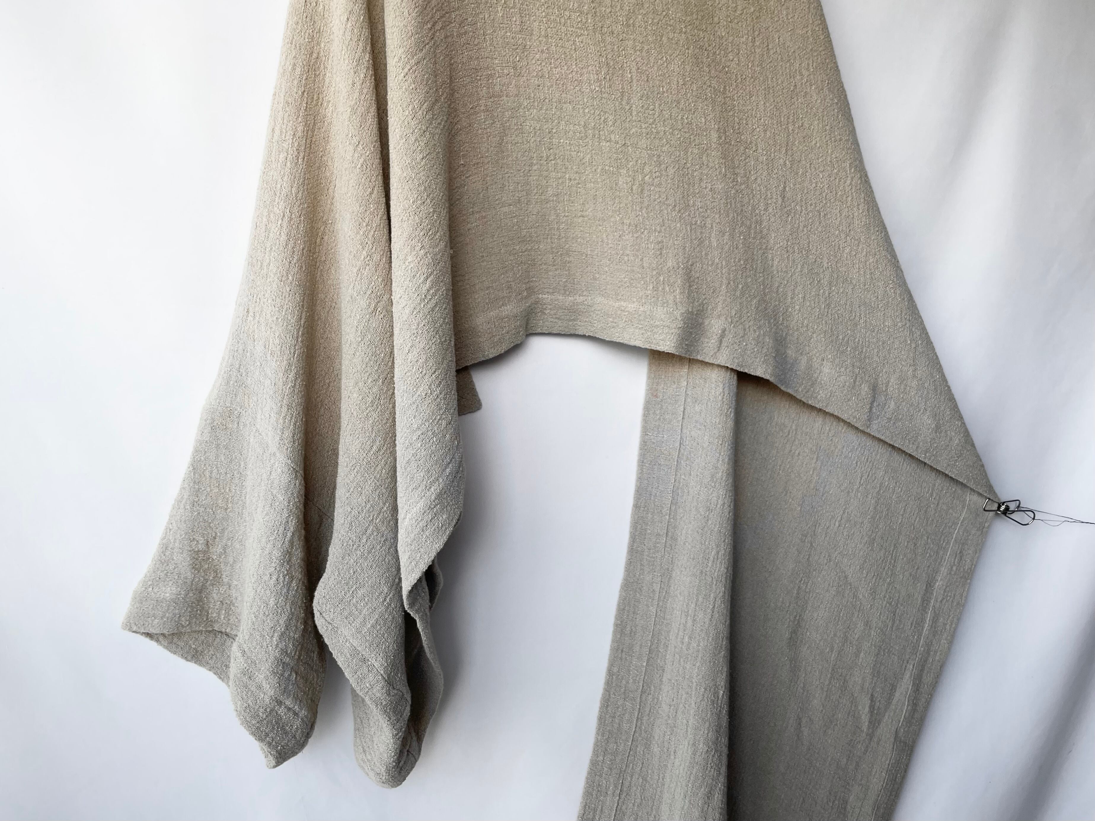 大判なストールの様に肩に乗せたり首に巻きつけても様になる、工夫が楽しい洋服。
