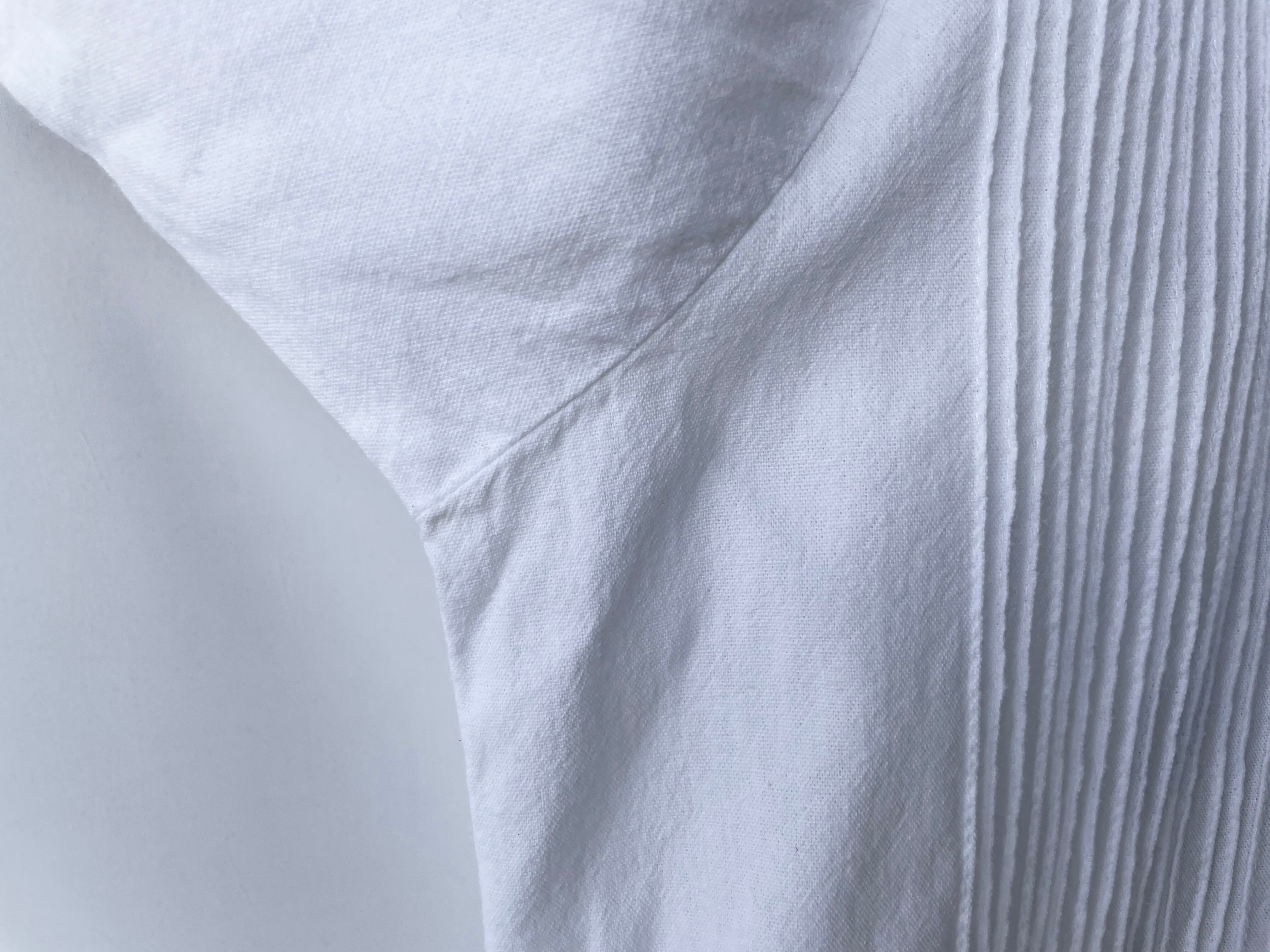 生地を細かく摘んでステッチを乗せた、ラグジュアルなイメージすら抱く素晴らし作り込み。