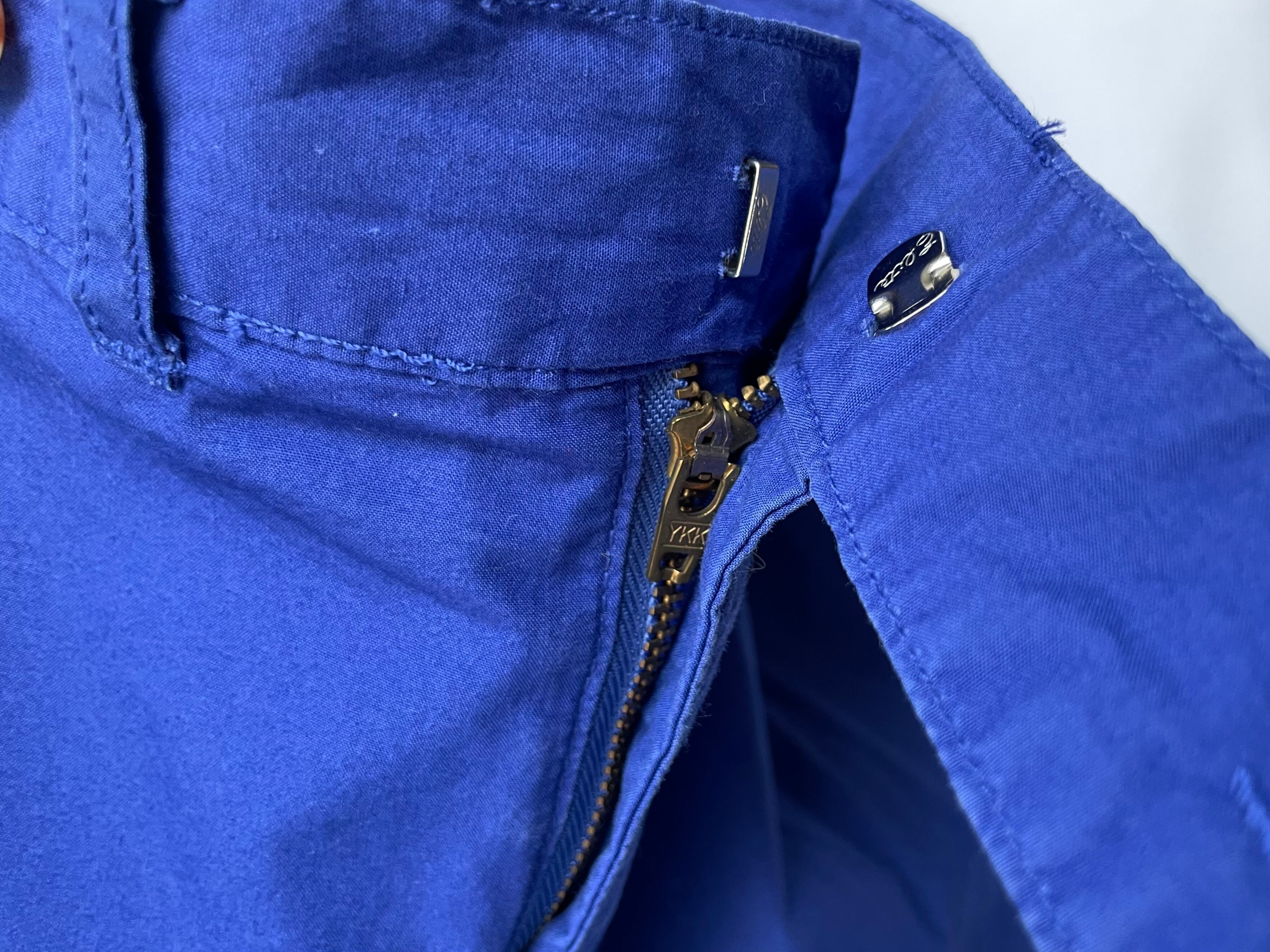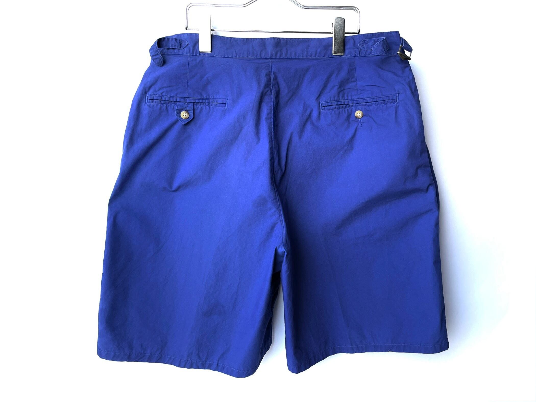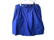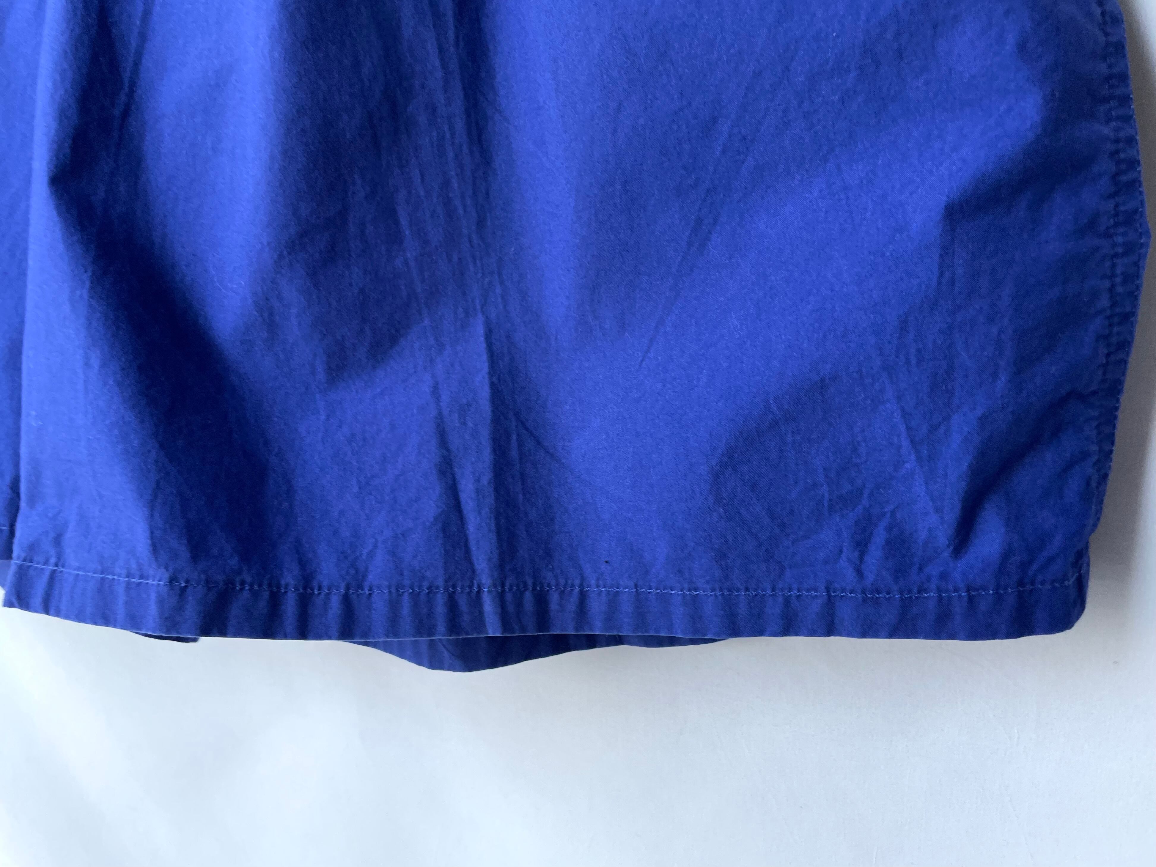 深いブルーのコットンポプリンで仕立てられたワイドショーツ。