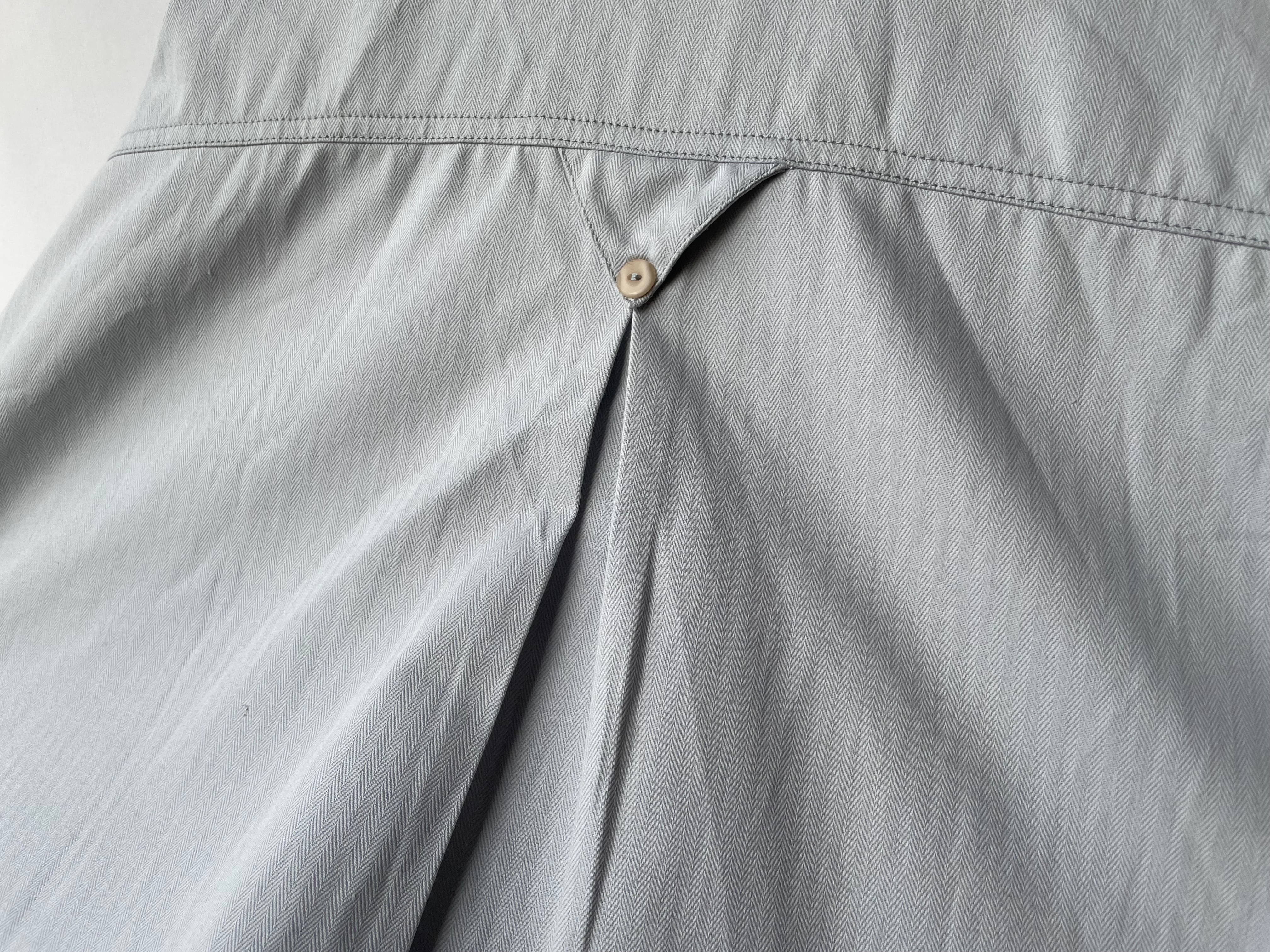 A unique detail is the placket, with a rod-shaped part made from the same fabric with a diagonally cut edge that creates a lidded placket.