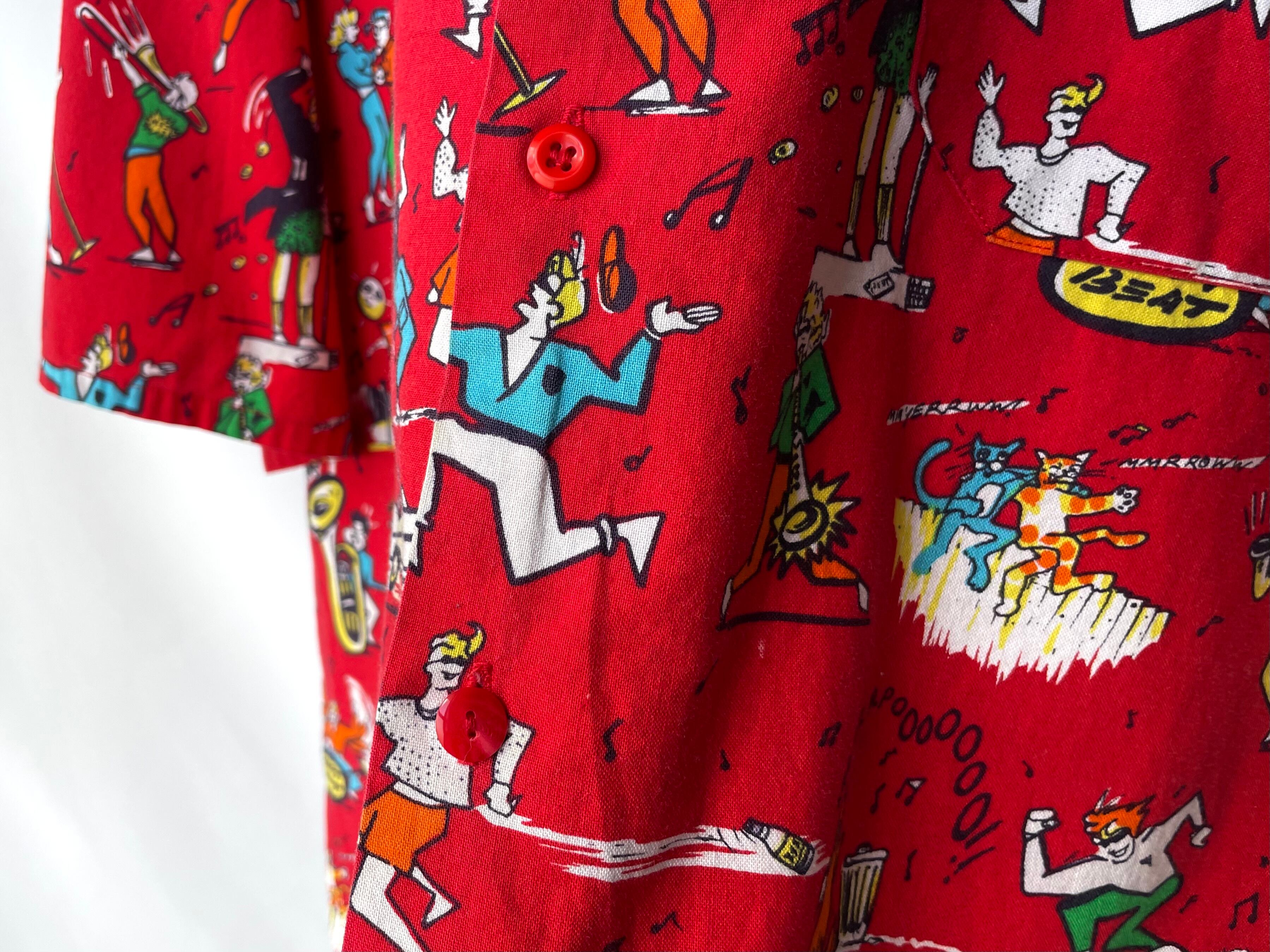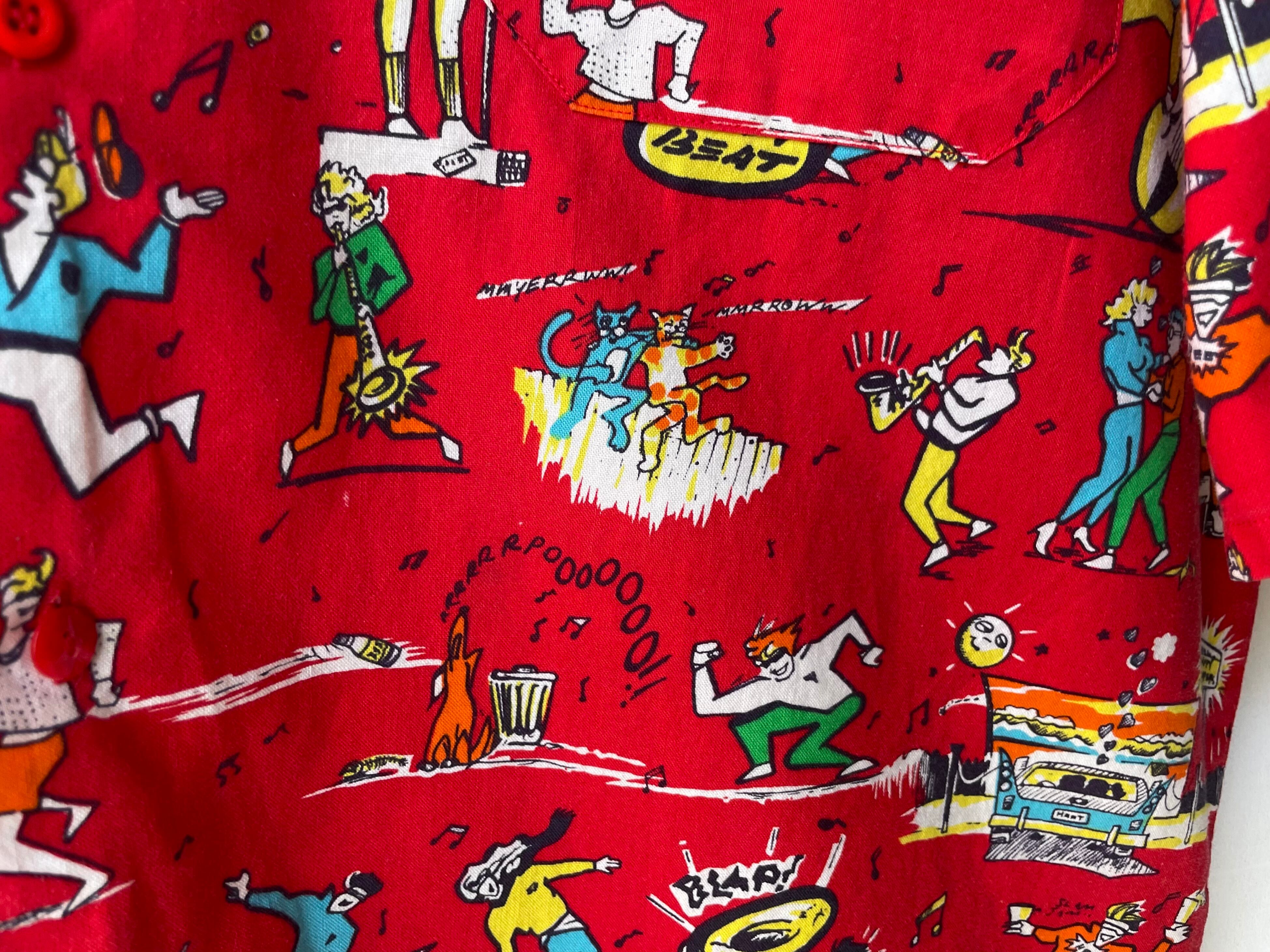 The red body features a fun, lively all-over pattern with a touch of American comics.