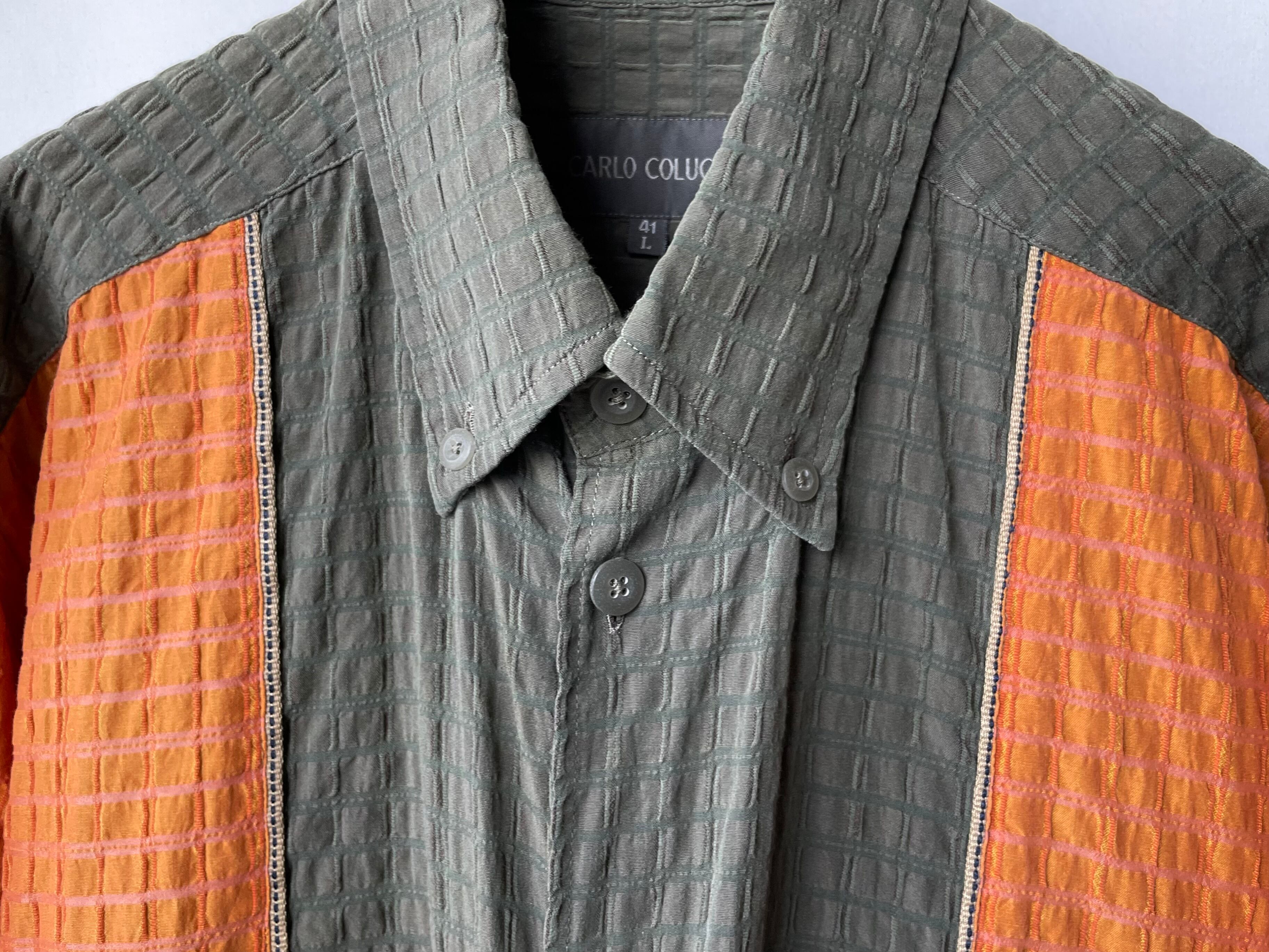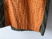 グレーがかったカーキグリーン×サーモンピンクの糸も混じる鮮やかなオレンジの切り替え。