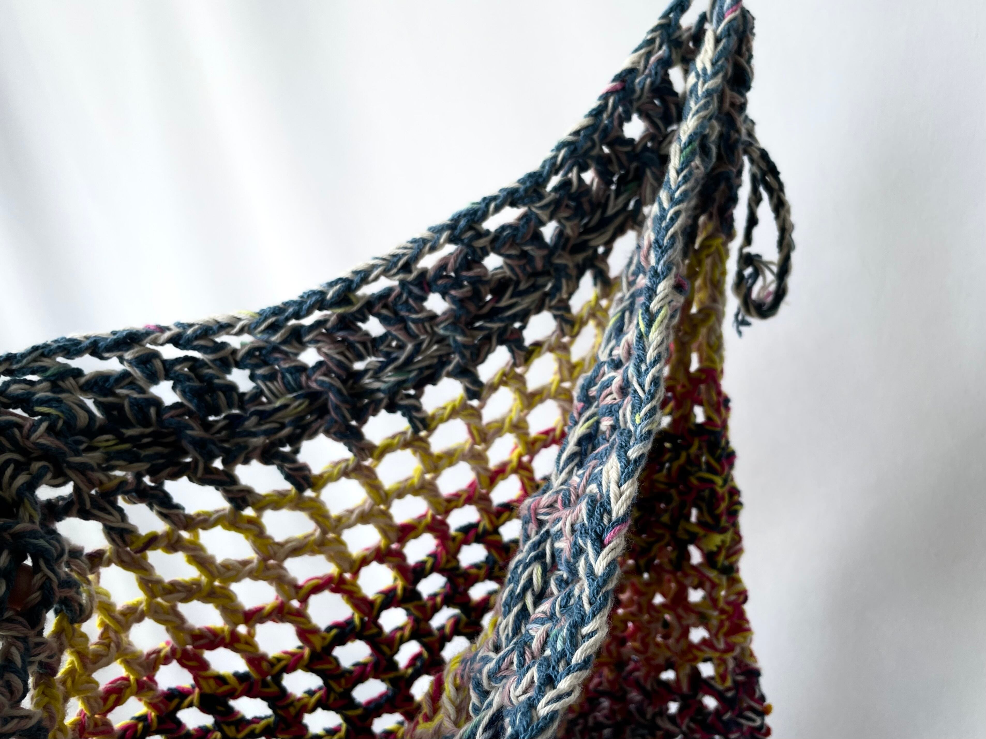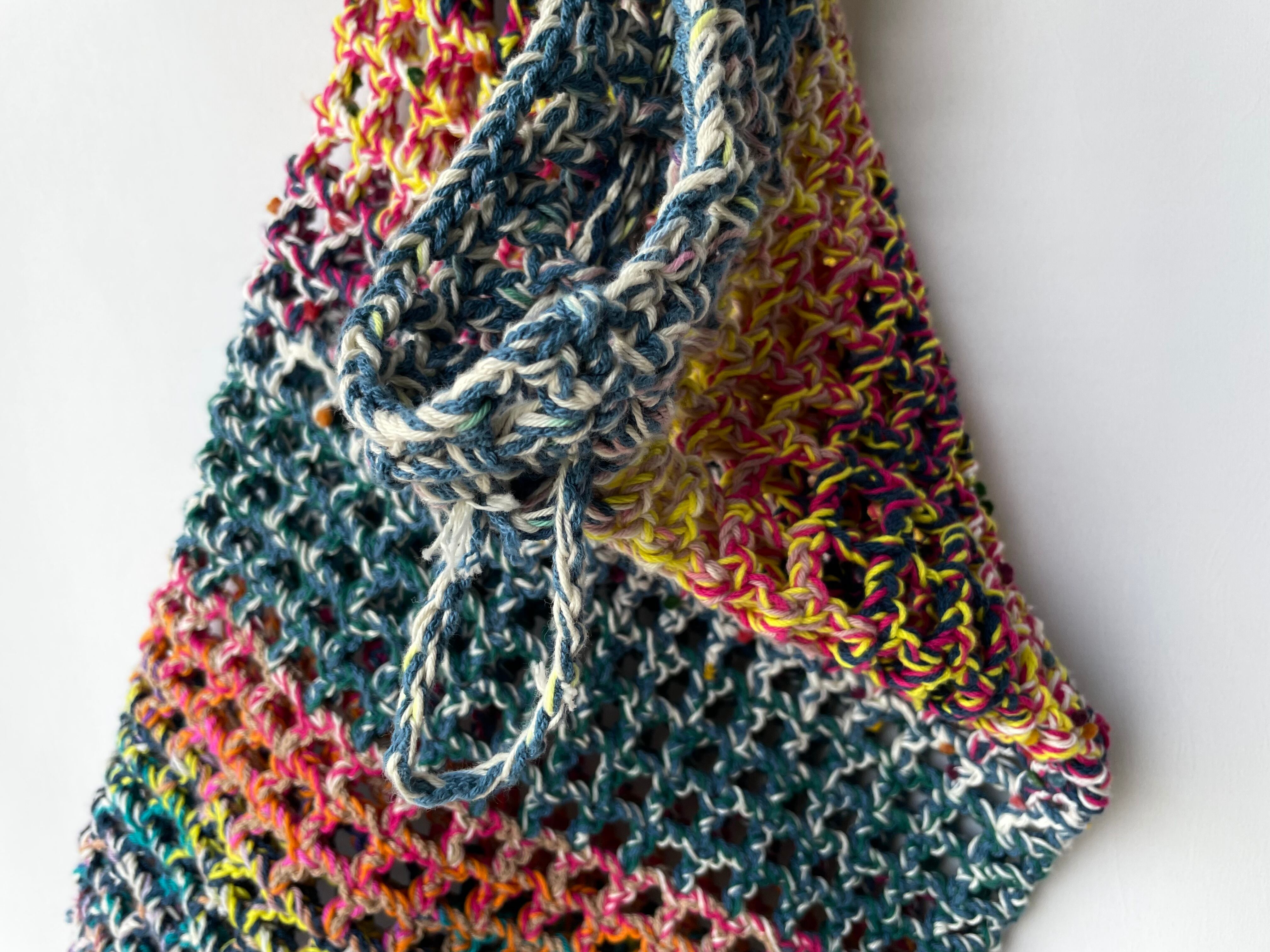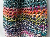 It's loosely knitted with several types of yarn, and comes in a colorful palette.
