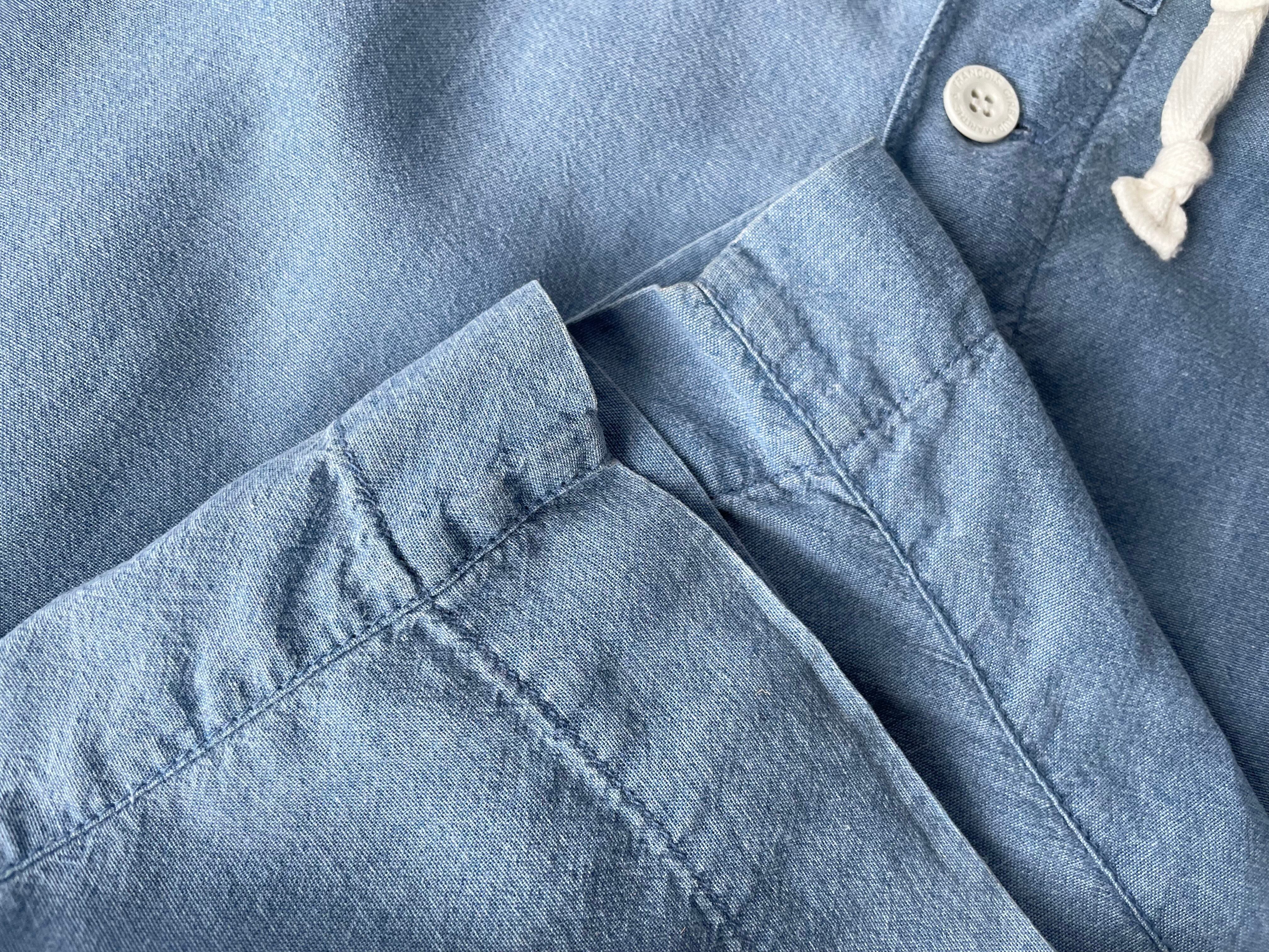 The exposed buttons on the front and the generous waist with a drawcord cinch reminiscent of military medical wear.