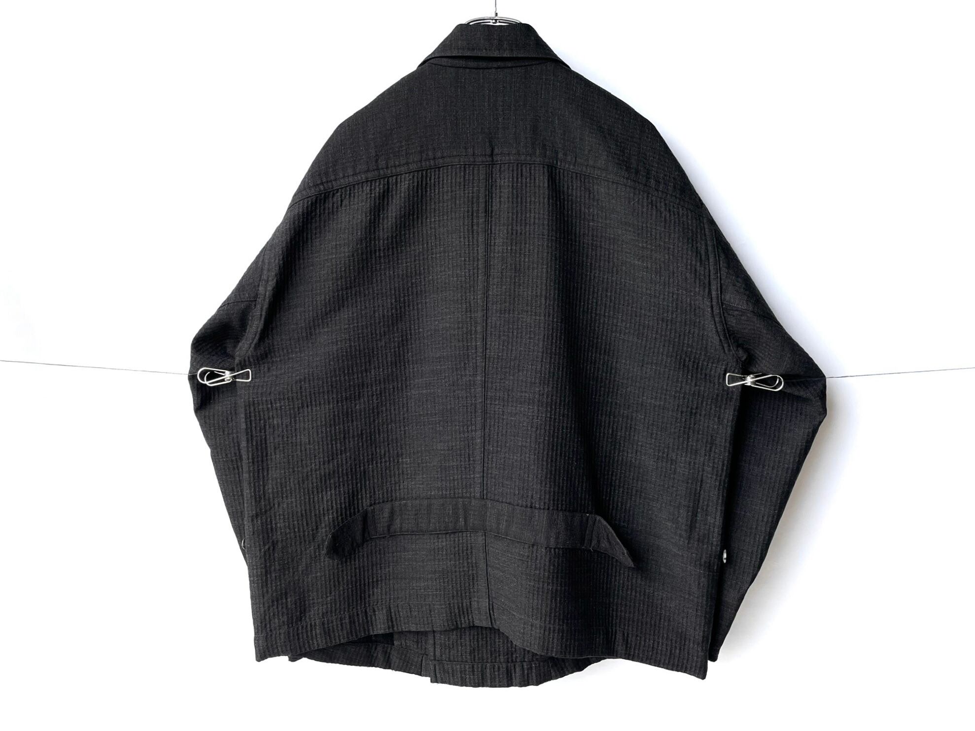 四角のステッチが映える大判な裾ポケット、後裾の共生地のボタンアジャスター。