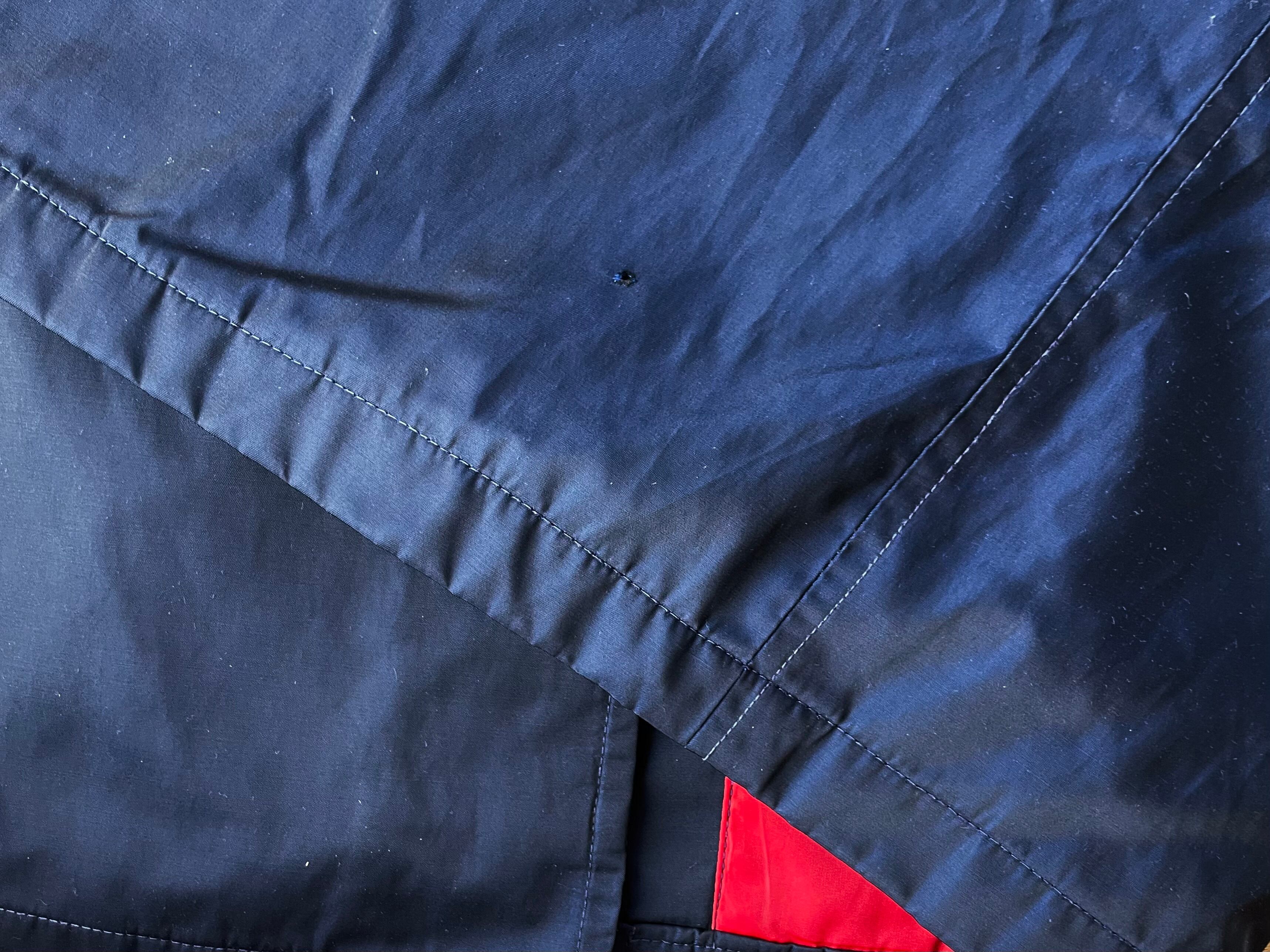 ぎっしり高密度に織られたviscolan 85/nylon15表記の化繊シェル。