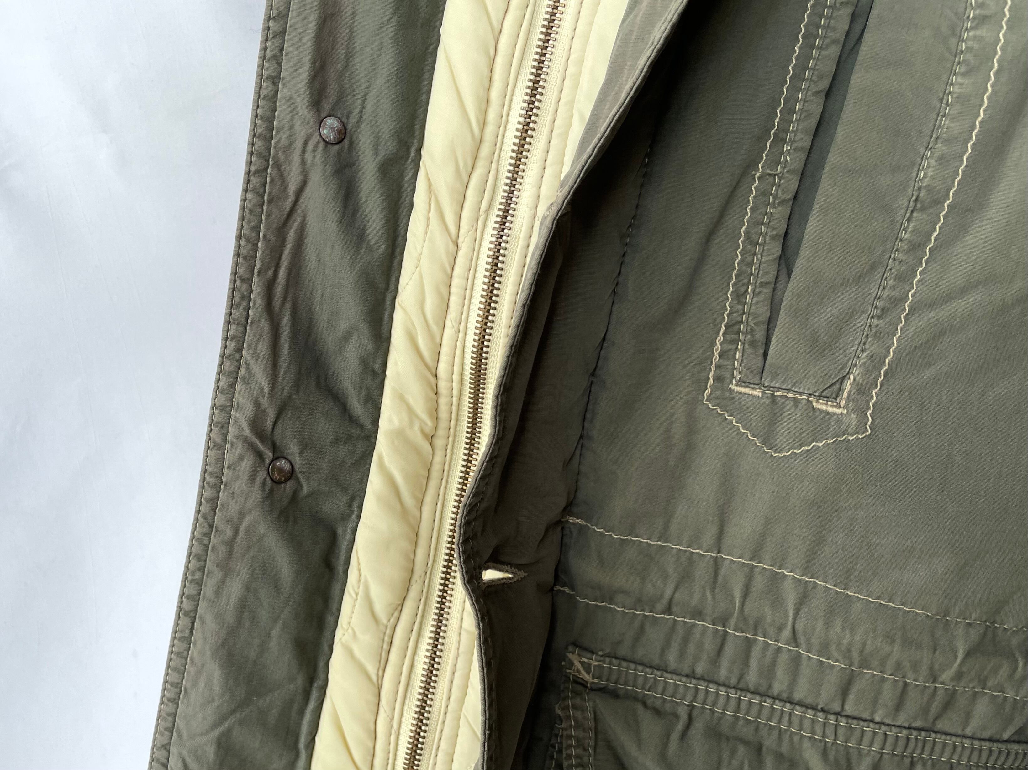 曇りのあるカーキグリーンシェルに、ほんのりと色付いたクリームカラーのキルトライニング。