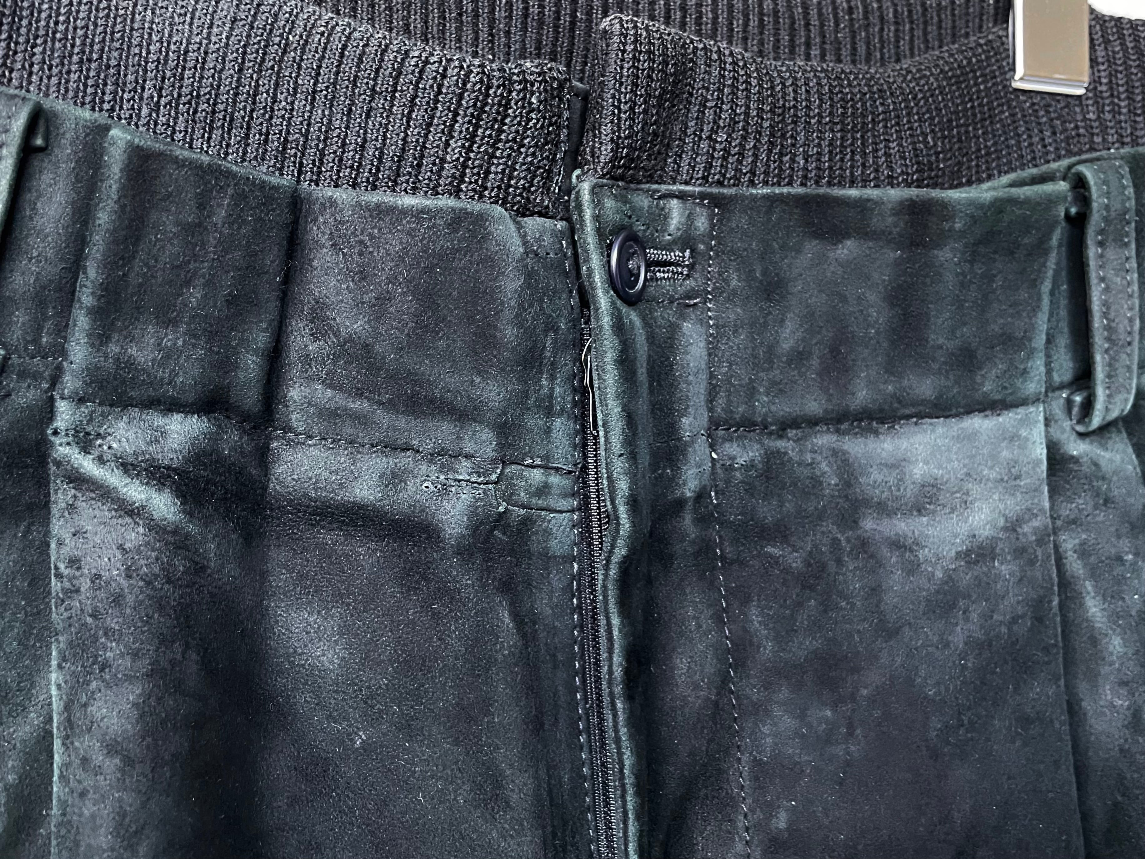 The charcoal to navy-black body features the characteristic leather unevenness, while the waist is lined with pure black wool ribbing.