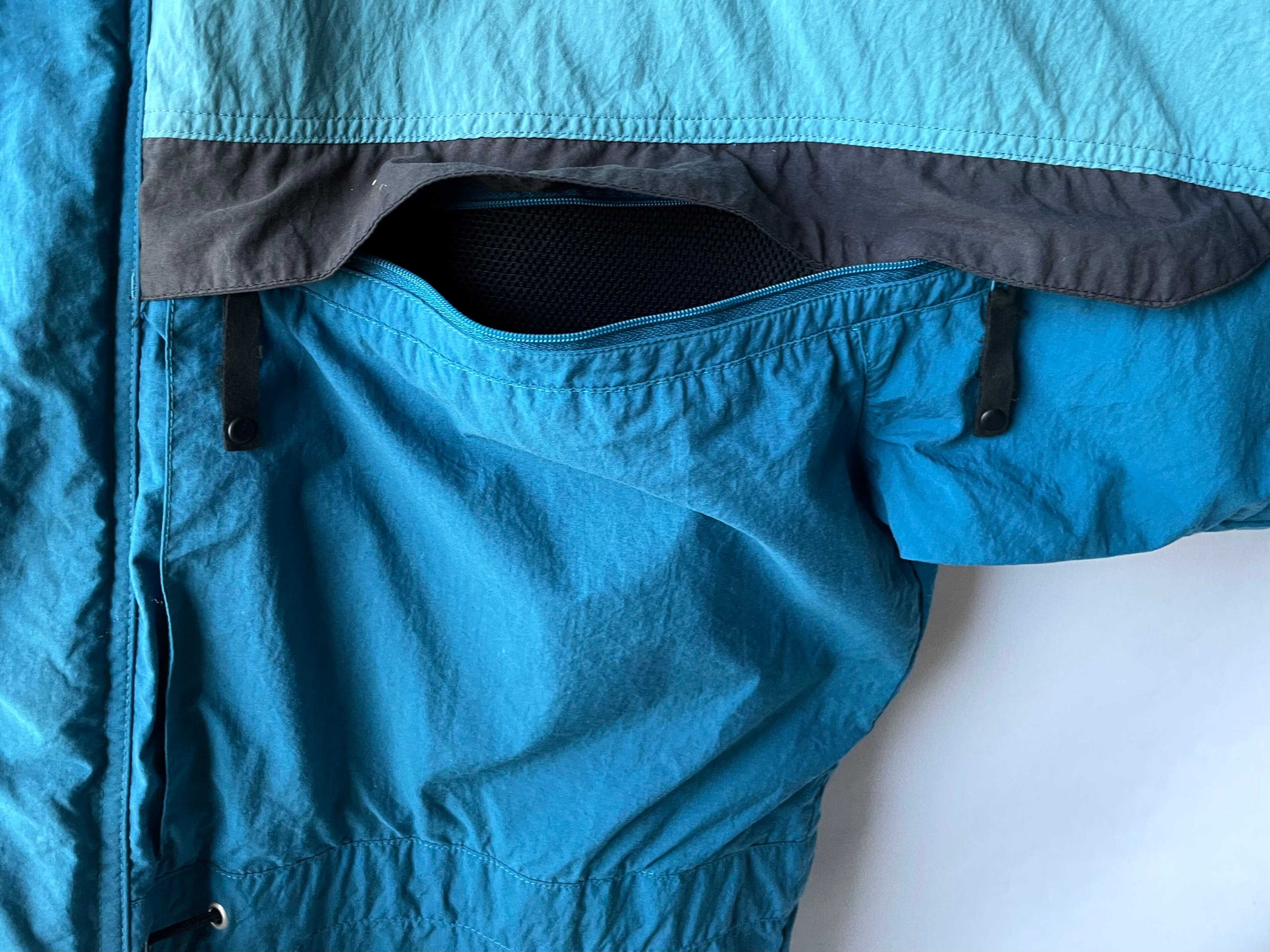 左右どちらにも寄せられる、こちらもダブルジップ式の大判なチェストポケット。