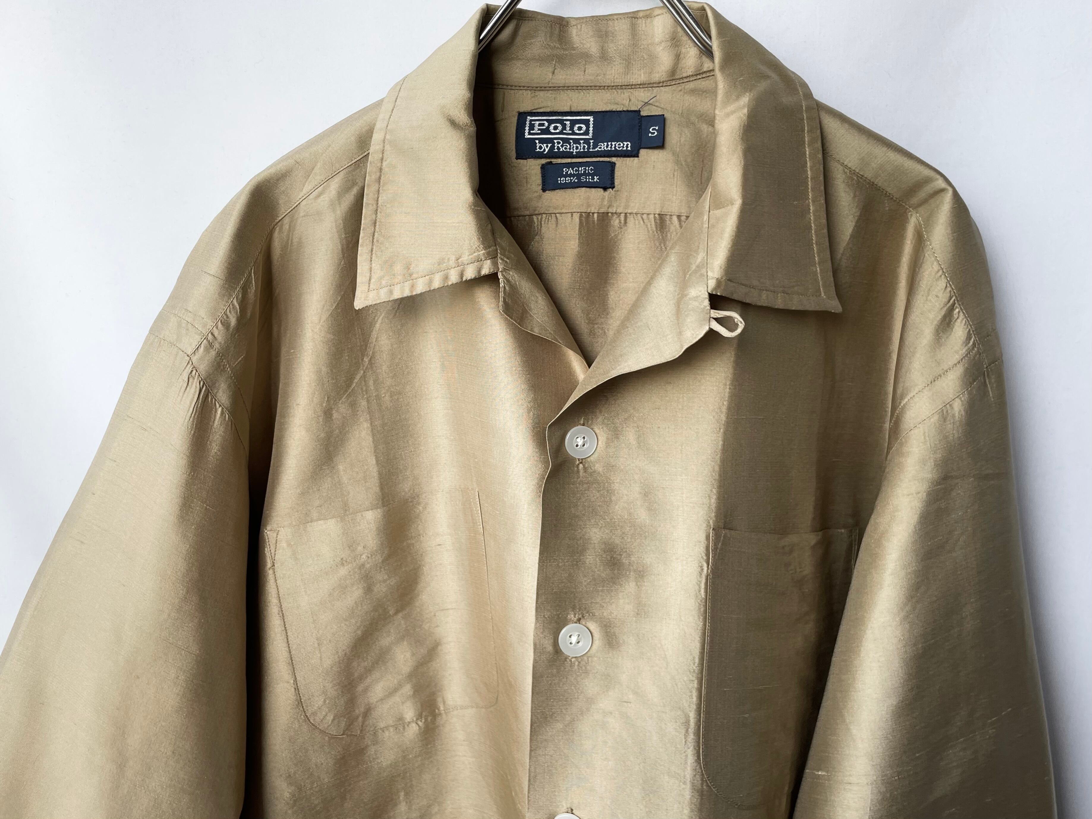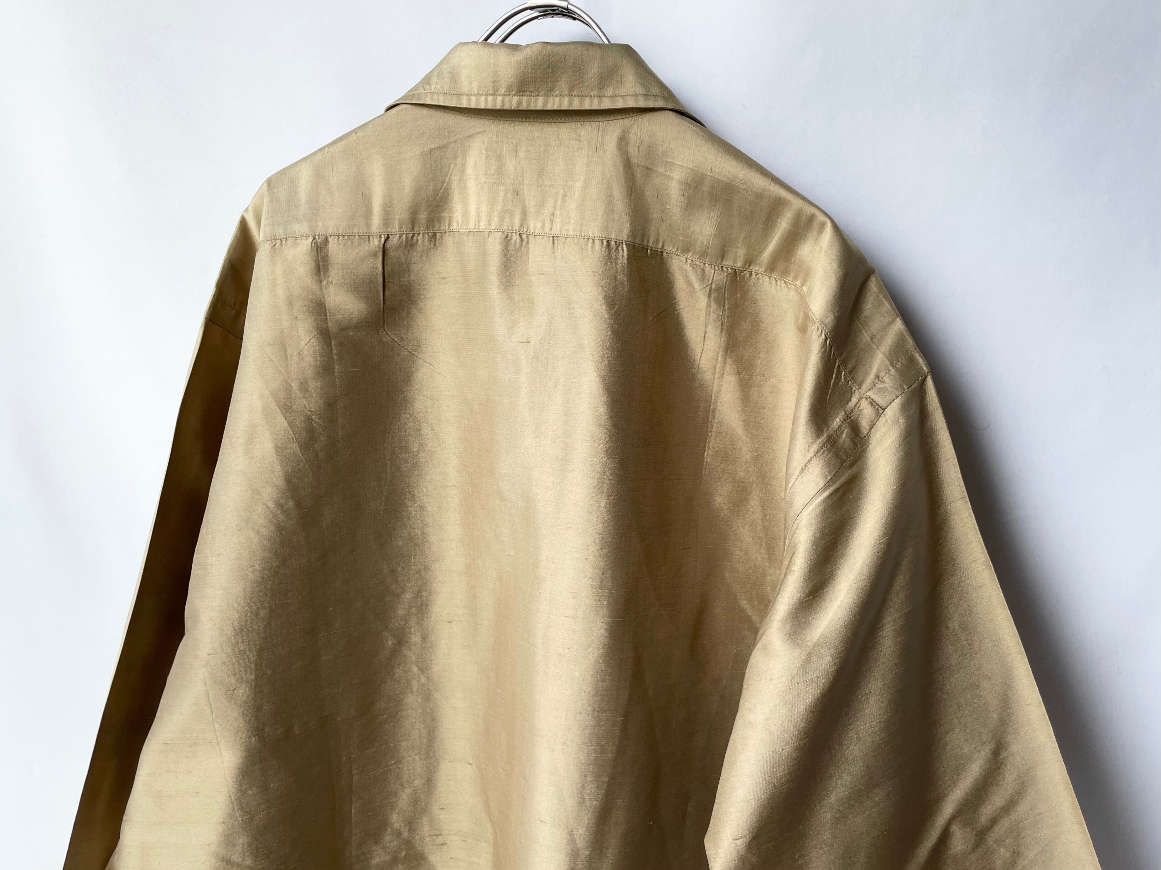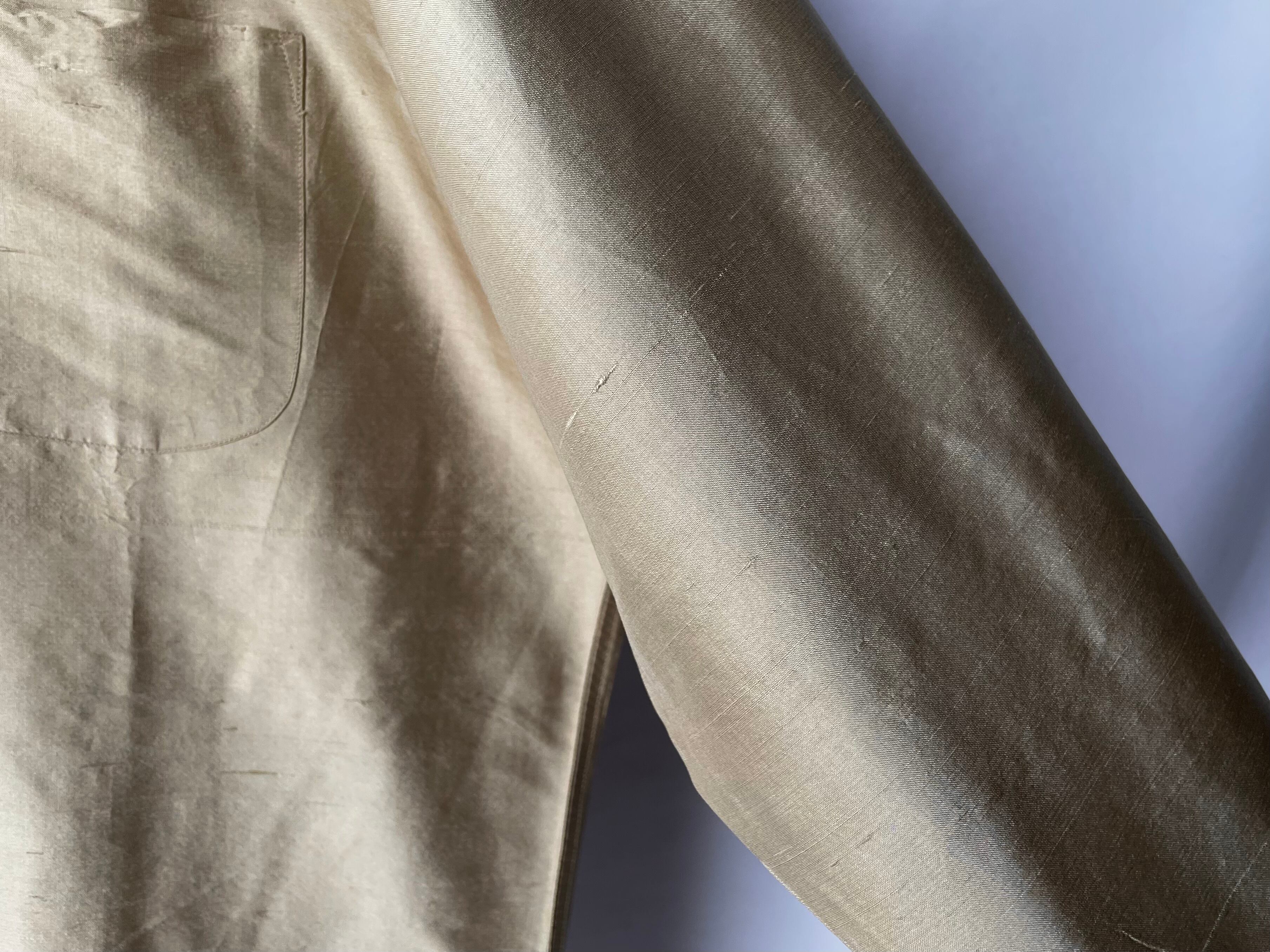 美しいシャンパンカラーの上質なロウシルクで仕立てられた、ボックスカットのオープンカラーシャツ。