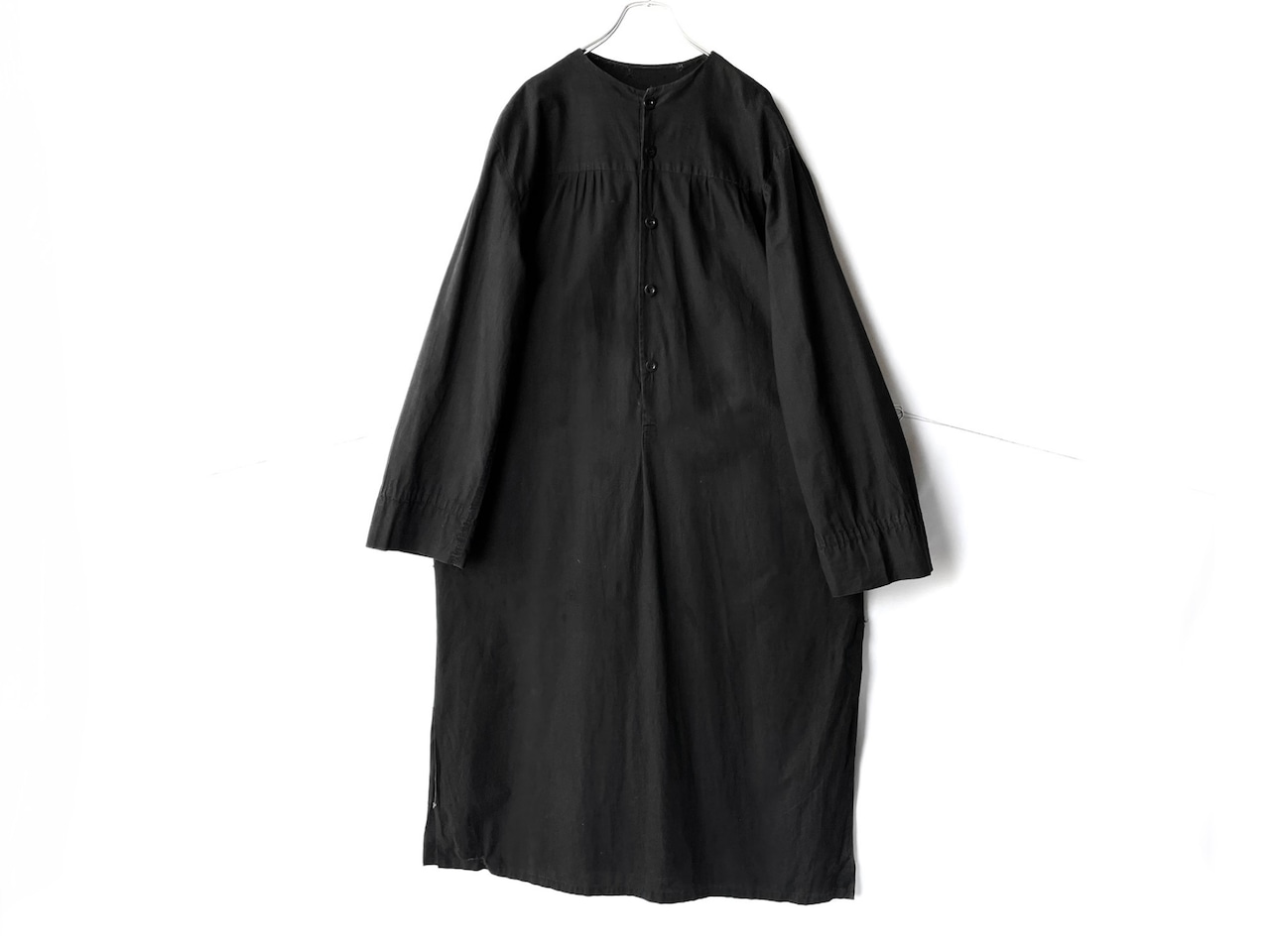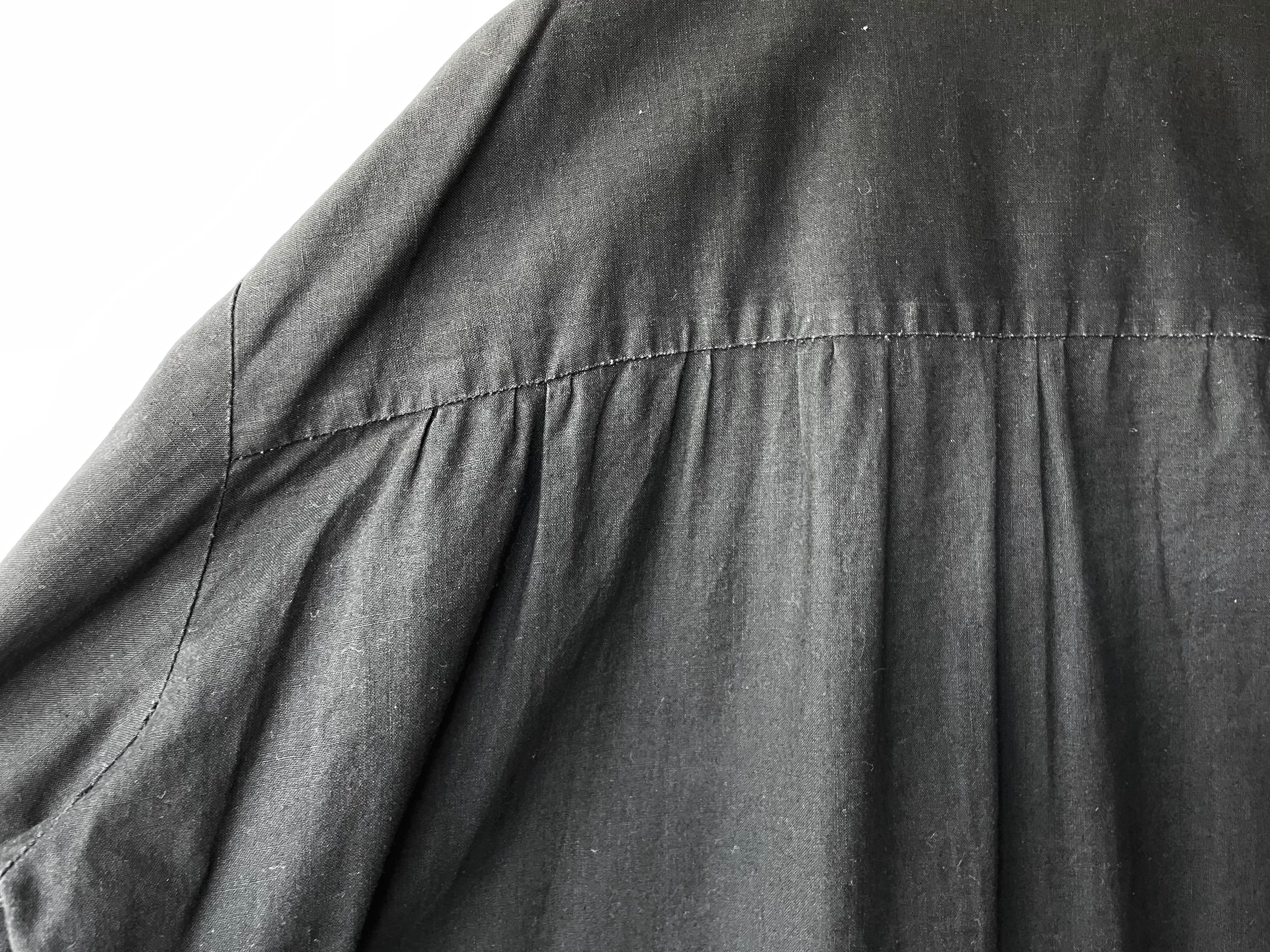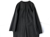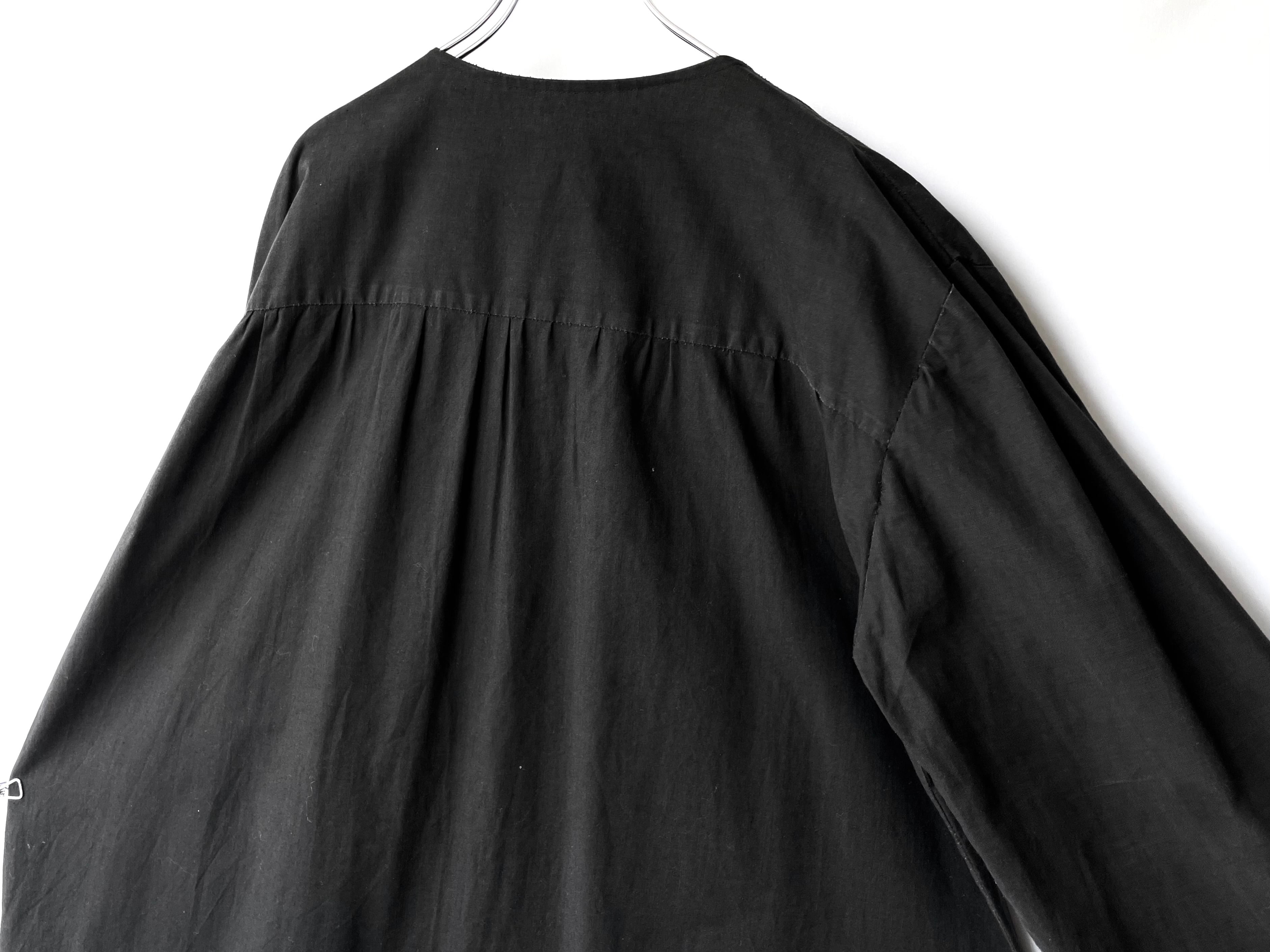 胸周りのギャザーデザイン、癖の無いカラーレスの5つボタンプルオーバー。