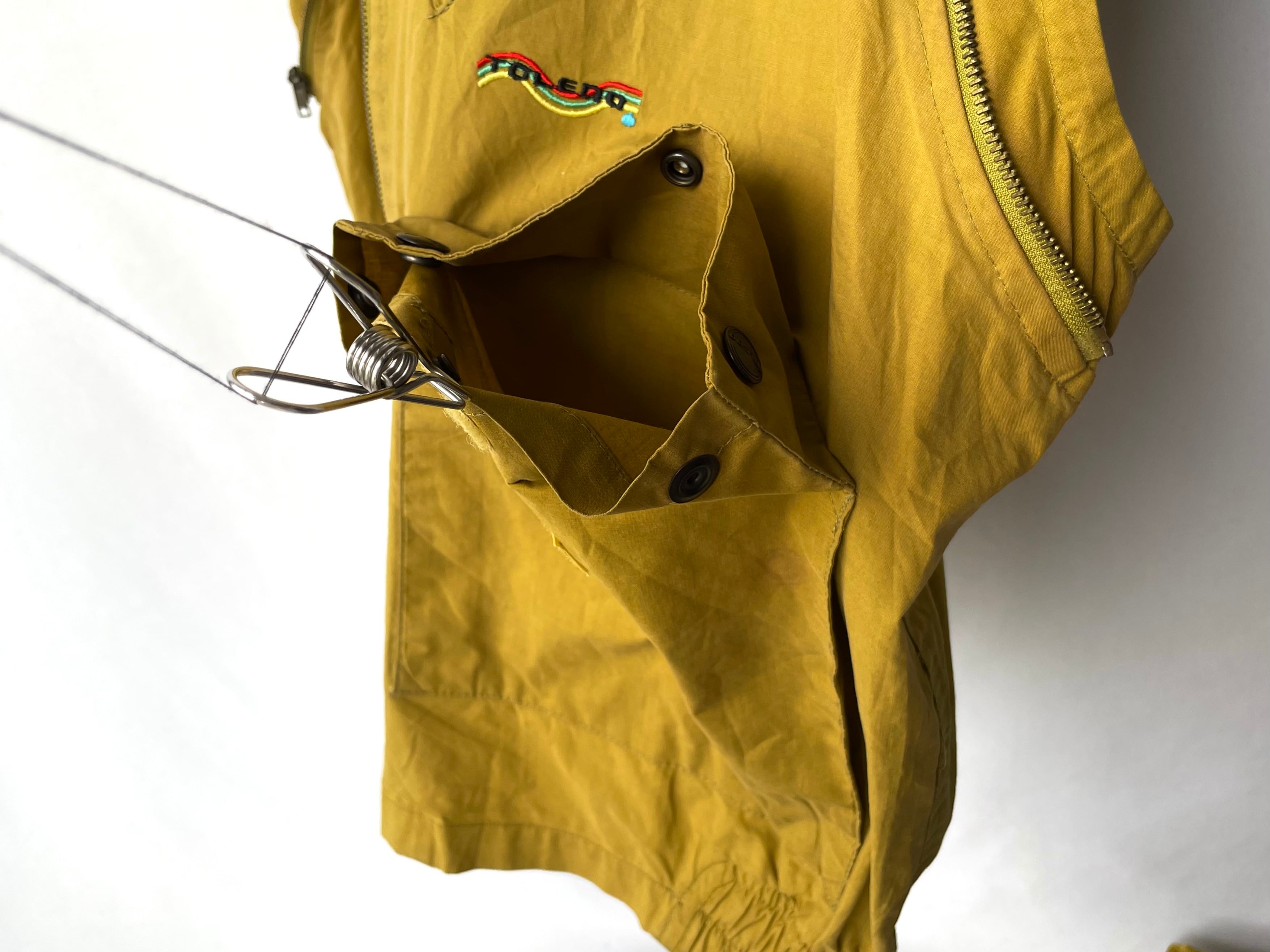 斜めに傾いた胸ポケット、スナップ3点留めの袋状の大判ポケット。