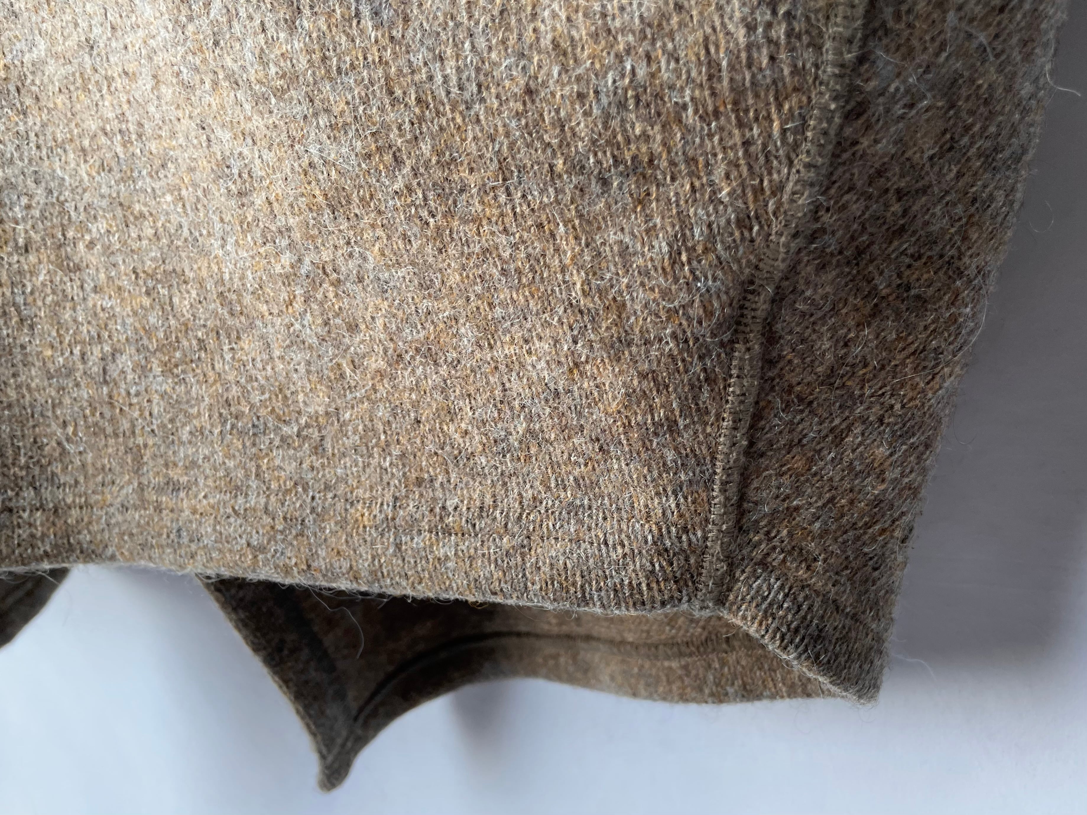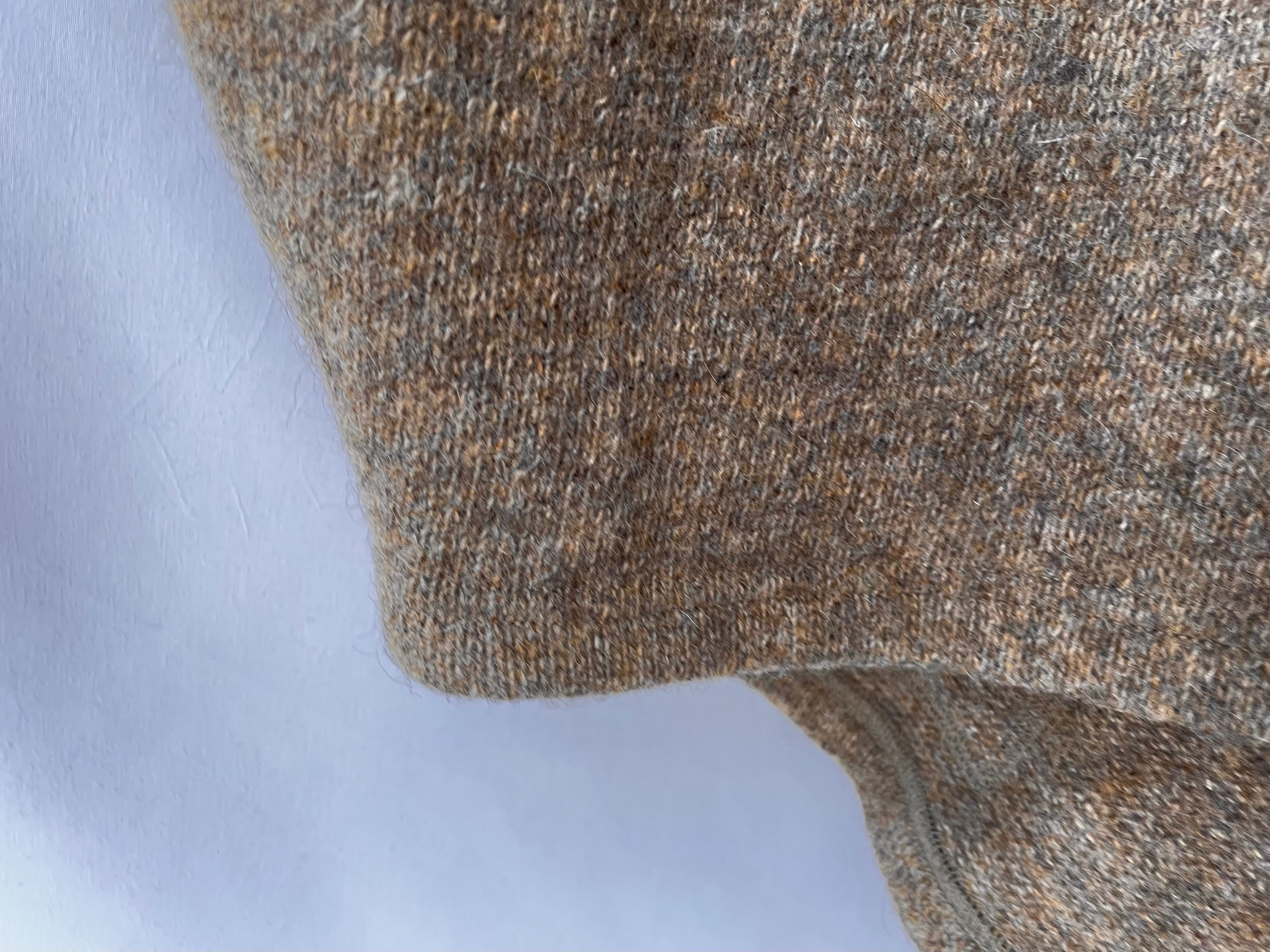 イエローブラウン/グレージュの糸が混じる、奥行きのある表情豊かな編み地。