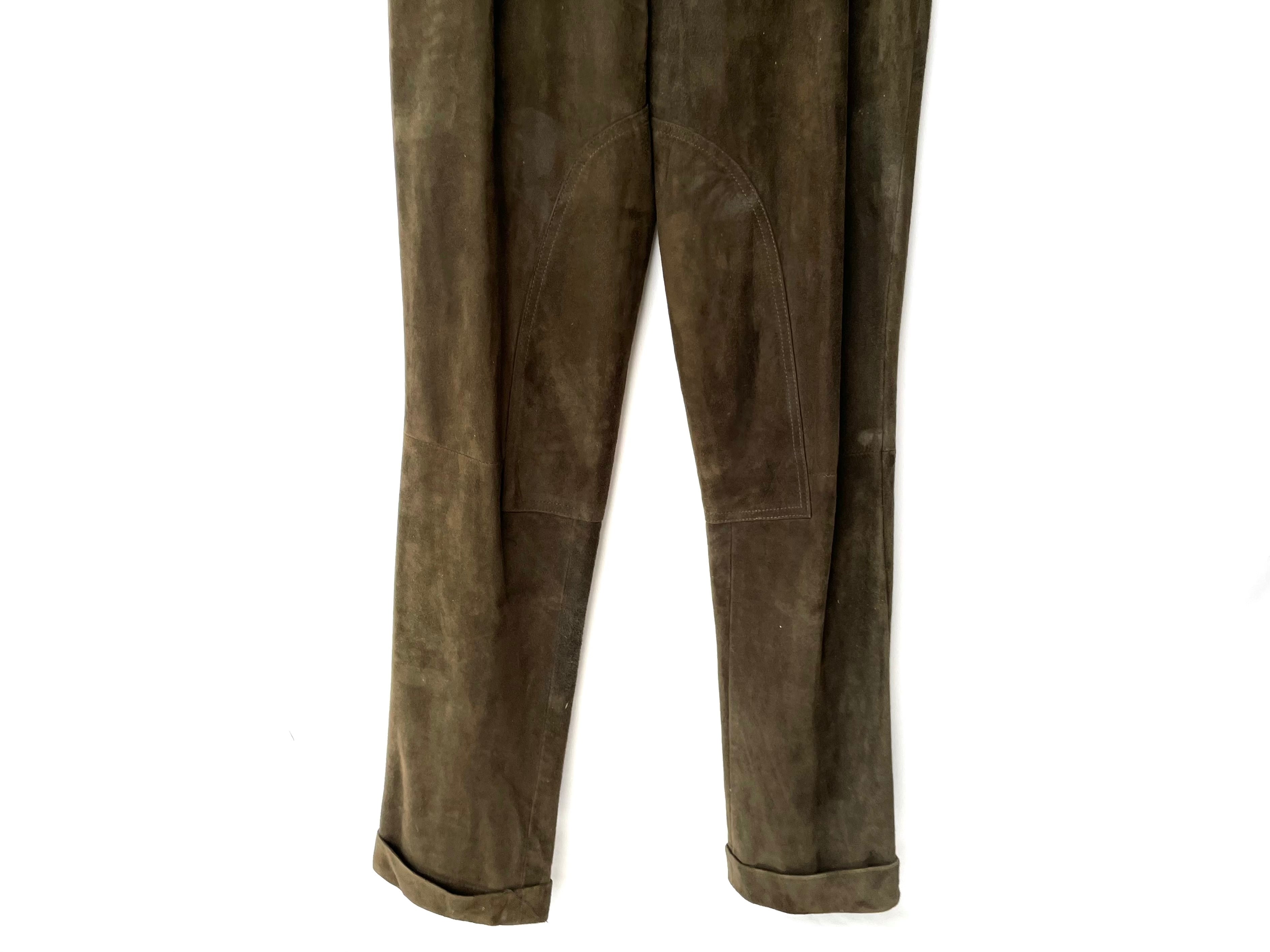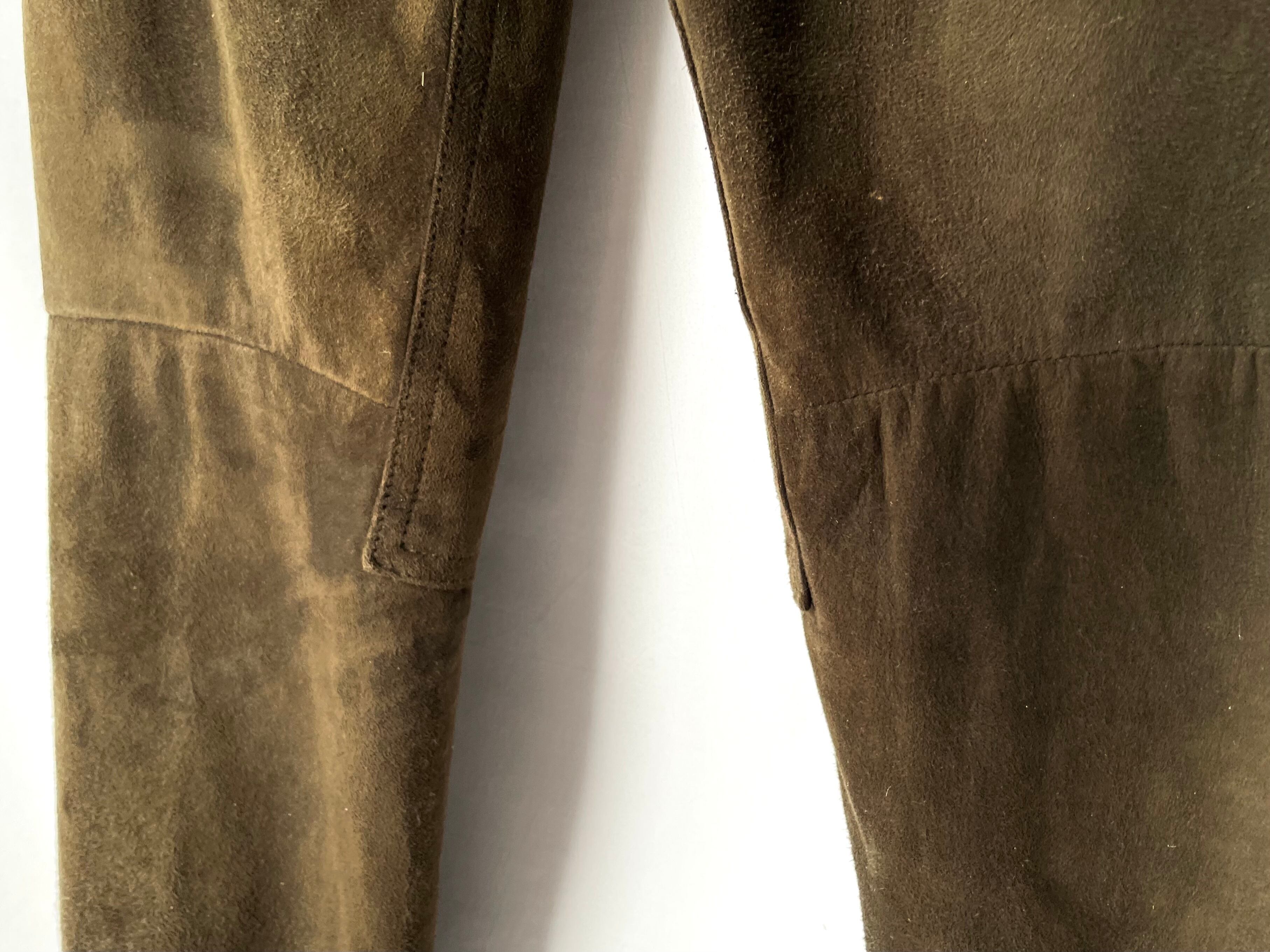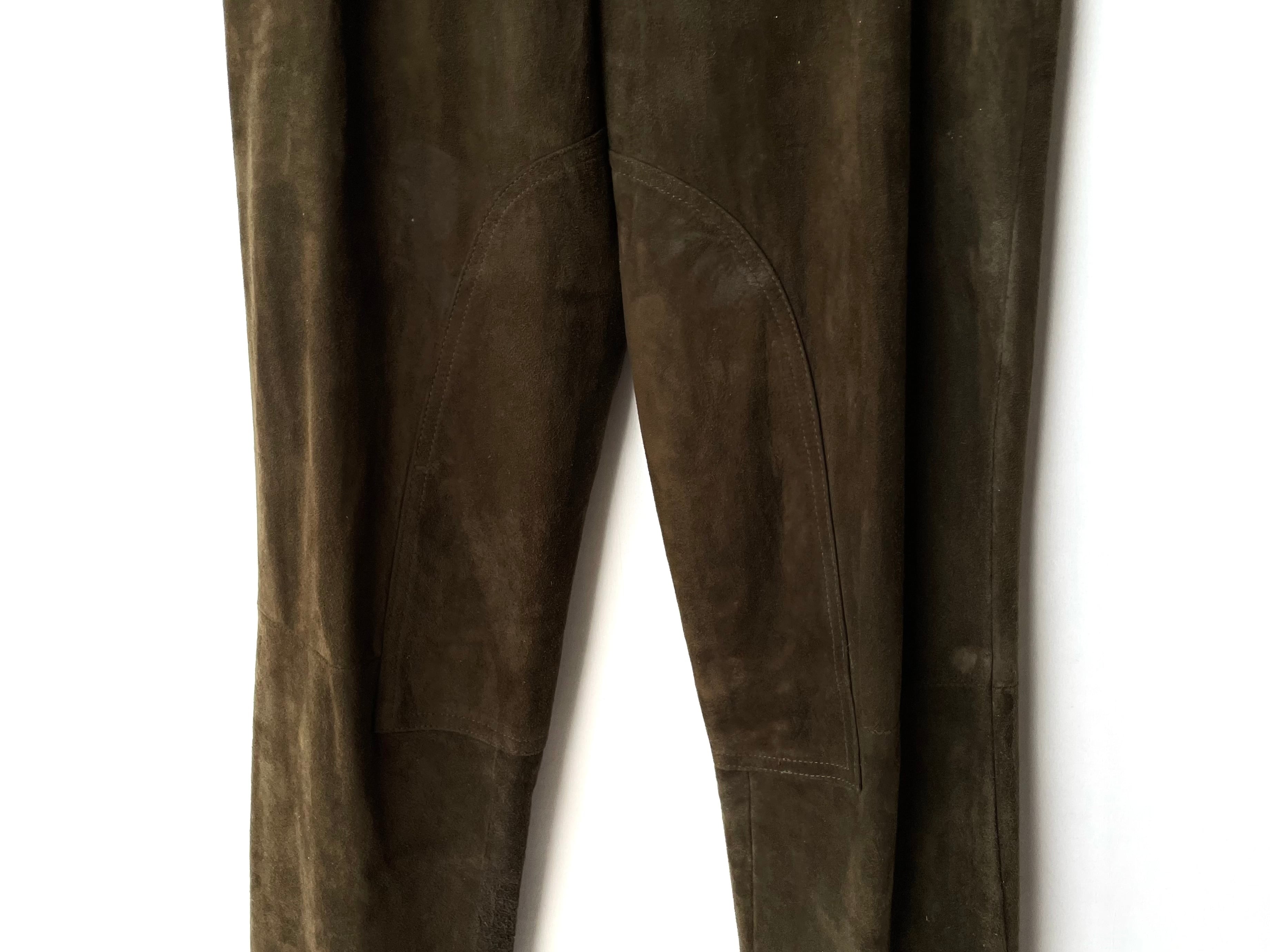 とろみのある柔らかなオリーブレザーで仕立てられた、ジョッパーズディテールのスリムスラックス。
