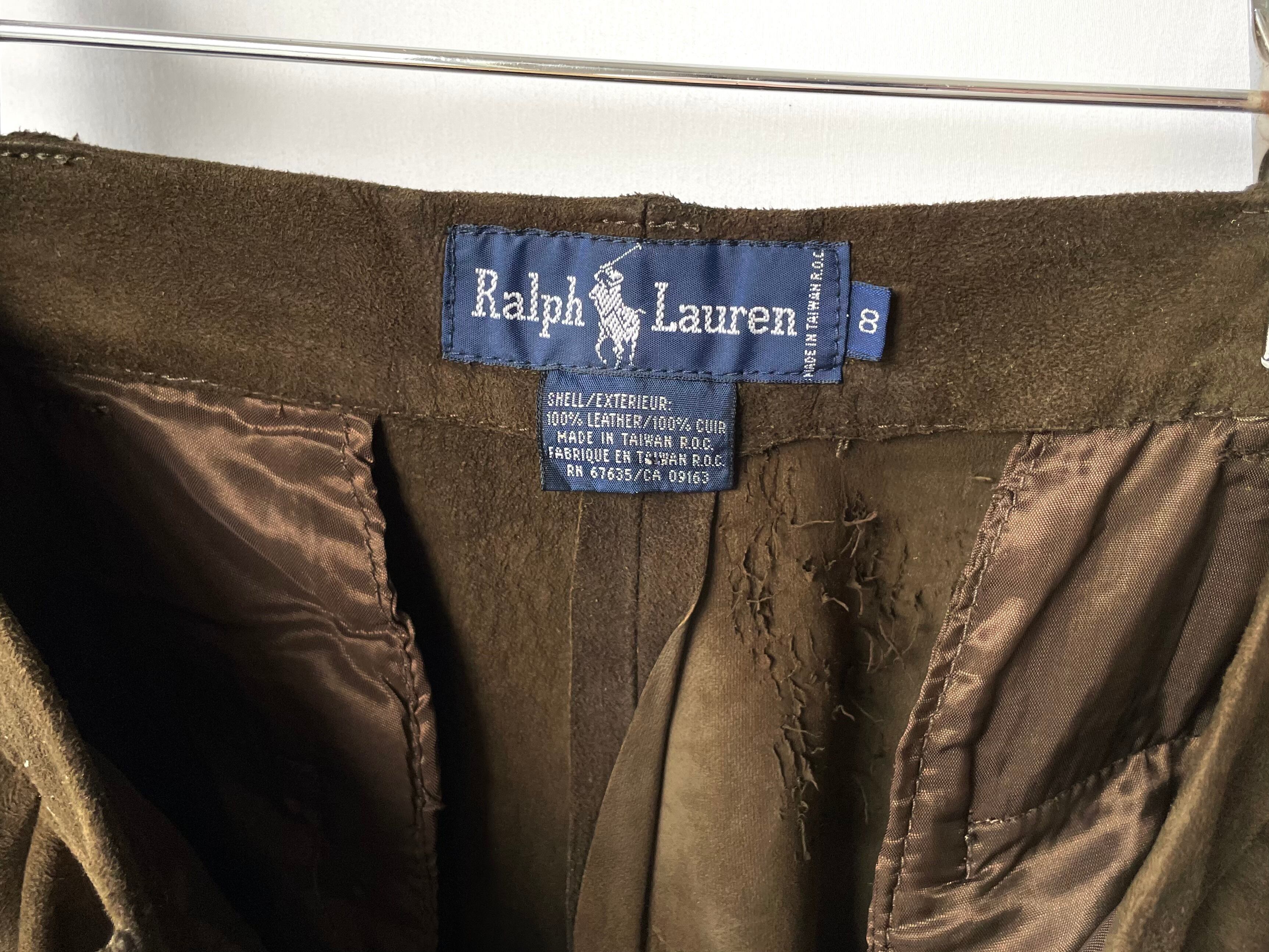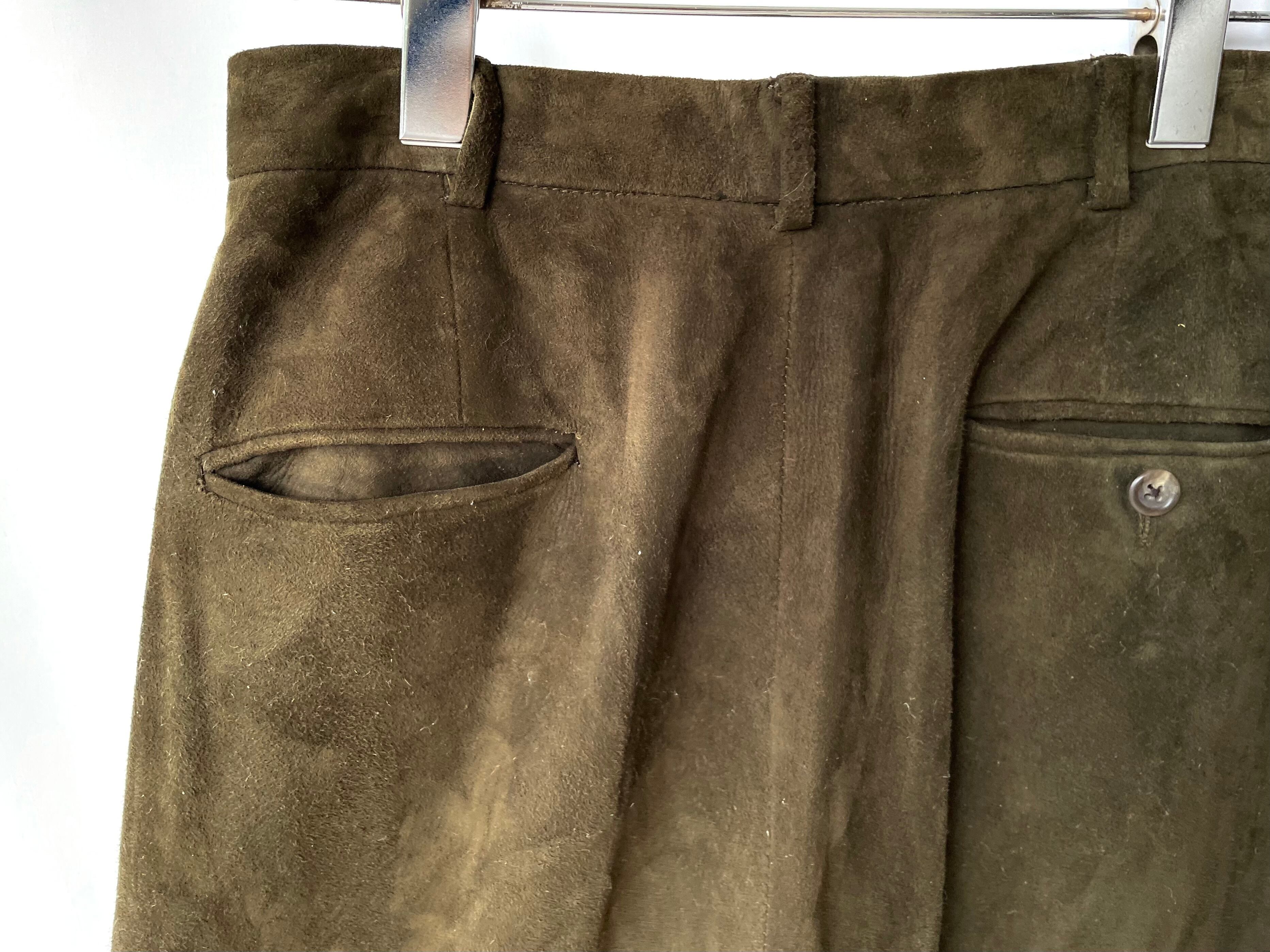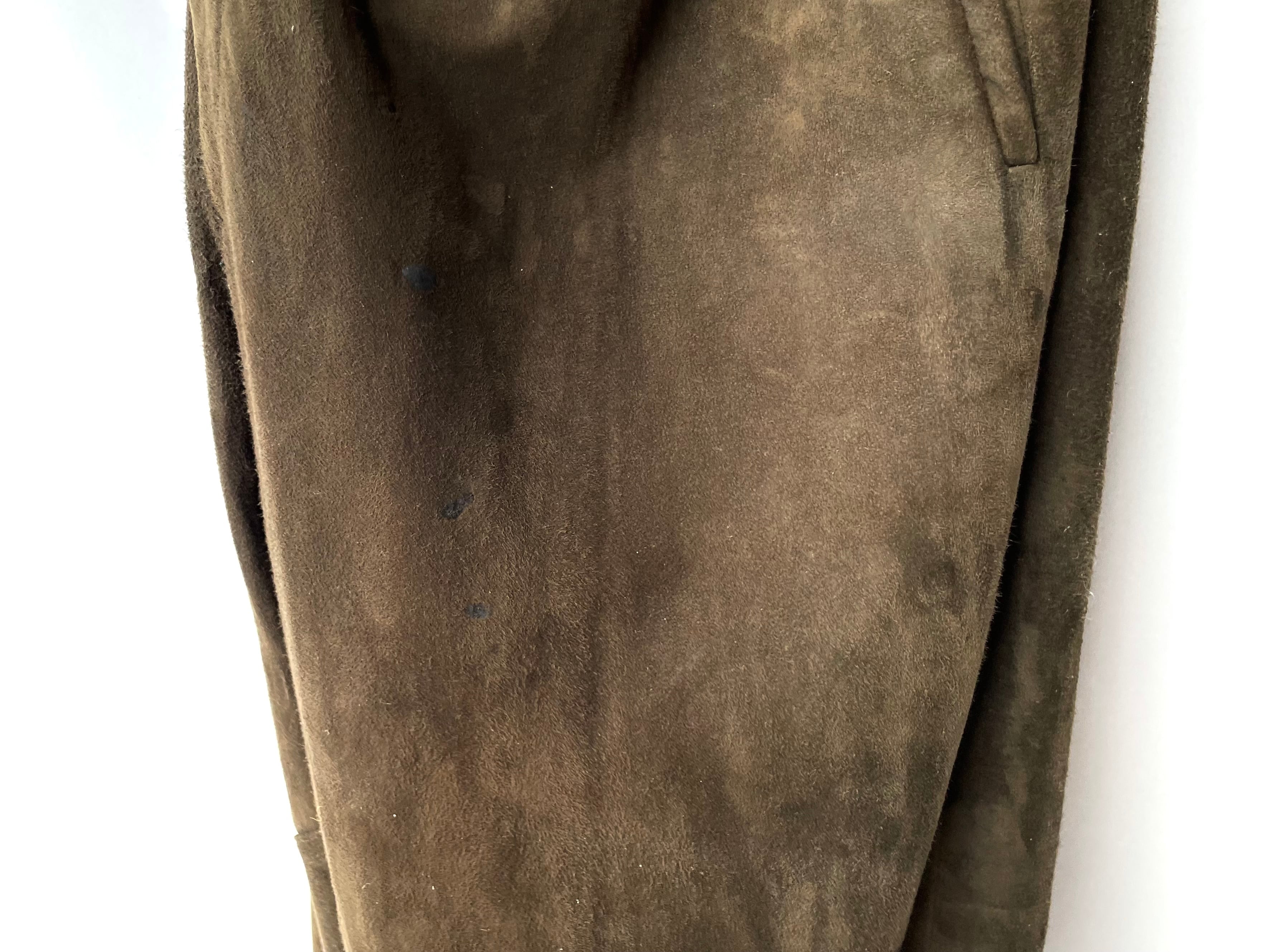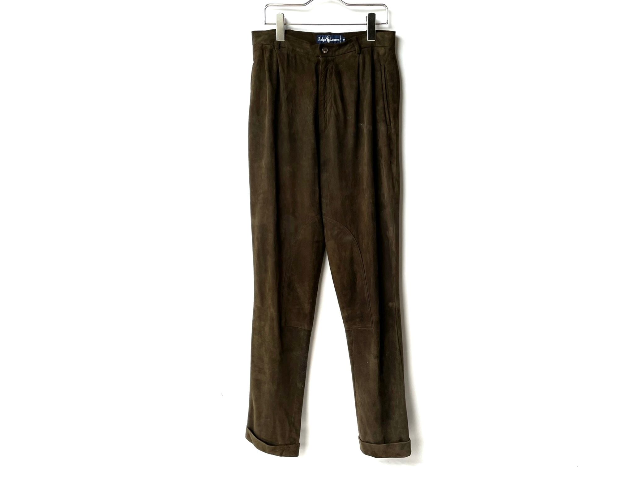 とろみのある柔らかなオリーブレザーで仕立てられた、ジョッパーズディテールのスリムスラックス。