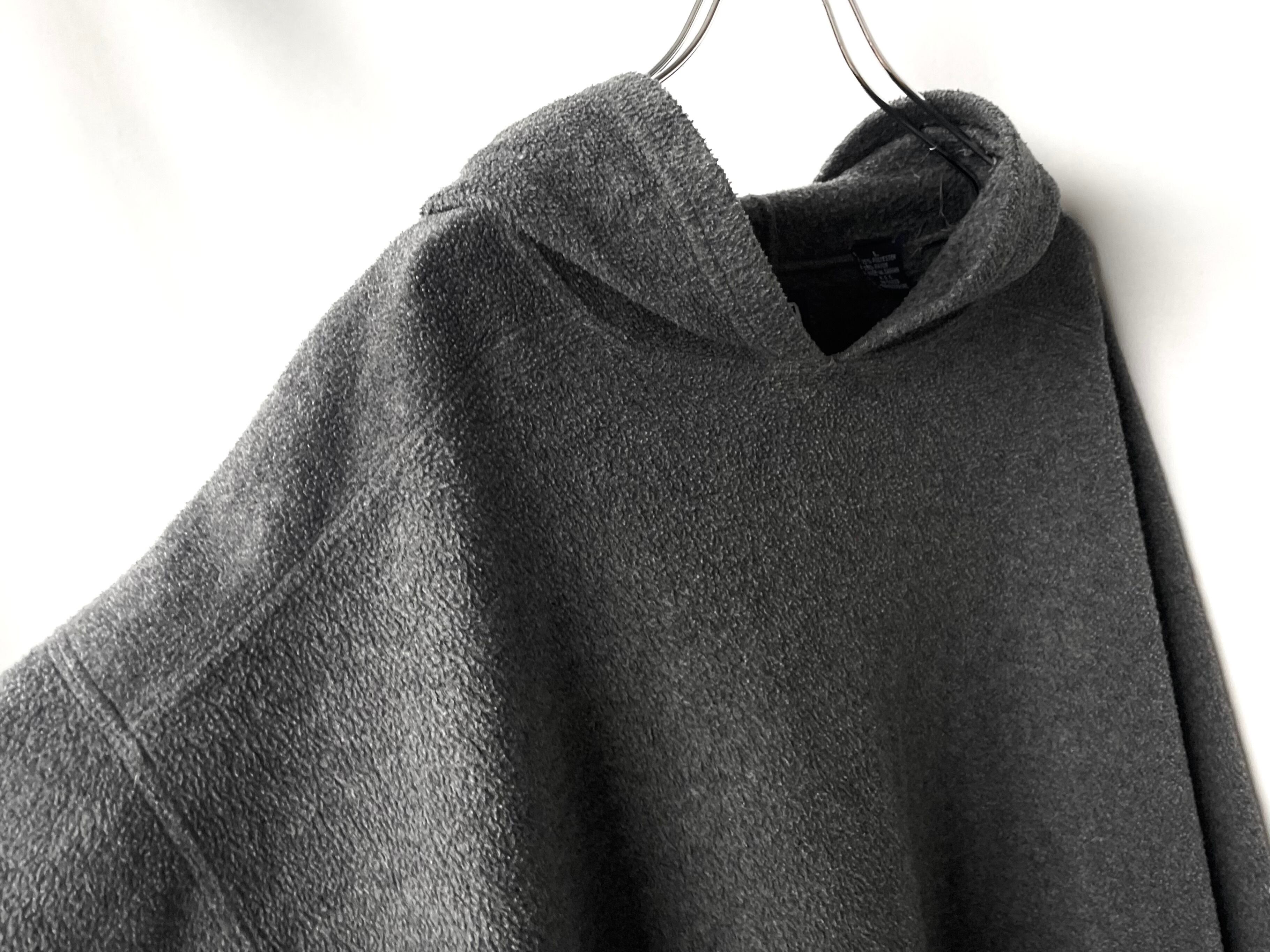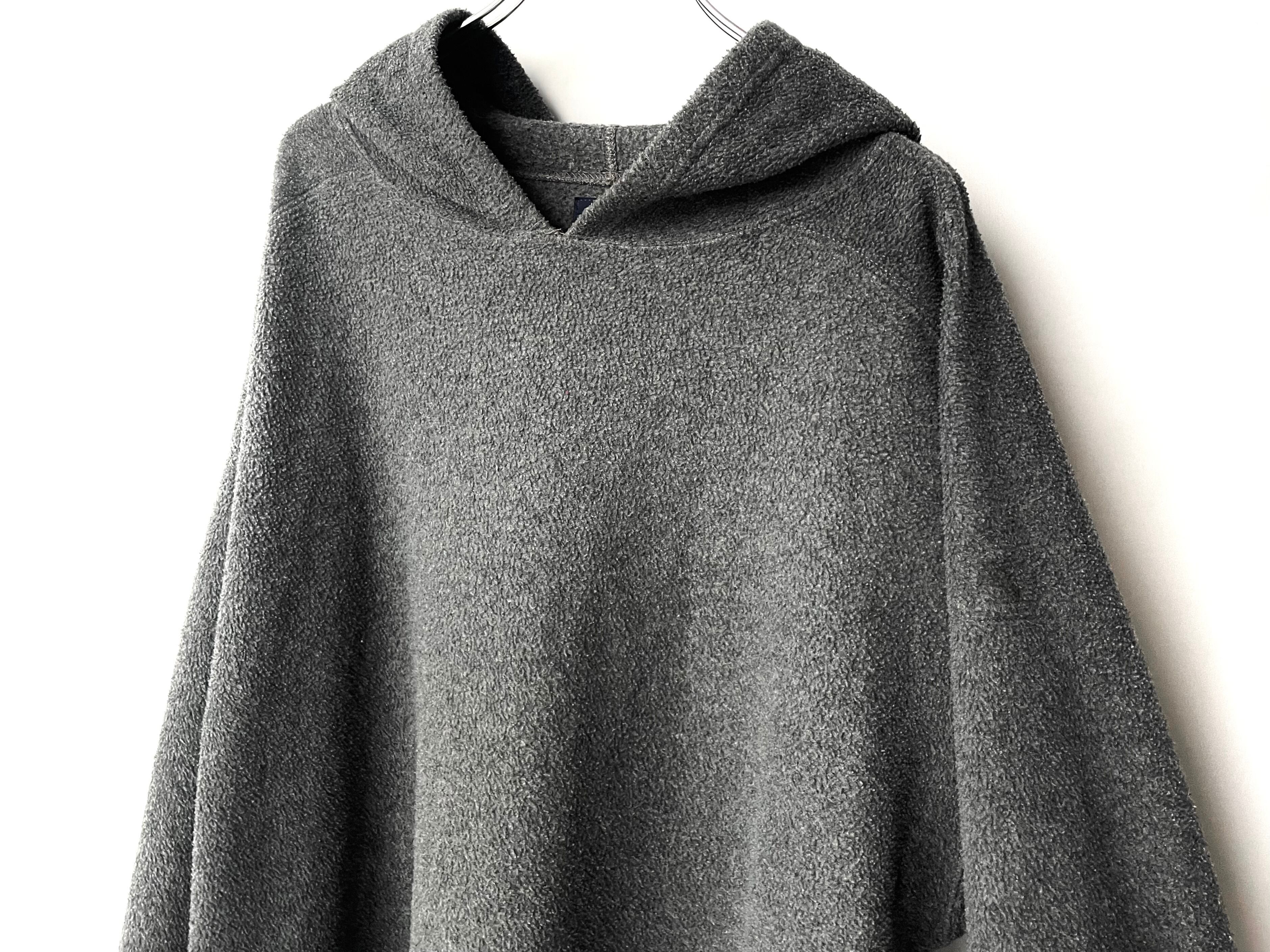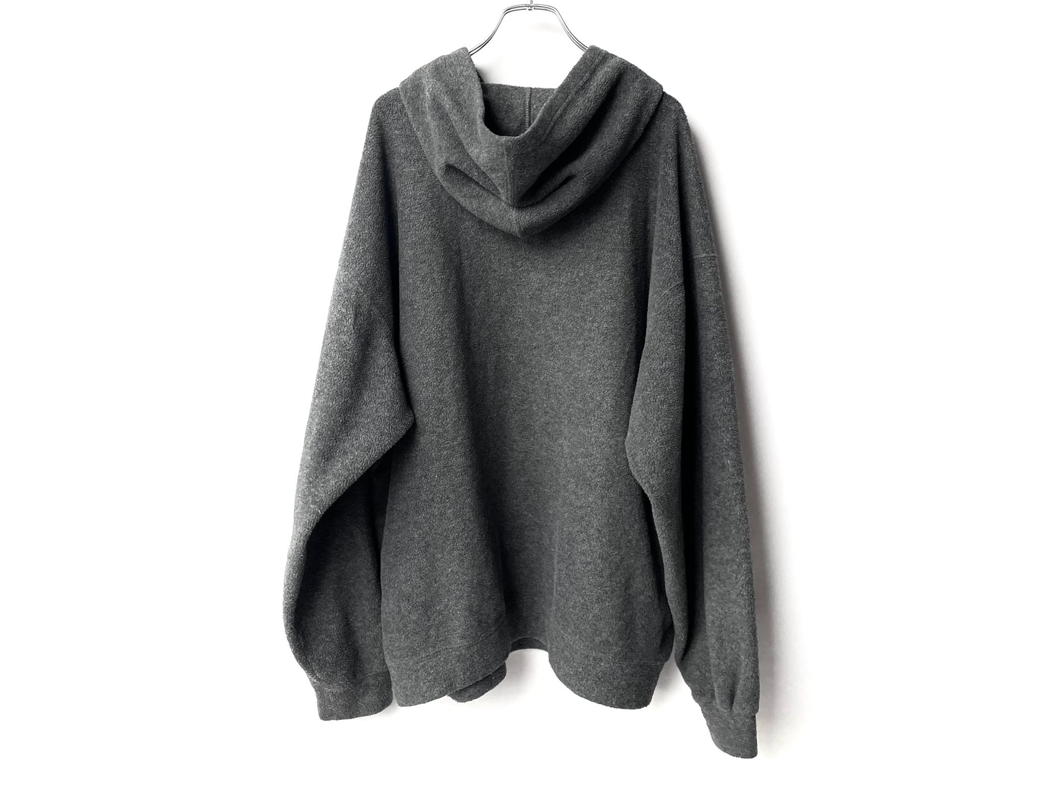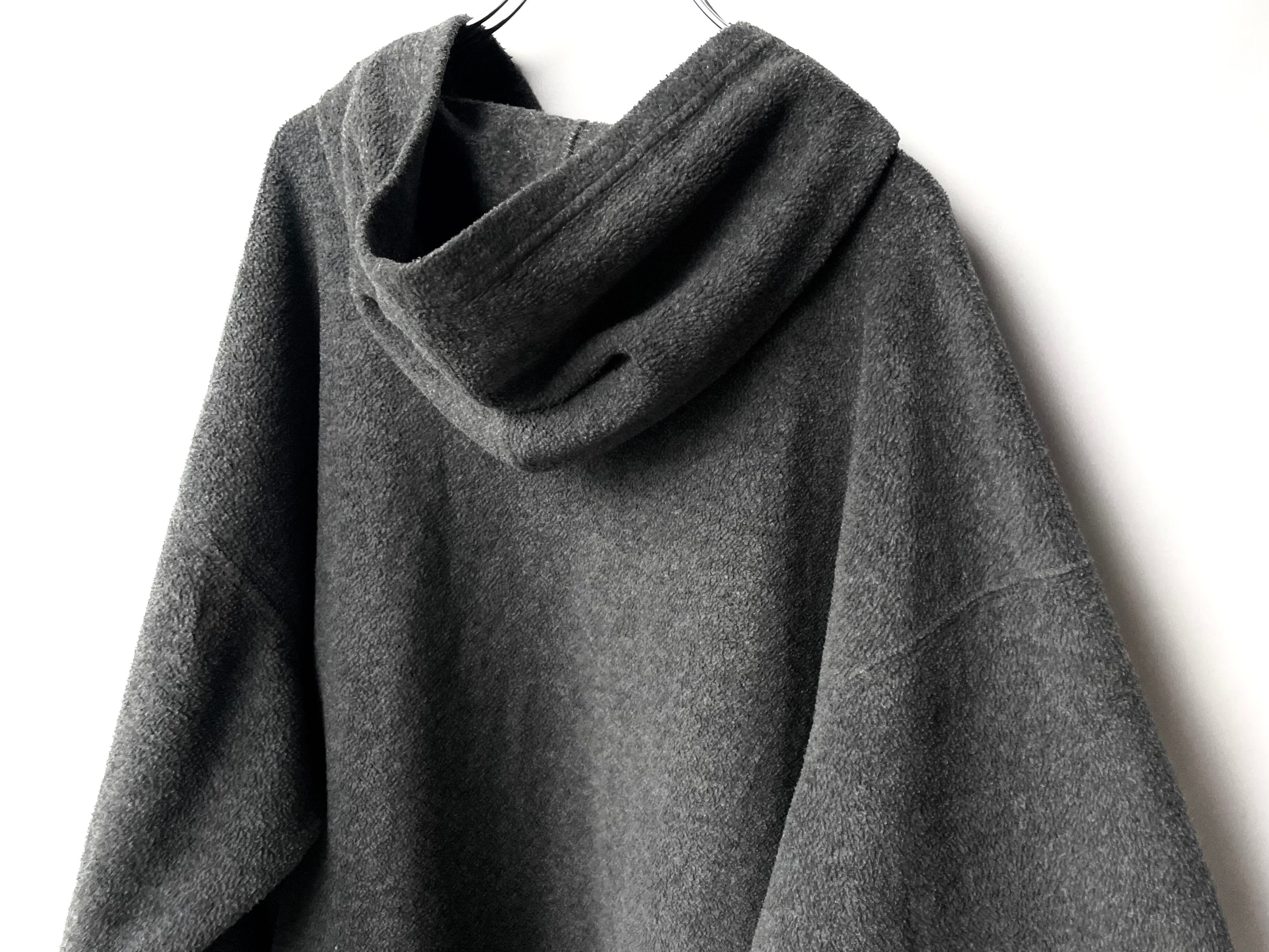 深いグレーの肉厚なフリース生地で仕立てられた、たっぷりワイドシルエットのプルオーバーフーディ。