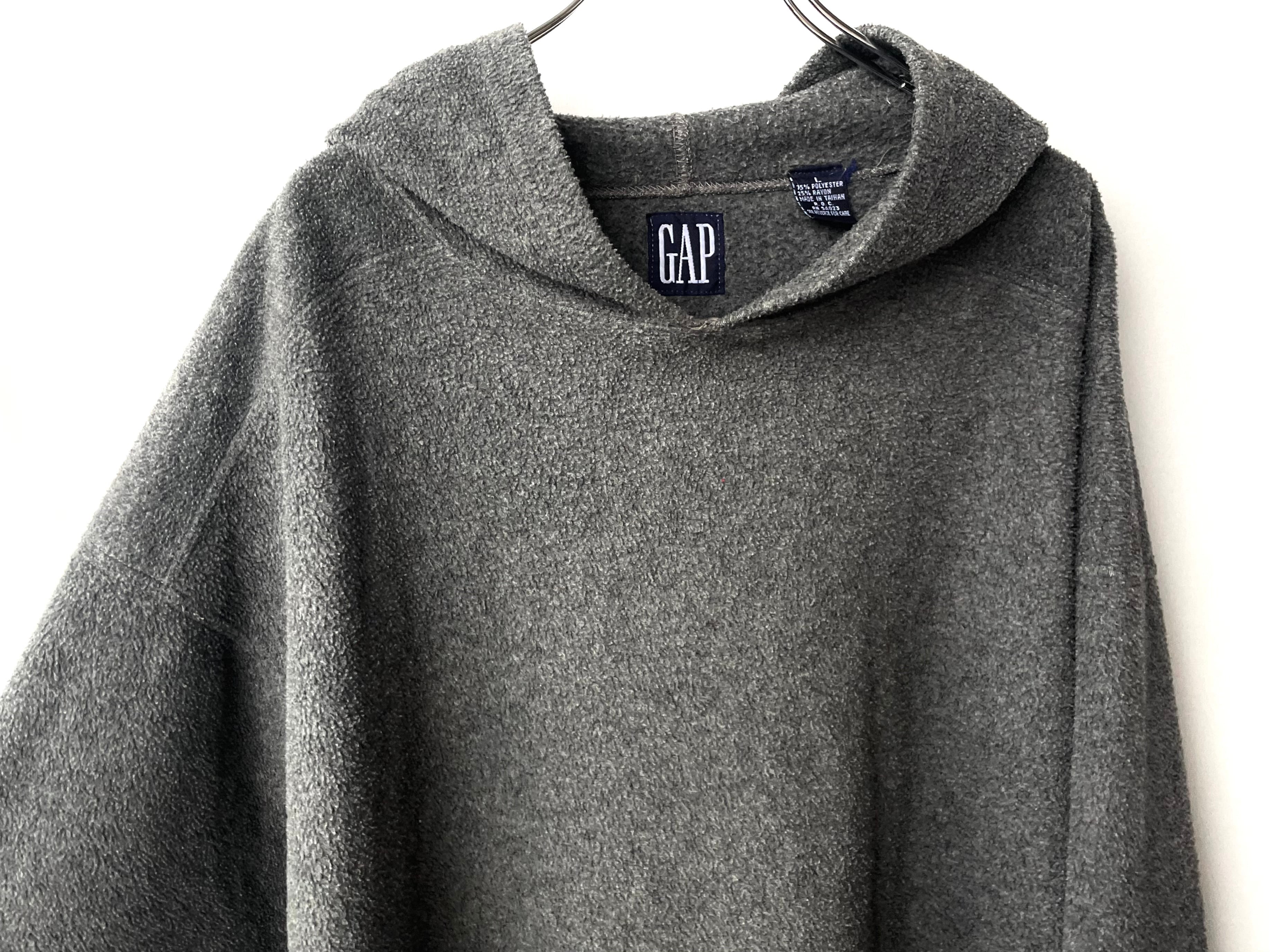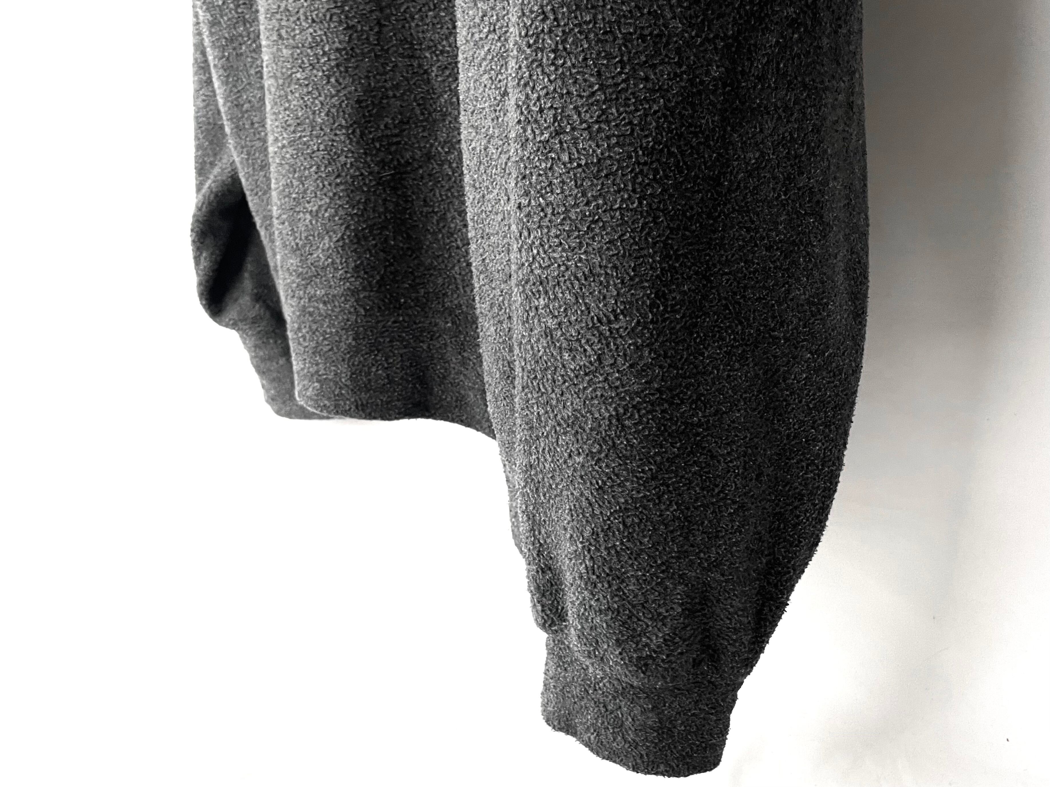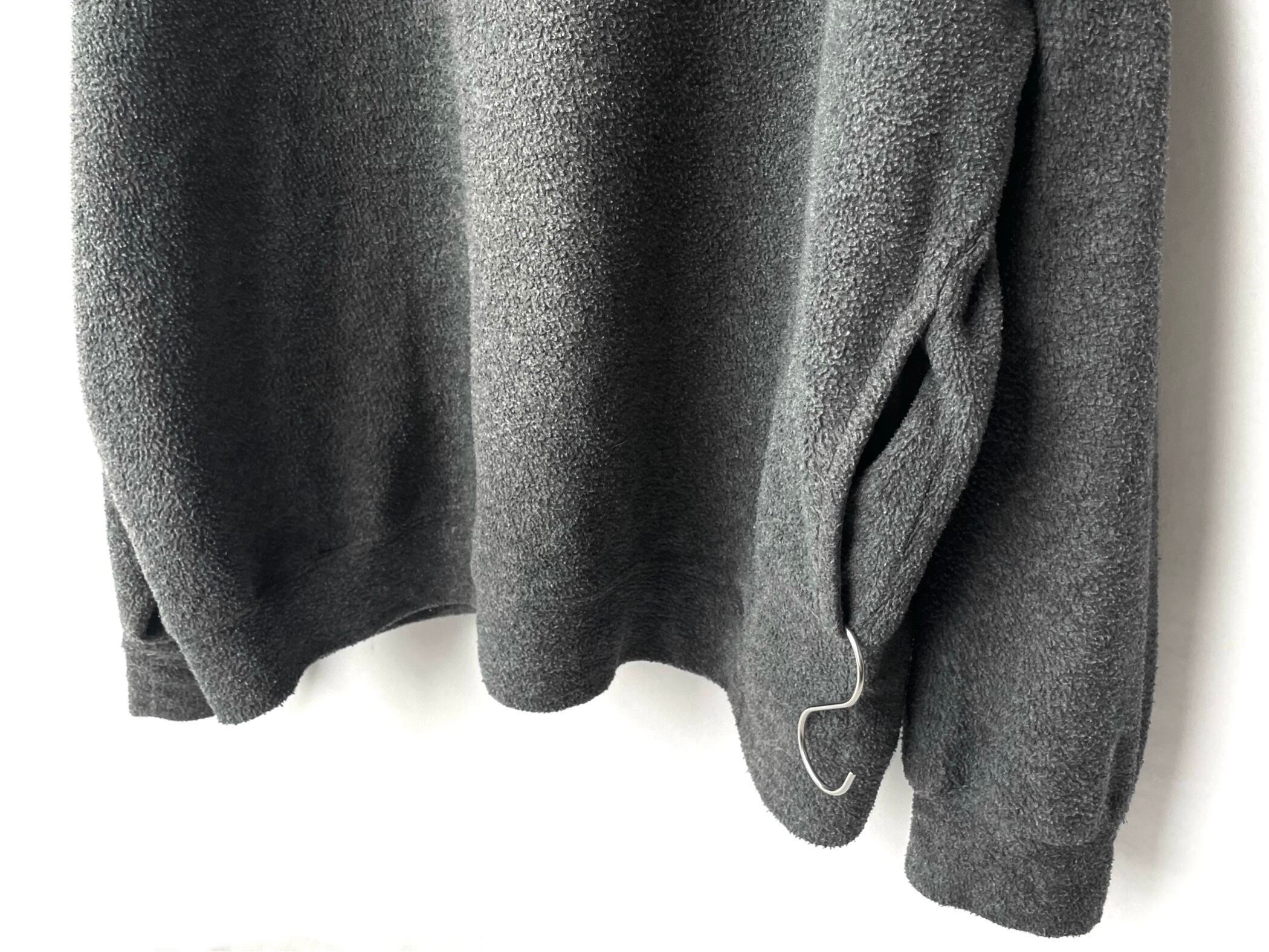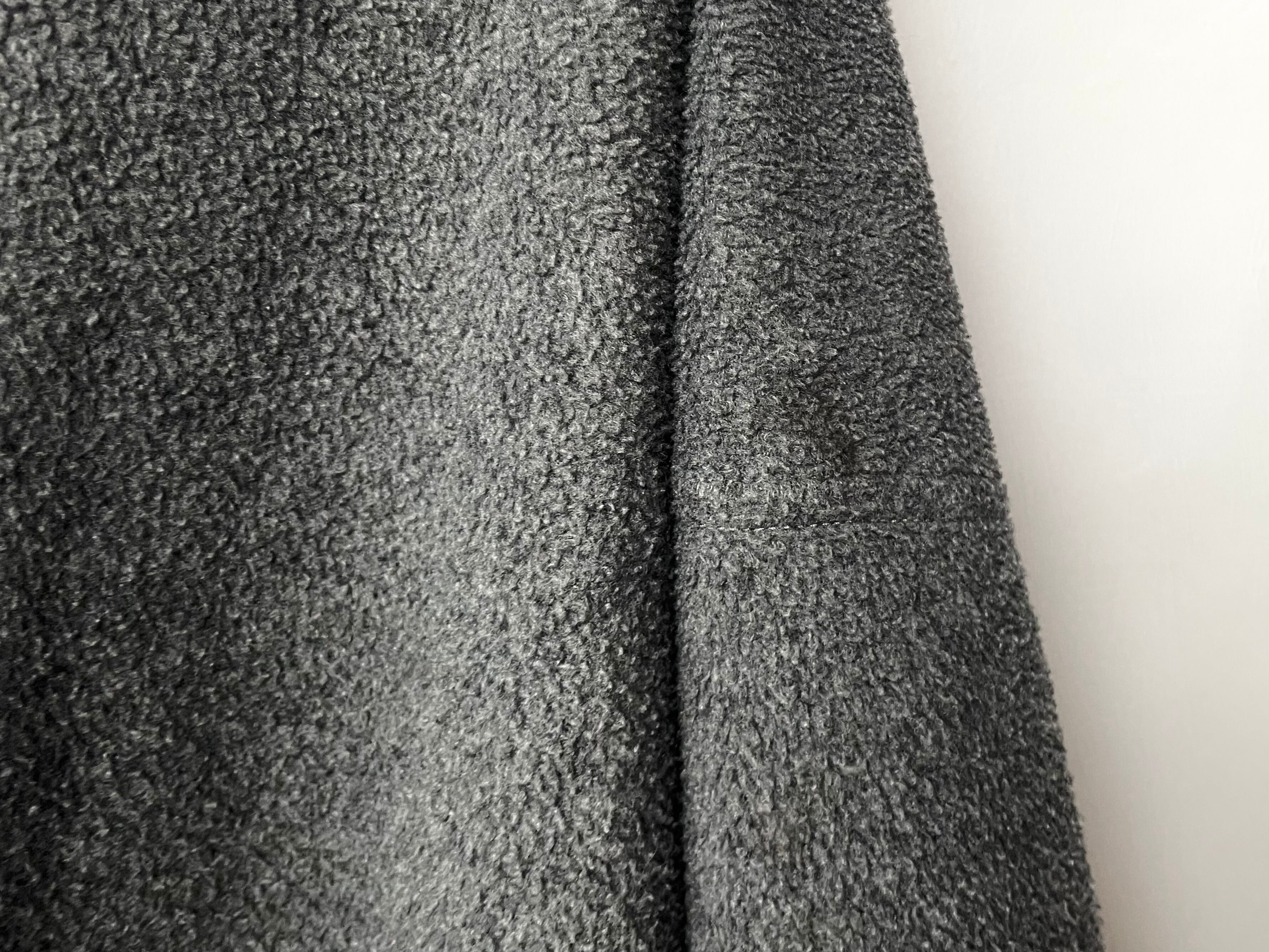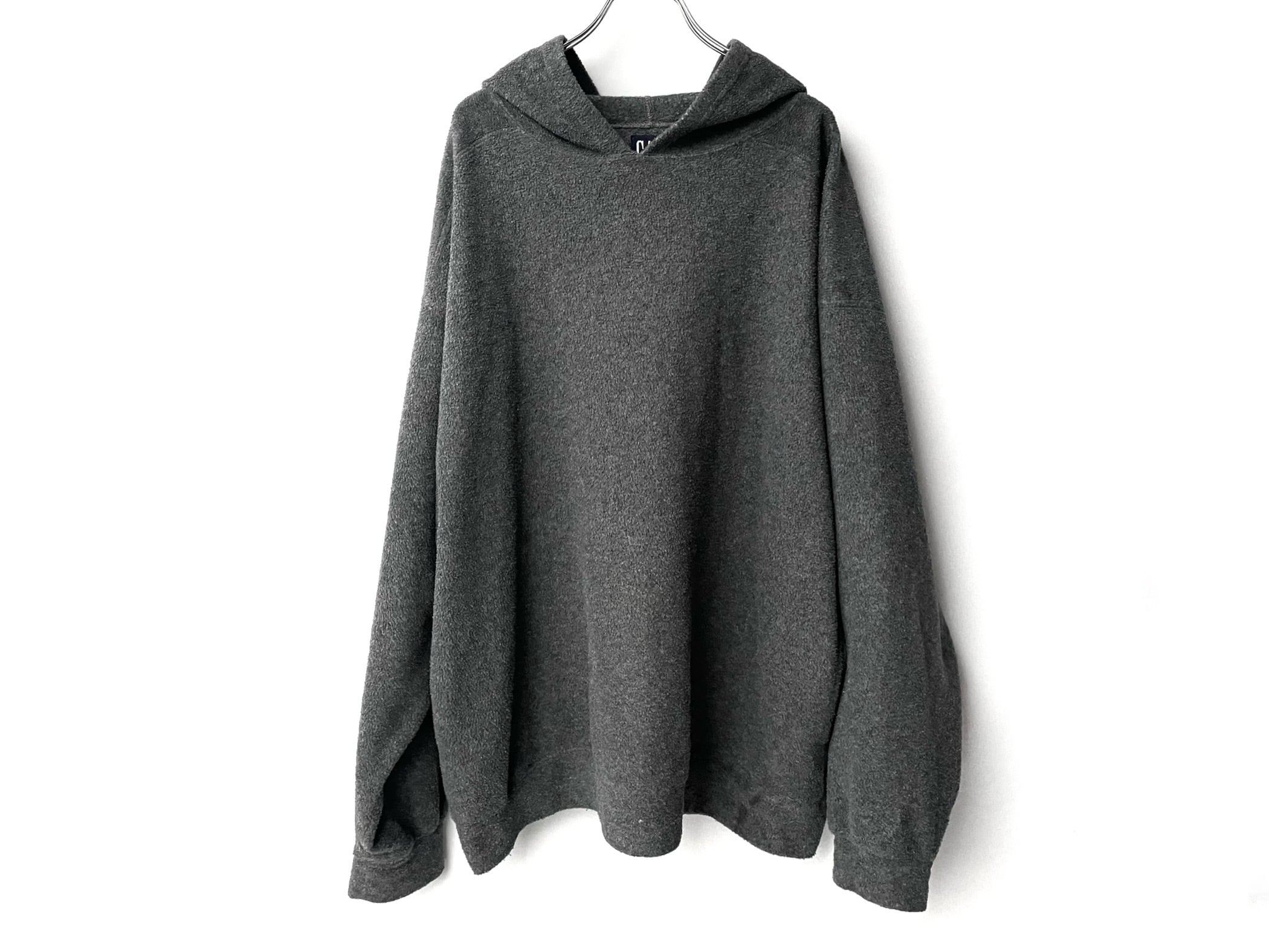 深いグレーの肉厚なフリース生地で仕立てられた、たっぷりワイドシルエットのプルオーバーフーディ。